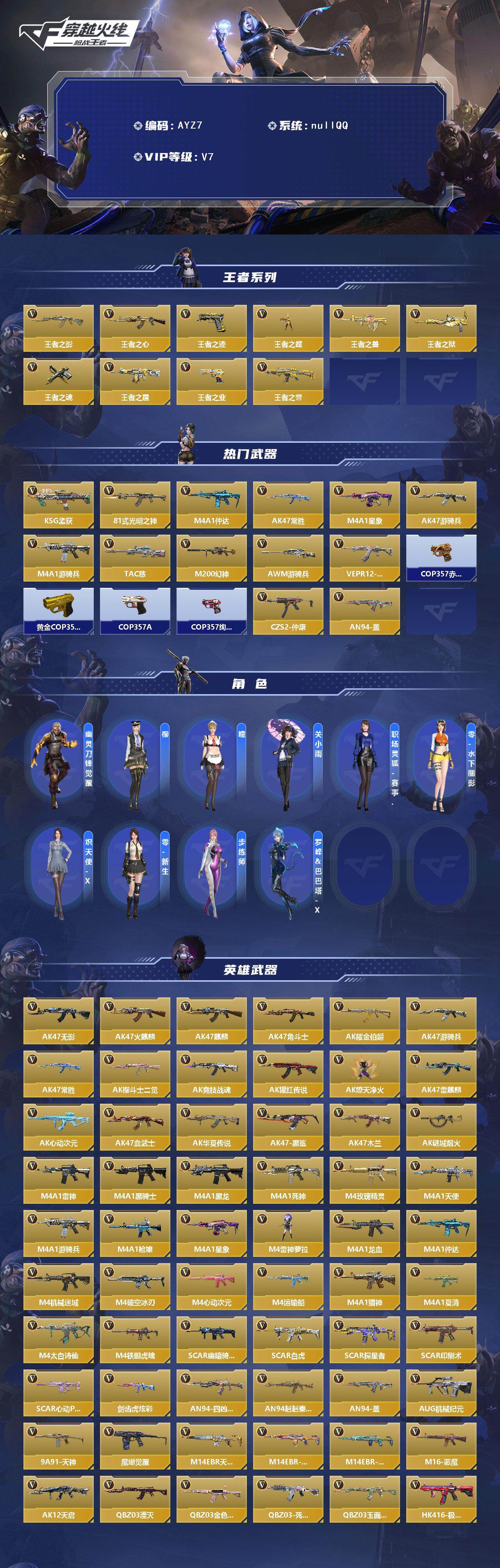 [15570129]10英雄角色数-314英雄武器数 【王者系列】:王者之影,王者之心,王者之迹,王者之蝶,王者之兽,王者之狱,王者之魂,王者之霆,王者之业,王者之誉 【热门武器】:KSG-孟获,81式-光明之神,M4A1-仲达,AK47-常胜,M4A1-星象,AK47-游骑兵,M4A1-游骑兵,TAC-慈,M200-幻神,AWM-游骑兵,VEPR12-宙斯,COP 357-赤龙,黄金COP 357,COP 357-A,COP 357-绚樱*4,CZS2-仲康,AN94-盖 【角色】:幽灵刀锋-觉醒,樱,瞳,关小雨,职场灵狐-赛事经理,零-水下丽影,炽天使-X,零-新生,步练师,罗峰&巴巴塔-X 【英雄武器】:AK47-无影,AK47-火麒麟,AK47-麒麟,AK47-角斗士,AK47-耀金伯爵,AK47-游骑兵,AK47-常胜,AK47-樱斗士-二觉,AK47-竞技战魂,AK47-猩红传说,AK47-燎天净火,AK47-雷麒麟,AK47-心动次元,AK47-血武士,AK47-华夏传说,AK47-黑鲨,AK47-木兰,AK47-谜城烟火*2,M4A1-雷神*2,M4A1-黑骑士,M4A1-黑龙,M4A1-死神*2,M4A1-玫瑰精灵,M4A1-天使,M4A1-游骑兵,M4A1-枪娘,M4A1-星象,M4A1-雷神-萝拉,M4A1-龙血,M4A1-仲达,M4A1-机械迷城,M4A1-破空冰刃,M4A1-心动次元,M4A1-运输船*2,M4A1-猎神,M4A1-夏清,M4A1-太白诗仙*2,M4A1-铁胆虎魄,SCAR-幽暗骑士,SCAR Light-白虎,SCAR-探星者,SCAR-印刷术,SCAR-心动PICK,剑齿虎-炫彩,AN94-四凶觉醒,AN94-赳赳秦师,AN94-盖,AUG-机械纪元,9A91-天神,9A91-魔蜥觉醒,M14EBR-天神,M14EBR-拂影,M14EBR-葫芦山庄*2,M16-恶魔,AK12-天启,QBZ03-湮灭*2,QBZ03-金色蔷薇,QBZ03-死神*2,QBZ03-玉面羞花,HK416-极光,HK417-炎龙铠甲,81式-光明之神,MK47-云舞,G3A3-五色琉璃觉醒,G3A3-衍神兵*2,QBZ97-岚舞,QBZ97-浩瀚征途,QBZ191-金甲虎啸觉醒,QBZ191-封神榜,AWM-天龙,AWM-游骑兵,AWM-指南针,巴雷特-毁灭*2,
