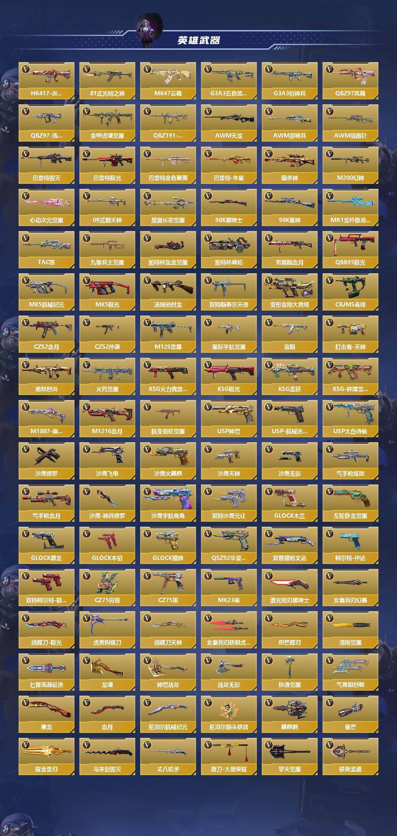 【英雄武器】:AK47-无影,AK47-火麒麟,AK47-麒麟,AK47-角斗士,AK47-耀金伯爵,AK47-游骑兵,AK47-常胜,AK47-樱斗士-二觉,AK47-竞技战魂,AK47-猩红传说,AK47-燎天净火,AK47-雷麒麟,AK47-心动次元,AK47-血武士,AK47-华夏传说,AK47-黑鲨,AK47-木兰,AK47-谜城烟火*2,M4A1-雷神*2,M4A1-黑骑士,M4A1-黑龙,M4A1-死神*2,M4A1-玫瑰精灵,M4A1-天使,M4A1-游骑兵,M4A1-枪娘,M4A1-星象,M4A1-雷神-萝拉,M4A1-龙血,M4A1-仲达,M4A1-机械迷城,M4A1-破空冰刃,M4A1-心动次元,M4A1-运输船*2,M4A1-猎神,M4A1-夏清,M4A1-太白诗仙*2,M4A1-铁胆虎魄,SCAR-幽暗骑士,SCAR Light-白虎,SCAR-探星者,SCAR-印刷术,SCAR-心动PICK,剑齿虎-炫彩,AN94-四凶觉醒,AN94-赳赳秦师,AN94-盖,AUG-机械纪元,9A91-天神,9A91-魔蜥觉醒,M14EBR-天神,M14EBR-拂影,M14EBR-葫芦山庄*2,M16-恶魔,AK12-天启,QBZ03-湮灭*2,QBZ03-金色蔷薇,QBZ03-死神*2,QBZ03-玉面羞花,HK416-极光,HK417-炎龙铠甲,81式-光明之神,MK47-云舞,G3A3-五色琉璃觉醒,G3A3-衍神兵*2,QBZ97-岚舞,QBZ97-浩瀚征途,QBZ191-金甲虎啸觉醒,QBZ191-封神榜,AWM-天龙,AWM-游骑兵,AWM-指南针,巴雷特-毁灭*2,