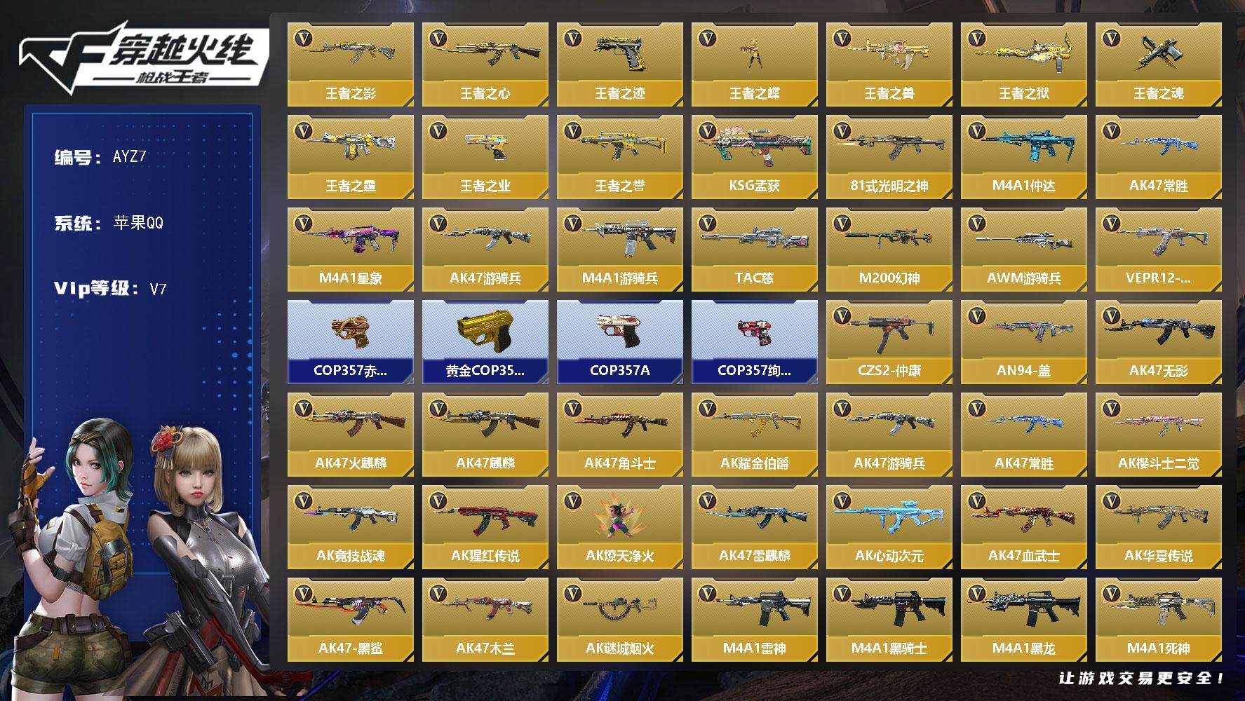 - [14664902]77V/102级/荣耀元首/14王者/3炫金/7英雄/QBZ03-金色蔷薇/Scar Light-白虎/M200-幻神/QBZ-03-王者蔷薇/死亡之眼/牛牛-AK47/M4A1-黑骑士/汤姆逊-烈龙/RPK-盘龙/加特林-炼狱/斯泰尔蝴蝶/COP-白鲨/COP 357-幻灵/沙鹰-修罗/金刚伞/蝴蝶斯泰尔+6烈龙/悦蓝-惊涛骇浪/炫金千变/炫金雷神/炫金黑武士/炼狱-百战金芒-庆典舞曲音效卡/死神-雪域霜狐-怀旧音效卡/雷神-耀金皮肤/M4A1-再燃火线/火麒麟-雷神/火麒麟-轻羽皮肤/火麒麟-平天大圣/毁灭-暗月/毁灭耀金皮肤/毁灭-英雄计划 皮肤/M4A1-千变-孔明皮肤/黑龙-能量核心/无影-能量核心/极光-能量核心/修罗-能量核心/轻型军用手斧-再燃火线/零/葵/樱/瞳/审判者/战地猎狐/王者-魅影/雪域霜狐/奇洋探员/乔伊教练/云海玲珑/暗夜-X/初恋灵狐/电竞少女/风暴女/嘉年华灵狐/娟娟/零-水下丽影/灵狐者-X/灵狐者-职业经理/曼陀罗-X/潘多拉-X/潘多拉-甜心教官/斯沃特-X/铁骑荣耀/维纳斯/新娜塔莎/天龙-曼陀罗/M4A1-雷神-精英刀锋/巴雷特-零-水下丽影/AWM-灵狐-15周年嘉年华/迷你波特博士/迷你火种/迷你生化手雷/生化手雷-机甲核心/6烈龙/6盘龙/冰龙粉碎者-白马银枪/激光毁灭者III-白马银枪/机甲撕裂者/KAC-圣炎切割者/M4A1-千变/AK47-火麒麟/AK47-麒麟/M4A1-黑龙/M4A1-雷神/AK47-无影/M4A1-死神/AK47-黑武士/AK12-天启/AN94-超新星/M4A1-武圣/AK47-机械迷城/无影-神兵利器/M4A1-玫瑰精灵/M4A1-猎神/王者之心-觉醒版/王者之武-觉醒版/王者之势-觉醒版/王者冰魄-觉醒版/王者炎心-觉醒版/王者火魄-觉醒版/黑骑士-海王/王者猎神-觉醒版/AWM-天龙/Barrett-毁灭/Barrett-极光/AWM-裁决/王者之光-觉醒版/王者之决-觉醒版/炼狱-百战金芒/AA-12-雷霆/沙鹰-天神/柯尔特-电竞装甲/Glock18-武圣/屠龙/龙啸/擎天/麒麟刺/幻灵之锋/麒麟刺-百战金芒/王者之锋-觉醒版/高爆手雷-幻灵/闪光弹-幻灵/烟雾弹-幻灵/BS战队炫彩背包/云山科技背包/奇洋探员-海龟背包/炫彩背包-诺拉/炫彩背包/百战金芒炫彩背包/雪域霜狐