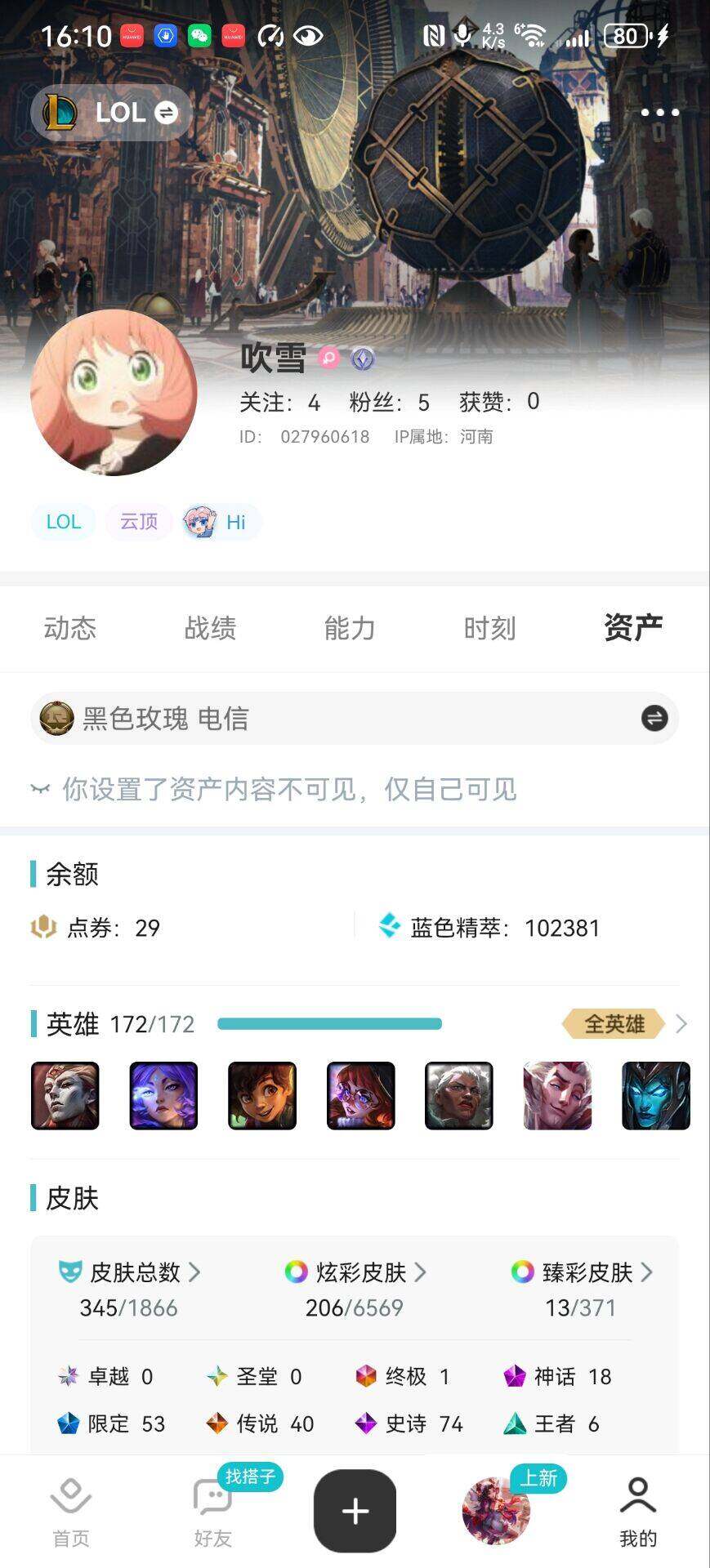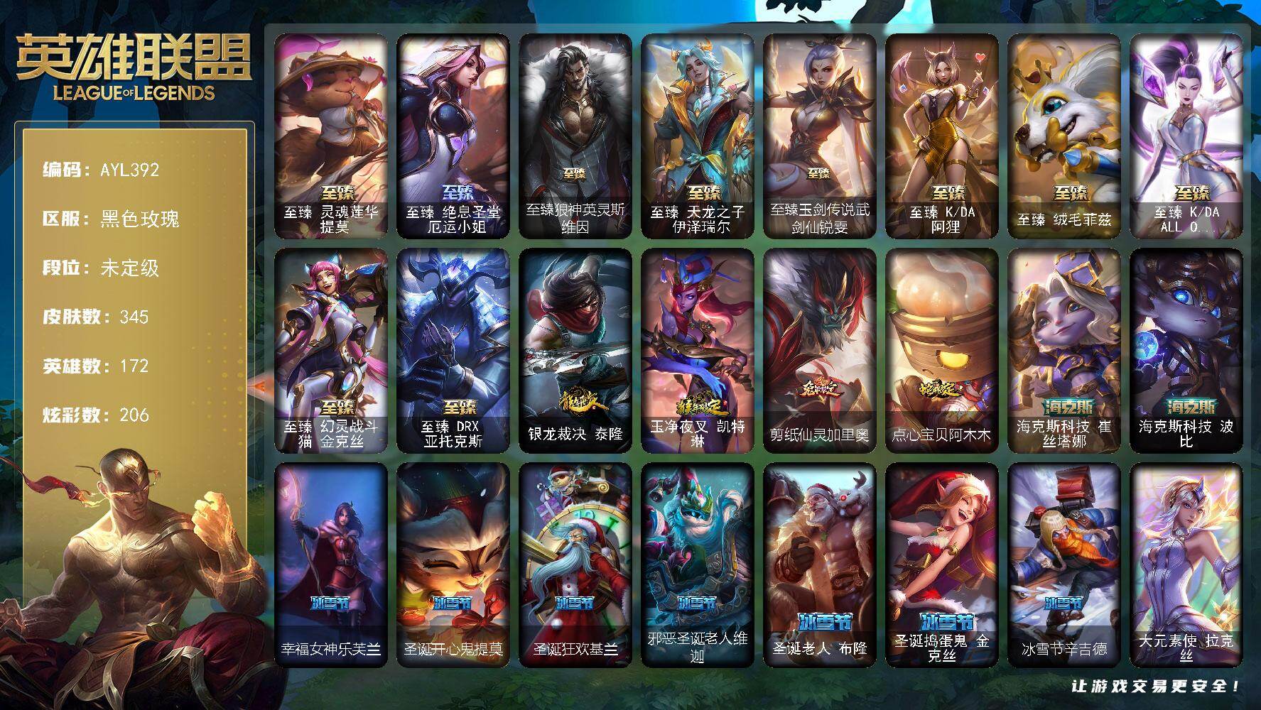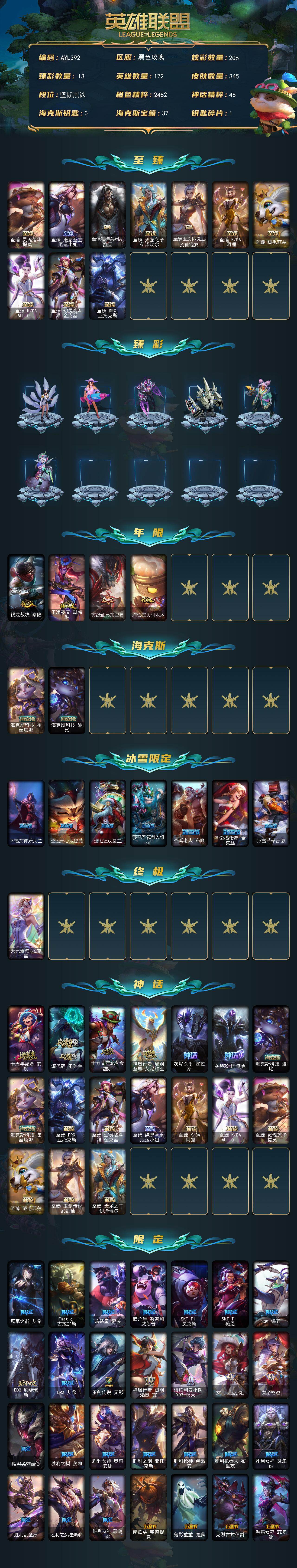 [15572293]【特价出售/店主推荐】未定级段位-172英雄-345皮肤-206炫彩-1终极-18神话-53限定-40传说-74史诗