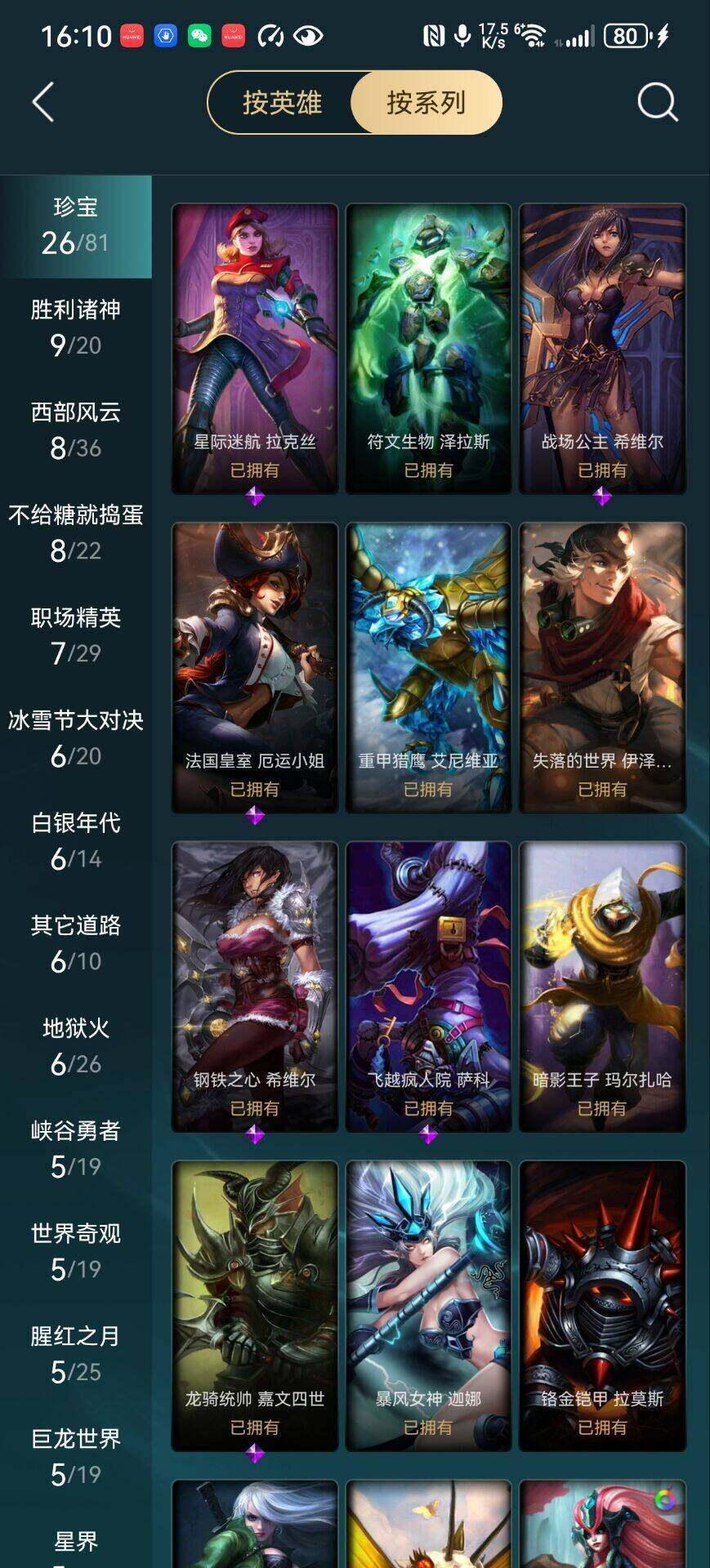 【臻彩皮肤】:天龙之子卡莎飞龙乘云,偶像歌手阿狸极地雪莲,泳池派对凯特琳粉红冰川,花仙子拉克丝纹白,天煞劫恒星游历者,星之守护者娑娜未来之光,霸天巨兽雪崩墨菲特,玉剑传说神机花火青竹,魔女阿卡丽虚荣,净雪之月莫甘娜冬虹