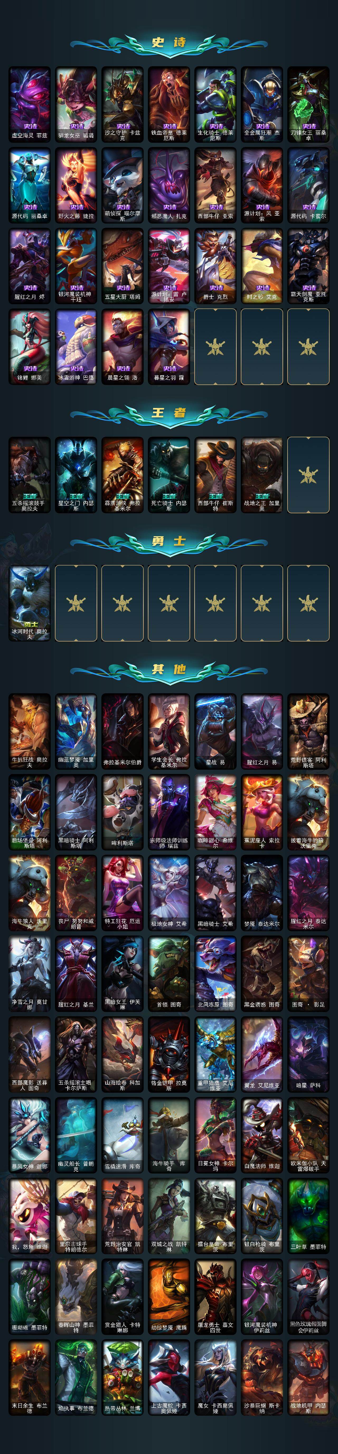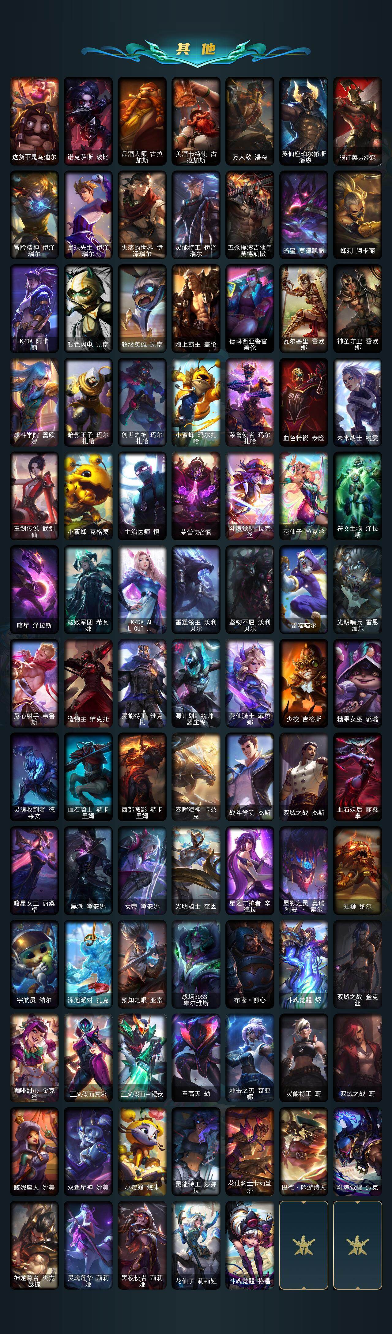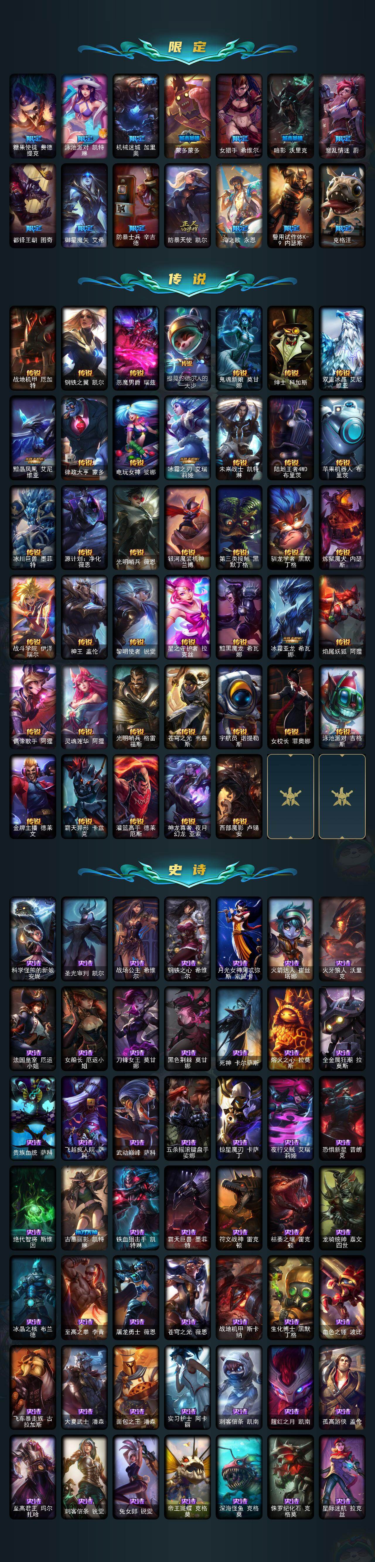 【限定皮肤】:冠军之箭艾希,Fnatic古拉加斯,暗杀星蒙多,暗杀星努努和威朗普,SKTT1贾克斯,SKTT1薇恩,SSW锤石,EDG厄斐琉斯,DRX艾希,玉剑传说无影,神凰行者烈羽焰凰霞,海珀利安小队Y03权天使卡蜜尔,女帝厄运小姐,女帝格温,暗裔英雄盖伦,胜利之树茂凯,胜利女神奥莉安娜,胜利之剑亚托克斯,胜利枪神卢锡安,胜利机器人布里茨,胜利女神瑟庄妮,胜利剑圣易,胜利之运崔斯特,胜利女神菲奥娜,南瓜头费德提克,鬼影重重魔腾,克烈古拉伯爵,魅惑女巫菲奥娜,糖果使徒费德提克,泳池派对凯特琳,机械迷城加里奥,蒙多蒙多,女猎手希维尔,暗影沃里克,意乱情迷蔚,都铎王朝图奇,御星魔矢艾希,防暴士兵辛吉德,防暴天使凯尔,海之歌永恩,警用试作体K9内瑟斯,克格汪