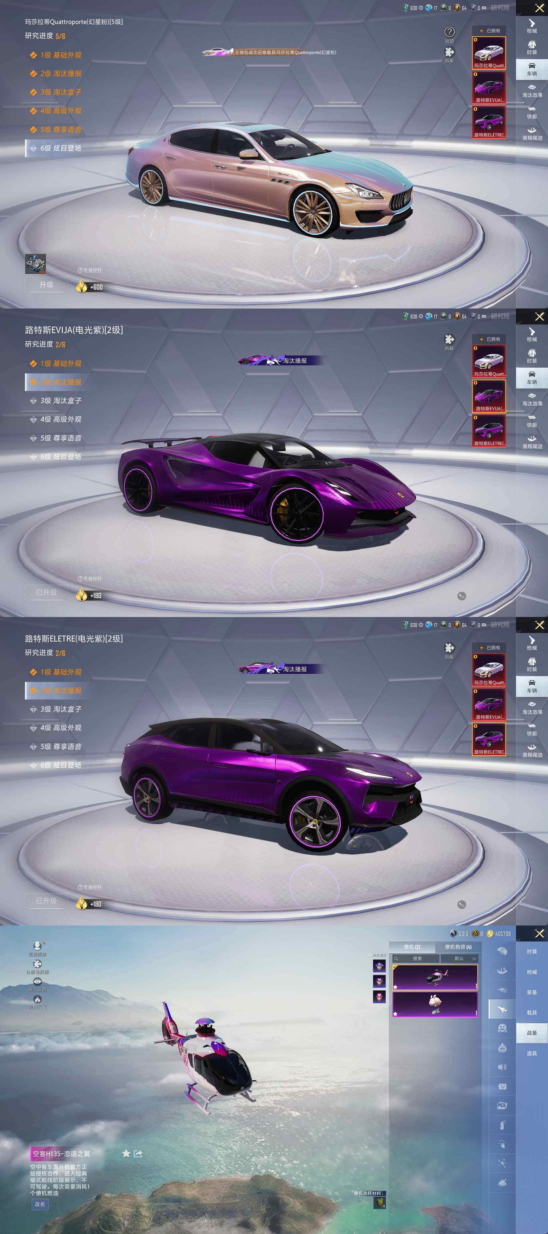 【红色载具】:路特斯ELETRE(电光紫)(二级),路特斯EVIJA(电光紫)(二级),玛莎拉蒂Quattroporte(幻星粉)(五级)