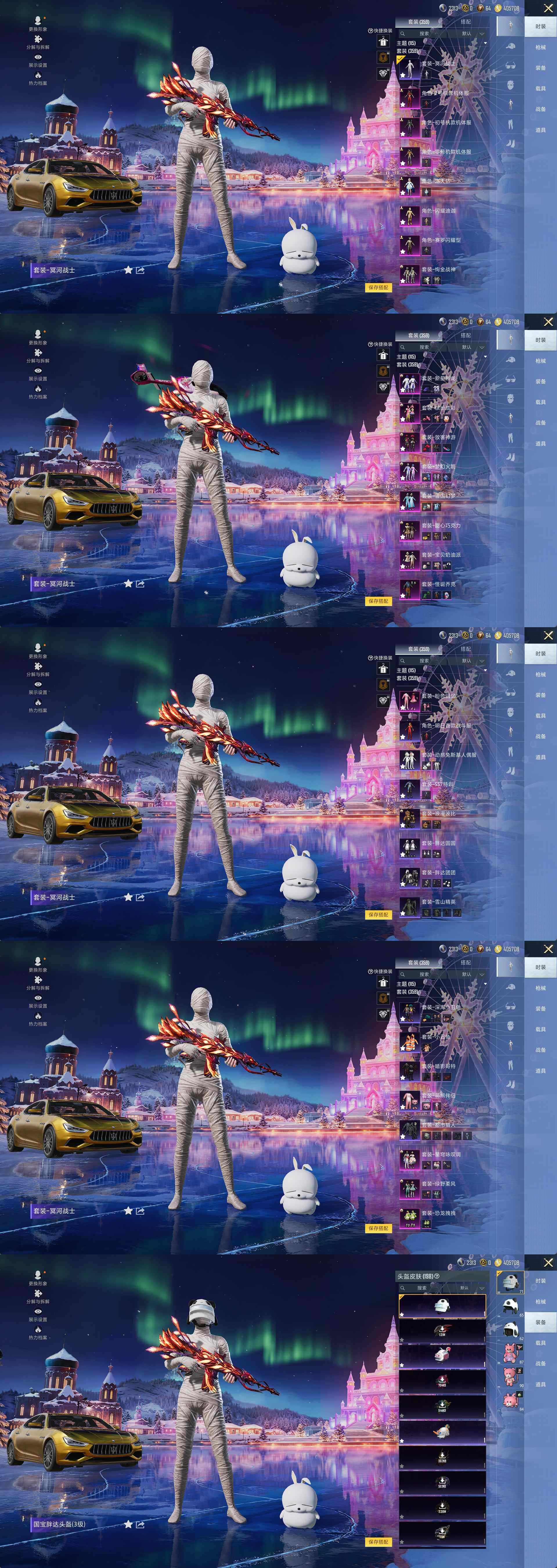 AKM-甜心宝贝,AKM-炫紫旋律,AKM-梦之光华,M16A4-葫芦兄弟,SCAR-L-梦幻火箭,SCAR-L-童趣迷兔,SCAR-L-青春物语,M416-五爪金龙,M416-心之恋语,M416-风花雪月,GROZA-香水柠檬,AUG-星之彼岸,M762-甜蜜誓约,UMP45-相思残雪,UMP45-恐龙拽拽,汤姆逊-怪笑疯兔,Kar98K-巳巳如意,AWM-花间之火,VSS-烈焰拳霸,Mini14-荧光虫舞,SLR-暗夜玫瑰,M249-蓝莓炮弹,平底锅-林间仙鹿