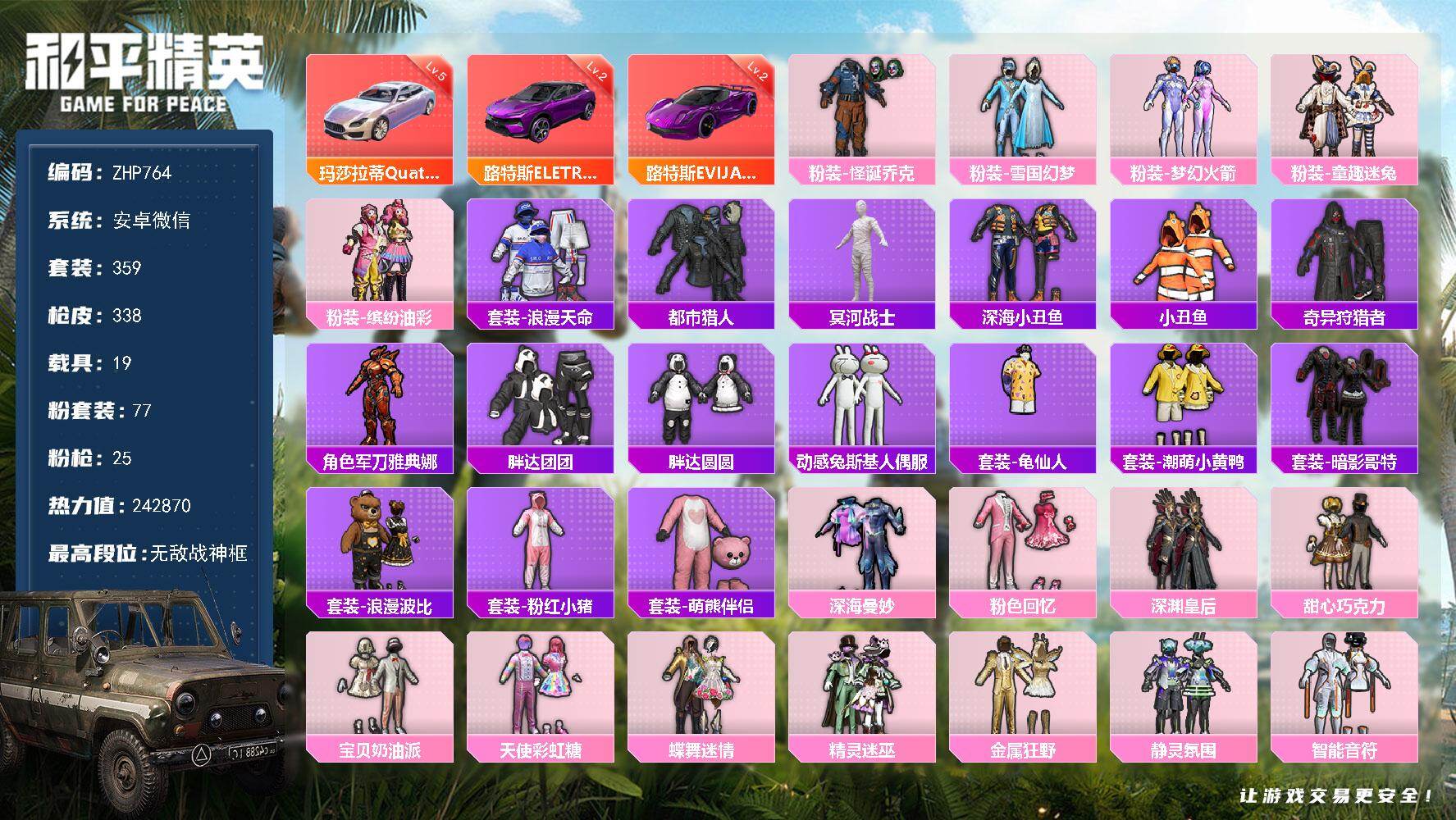 [15572557]背包枪械材料多!9个车辆升级徽章!11个三币车安卓 微信-无敌战神框-77粉装-25特效枪-19载具-16粉色飞行器-242870热力值-20王牌印记-359套装-338枪皮