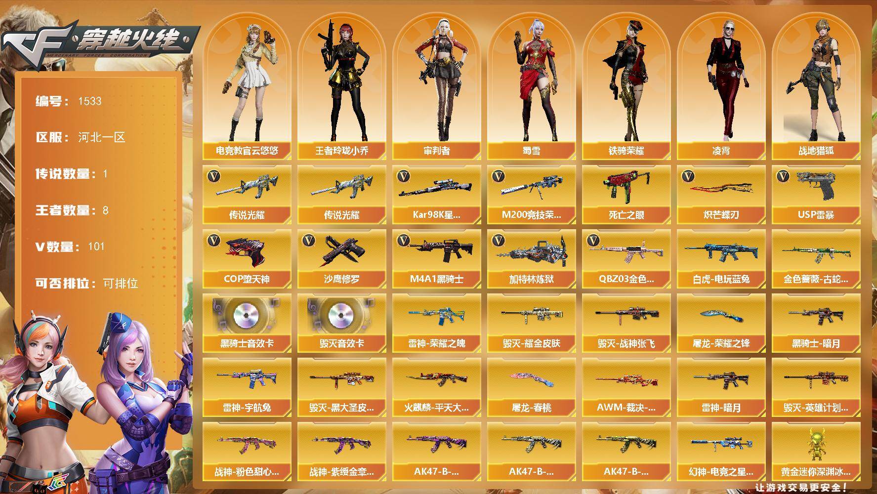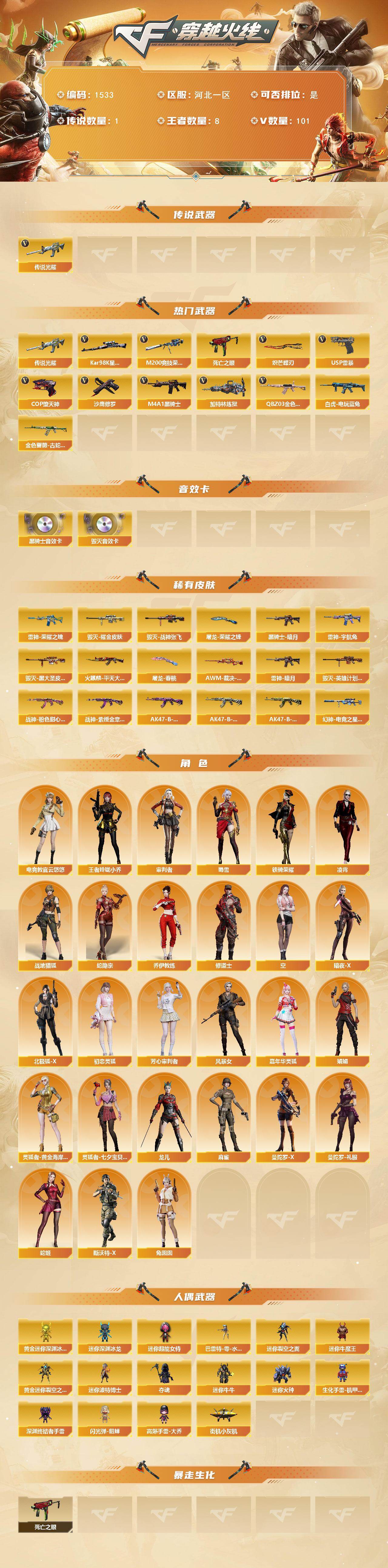 [15572760]河北一区-101V-8王者-0炫金 【传说武器】:传说光耀 【热门武器】:传说光耀,QBZ03-金色蔷薇,金色蔷薇-古蛇迷踪,M200-竞技荣光,死亡之眼,白虎-电玩蓝兔,Kar98K-星神,M4A1-黑骑士,加特林-炼狱,USP-雷暴,COP-堕天神*2,沙鹰-修罗,炽芒蝶刃 【音效卡】:M4A1-黑骑士音效卡,Barrett-毁灭音效卡 【皮肤】:幻神-电竞之星 皮肤,AWM-裁决-凤灵皮肤,雷神-暗月*2,雷神-荣耀之魄,雷神-宇航兔皮肤,火麒麟-平天大圣,毁灭耀金皮肤,毁灭-战神张飞,毁灭-黑大圣皮肤*2,毁灭-英雄计划 皮肤,黑骑士-暗月,战神-粉色甜心皮肤,战神-紫绶金章皮肤*3,AK47-B-常胜将军-曹操,AK47-B-常胜将军-刘备,AK47-B-常胜将军-孙权,屠龙-荣耀之锋,屠龙-春桃 皮肤 【角色】:凌霄,电竞教官-云悠悠,审判者,战地猎狐,王者玲珑-小乔,蛇隐宗,乔伊教练,修道士,空,暗夜-X,北极狐-X,初恋灵狐,芳心审判者,风暴女,嘉年华灵狐,娟娟,灵狐者-黄金海岸,灵狐者-七夕宝贝,龙儿,麻雀,曼陀罗-X,曼陀罗-礼服,蛇姬,斯沃特-X,蜀雪,铁骑荣耀,兔囡囡 【人偶武器】:巴雷特-零-水下丽影*2,街机小灰机,黄金迷你深渊冰龙,迷你深渊冰龙*2,迷你裂空之翼*5,迷你牛魔王,黄金迷你裂空之翼,迷你波特博士*6,夺魂*4,迷你牛牛,迷你火种*2,生化手雷-机甲核心,深渊终结者手雷*2,闪光弹-貂蝉,高爆手雷-大乔,迷你超能女侍 【暴走生化】:死亡之眼 【挑战大师】:冰龙粉碎者-白马银枪*3,激光毁灭者III,机甲撕裂者III,试炼破坏者III,神圣爆裂者-末日III,阐释者III 【英雄级武器】:AK47-火麒麟,M4A1-黑龙,M4A1-雷神*3,M4A1-黑骑士,AK47-黑武士,AK12-天启,M4A1-堕天神,M4A1-夜魔,金色蔷薇-古蛇迷踪,FAMAS G2-天戎,QBZ03-金色蔷薇,王者之心-觉醒版,AK-47-猩红传说,AK47-B-战神,王者炎心-觉醒版,黑骑士-海王*2,AK47-B-常胜将军,白虎-电玩蓝兔,黑武士-CF网剧冠军,加利尔ACE-天袭,Barrett-毁灭,AWM-裁决,Kar98K-星神,M200-竞技荣光,王者之力-觉醒版,王者幻神-觉醒版,加特林-炼狱,王者之霆-觉醒版,沙鹰-修罗,USP