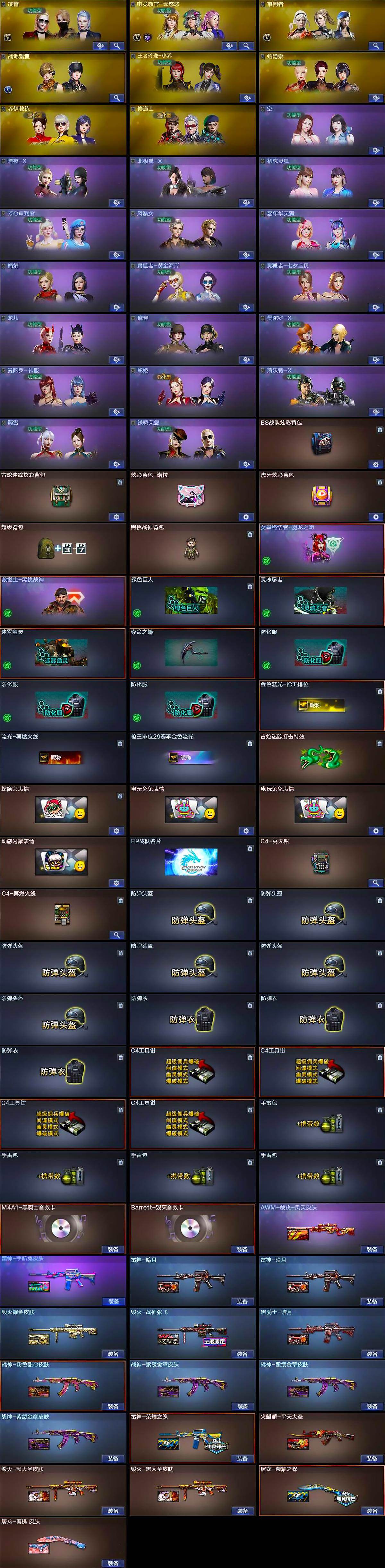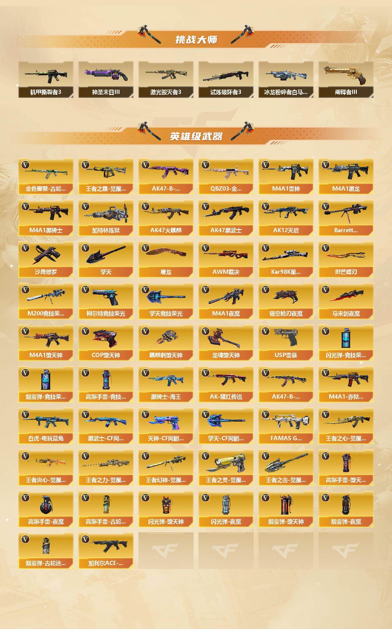 【英雄级武器】:AK47-火麒麟,M4A1-黑龙,M4A1-雷神*3,M4A1-黑骑士,AK47-黑武士,AK12-天启,M4A1-堕天神,M4A1-夜魔,金色蔷薇-古蛇迷踪,FAMAS G2-天戎,QBZ03-金色蔷薇,王者之心-觉醒版,AK-47-猩红传说,AK47-B-战神,王者炎心-觉醒版,黑骑士-海王*2,AK47-B-常胜将军,白虎-电玩蓝兔,黑武士-CF网剧冠军,加利尔ACE-天袭,Barrett-毁灭,AWM-裁决,Kar98K-星神,M200-竞技荣光,王者之力-觉醒版,王者幻神-觉醒版,加特林-炼狱,王者之霆-觉醒版,沙鹰-修罗,USP