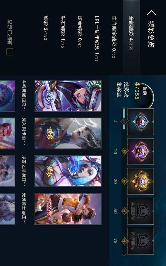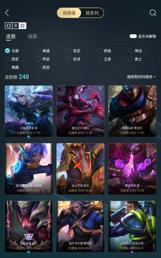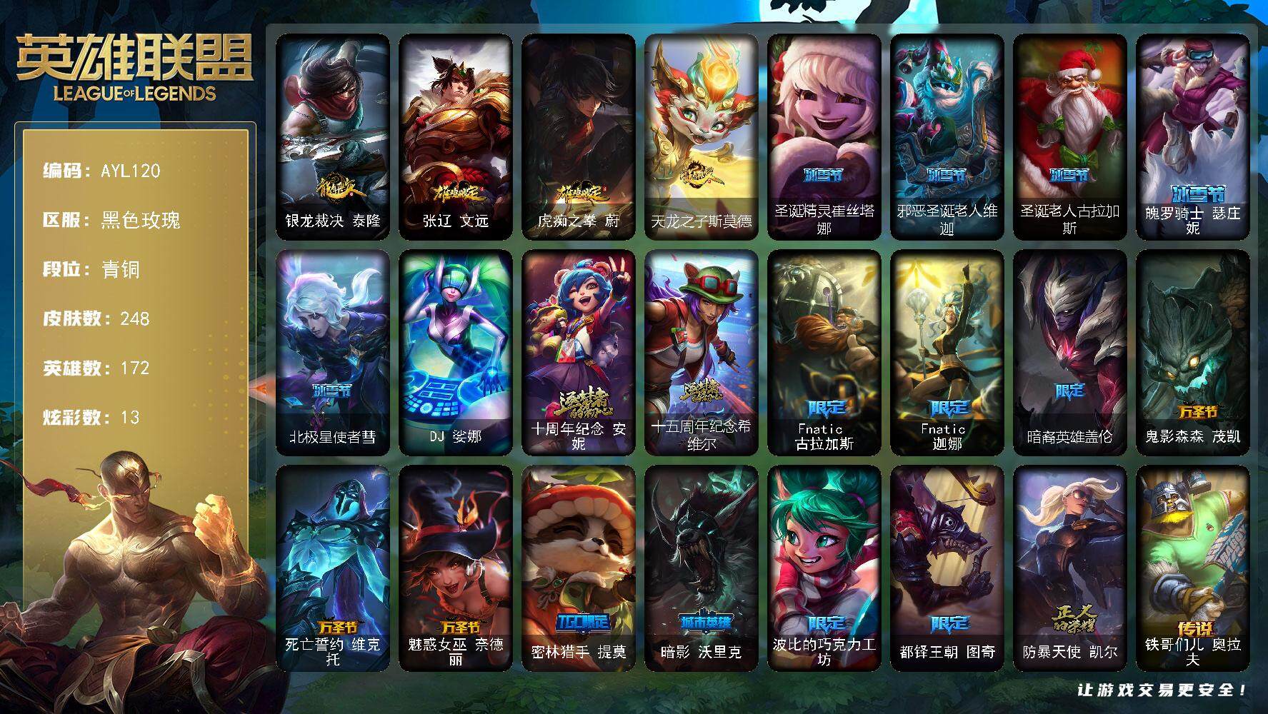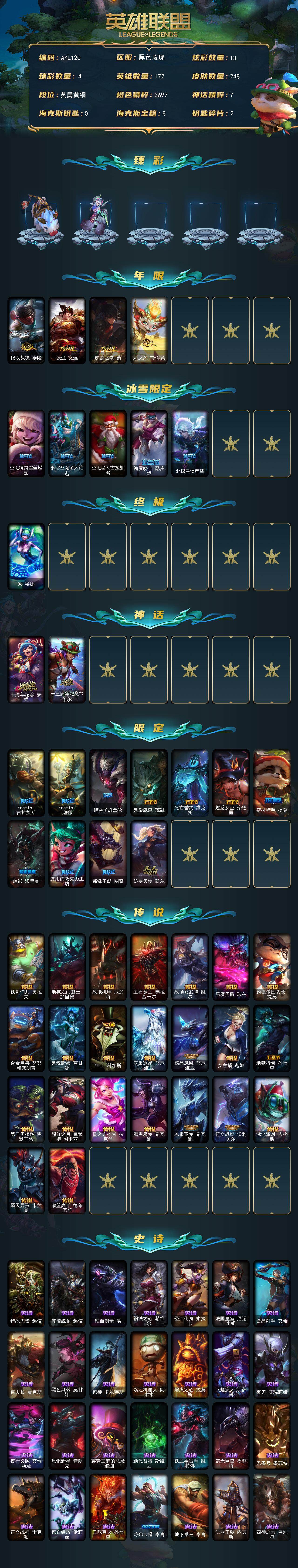 青铜段位-172英雄-248皮肤-13炫彩-1终极-2神话-20限定-23传说-60史诗