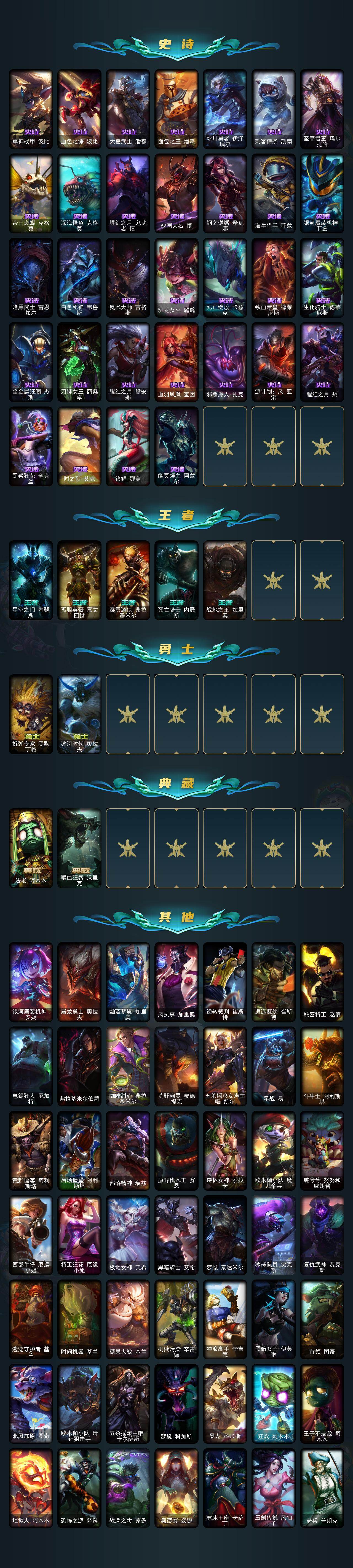 【史诗皮肤】:特战先锋赵信,翼骑统领赵信,铁血剑豪易,钢铁之心希维尔,圣洁化身索拉卡,法国皇室厄运小姐,紫晶射手艾希,百夫长贾克斯,黑色荆棘莫甘娜,死神卡尔萨斯,殇之机器人阿木木,熔火之心拉莫斯,飞越疯人院萨科,夜刃艾瑞莉娅,夜行义贼艾瑞莉娅,恐惧新星普朗克,穿着正装的恶魔维迦,绝代智将斯维因,铁血狙击手凯特琳,霸天巨兽墨菲特,无畏号墨菲特,符文战神雷克顿,死亡绽放伊莉丝,三昧真火孙悟空,防弹武僧李青,地下拳王李青,法老王朝内瑟斯,四神之力乌迪尔,军神战甲波比,血色之锤波比,大夏武士潘森,面包之王潘森,冰川勇者伊泽瑞尔,刺客信条凯南,至高君王玛尔扎哈,帝王斑蝶克格莫,深海怪鱼克格莫,腥红之月鬼武者慎,战国大名慎,钢之逆鳞希瓦娜,海牛猎手菲兹,银河魔装机神菲兹,暗黑武士雷恩加尔,白色死神韦鲁斯,奥术大师吉格斯,驯龙女巫璐璐,死亡绽放卡兹克,铁血帝皇德莱厄斯,生化骑士德莱厄斯,全金属狂潮杰斯,刀锋女王丽桑卓,腥红之月黛安娜,血羽凤凰奎因,邪恶魔人扎克,源计划风亚索,腥红之月烬,黑帮狂花金克丝,时之砂艾克,锦鲤娜美,幽冥领主阿兹尔