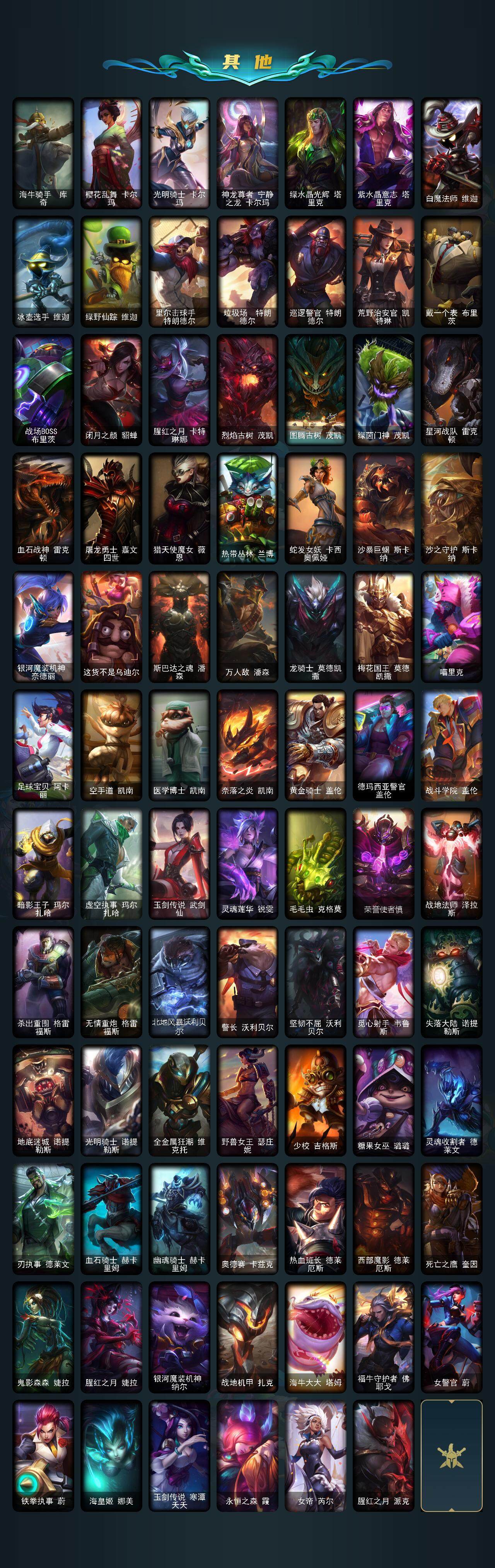【传说皮肤】:铁哥们儿奥拉夫,地狱之门卫士加里奥,战地机甲厄加特,血石领主弗拉基米尔,战场女武神凯尔,恶魔男爵瑞兹,约德尔国队长提莫,合金巨兽努努和威朗普,鬼魂新娘莫甘娜,绅士科加斯,双重冰晶艾尼维亚,黯晶凤凰艾尼维亚,女主播迦娜,地狱行者孙悟空,第三类接触黑默丁格,腥红之月鬼武姬阿卡丽,星之守护者拉克丝,黯黑魔龙希瓦娜,冰霜亚龙希瓦娜,符文战熊沃利贝尔,泳池派对吉格斯,霸天异形卡兹克,灌篮高手德莱厄斯