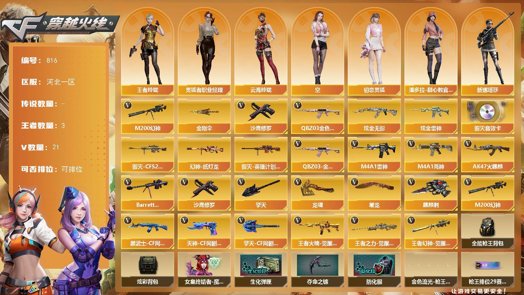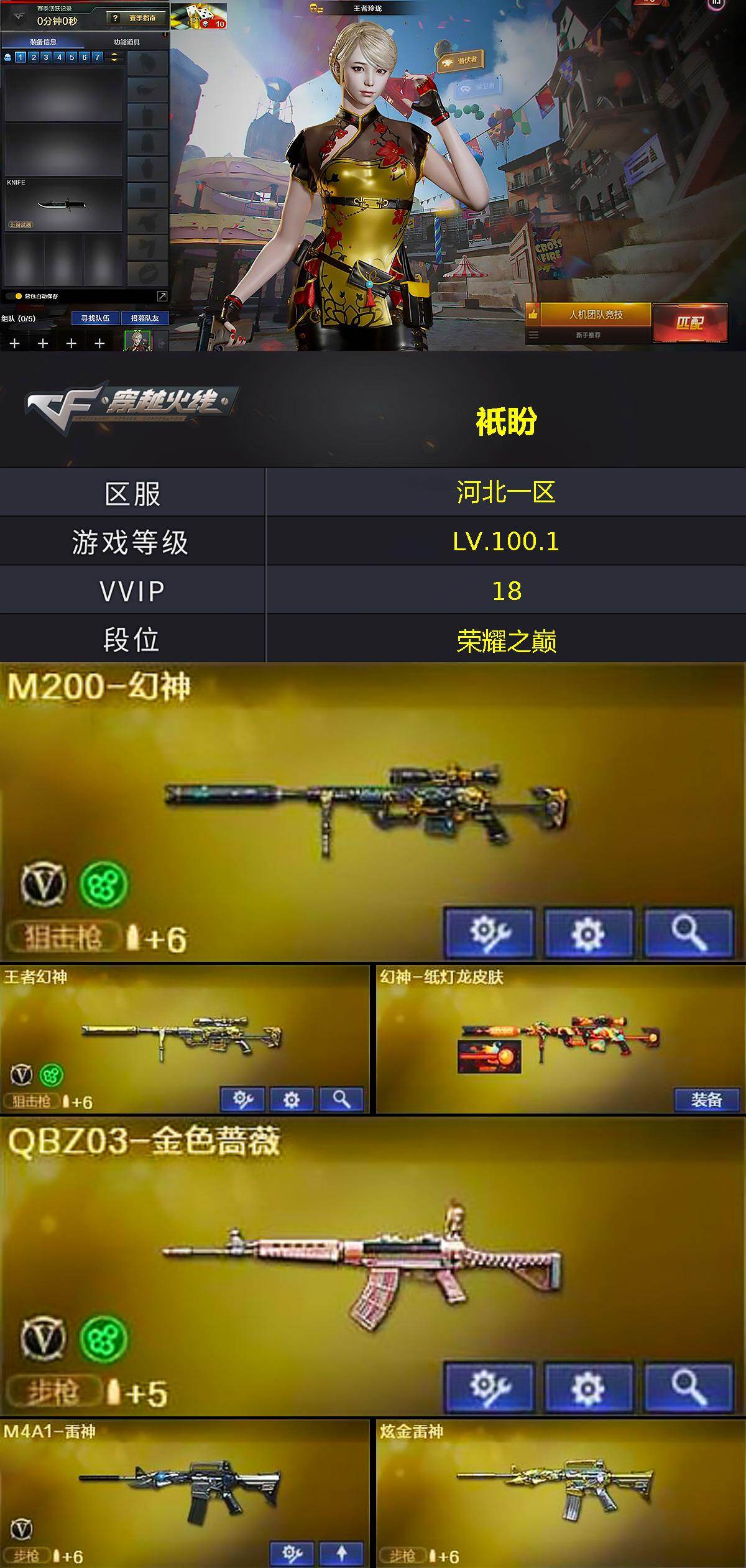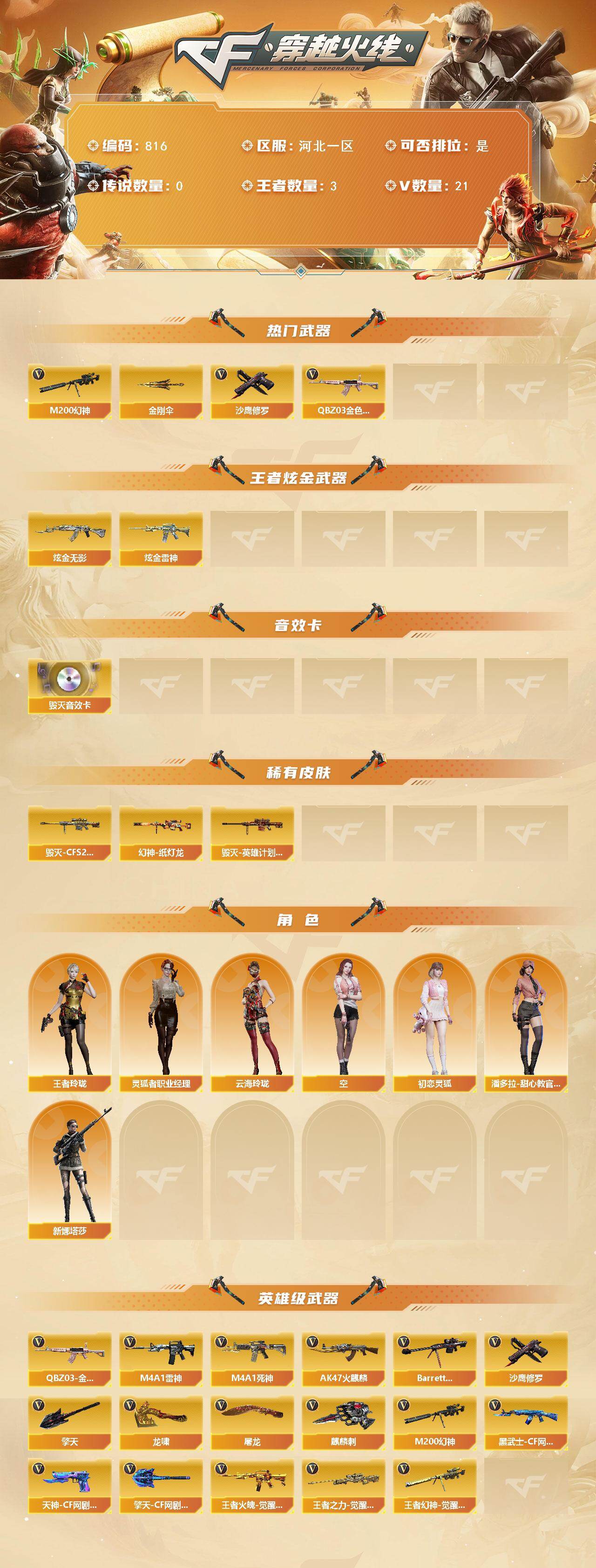 [15573184]河北一区-21V-3王者-2炫金 【热门武器】:QBZ03-金色蔷薇,M200-幻神,沙鹰-修罗,金刚伞 【王者炫金武器】:炫金无影,炫金雷神 【音效卡】:Barrett-毁灭音效卡 【皮肤】:幻神-纸灯龙皮肤,毁灭-CFS2020,毁灭-英雄计划 皮肤 【角色】:王者玲珑,云海玲珑,空,初恋灵狐,灵狐者-职业经理,潘多拉-甜心教官,新娜塔莎 【英雄级武器】:AK47-火麒麟,M4A1-雷神,M4A1-死神,QBZ03-金色蔷薇,王者火魄-觉醒版,黑武士-CF网剧冠军,Barrett-毁灭,M200-幻神,王者之力-觉醒版,王者幻神-觉醒版,沙鹰-修罗,天神-CF网剧冠军,屠龙*2,龙啸,擎天,麒麟刺,擎天-CF网剧冠军 【道具】:全能枪王背包,炫彩背包,哔哩哔哩名片,女皇终结者-魔龙之吻,生化弹匣,夺命之镰,防化服,金色流光-枪王排位*2,枪王排位29赛季金色流光,防弹头盔*2,防弹衣*3,C4工具钳*2,手雷包*2 【特殊枪械】: