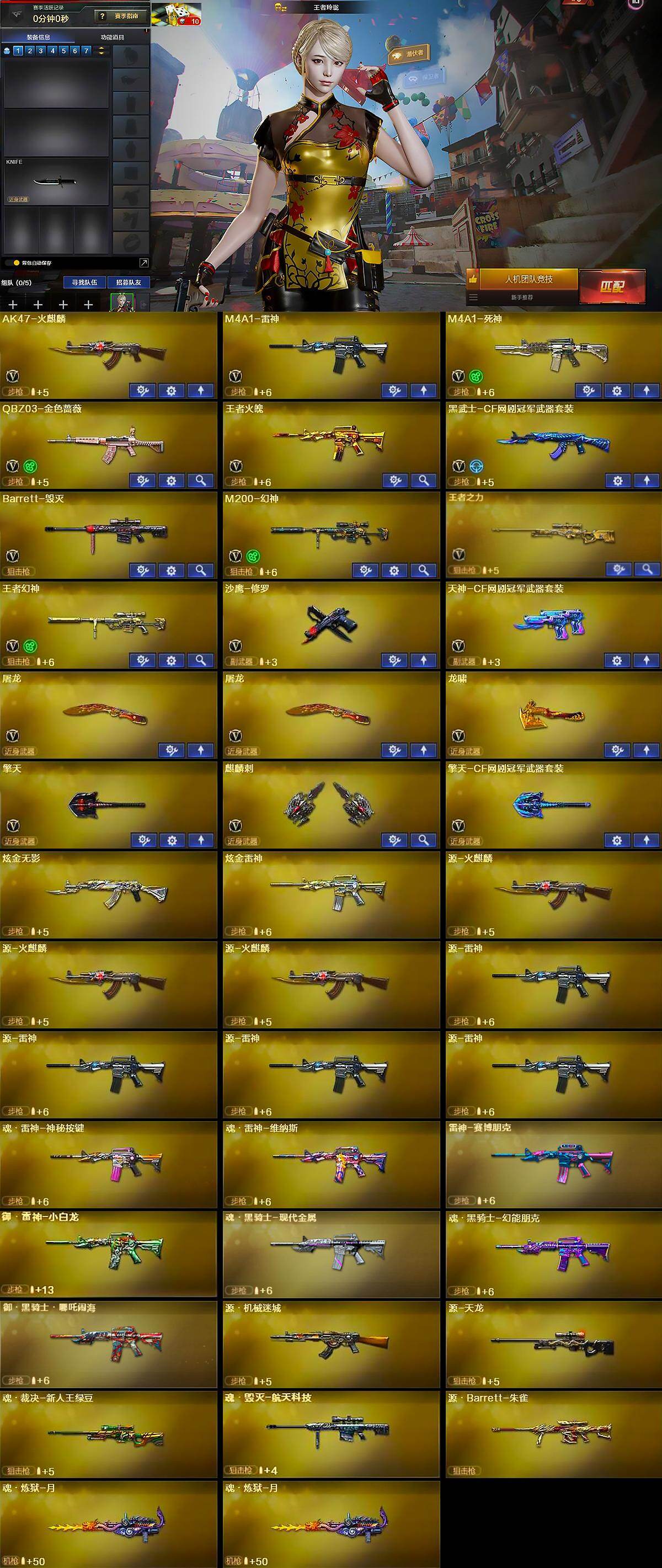 【英雄级武器】:AK47-火麒麟,M4A1-雷神,M4A1-死神,QBZ03-金色蔷薇,王者火魄-觉醒版,黑武士-CF网剧冠军,Barrett-毁灭,M200-幻神,王者之力-觉醒版,王者幻神-觉醒版,沙鹰-修罗,天神-CF网剧冠军,屠龙*2,龙啸,擎天,麒麟刺,擎天-CF网剧冠军