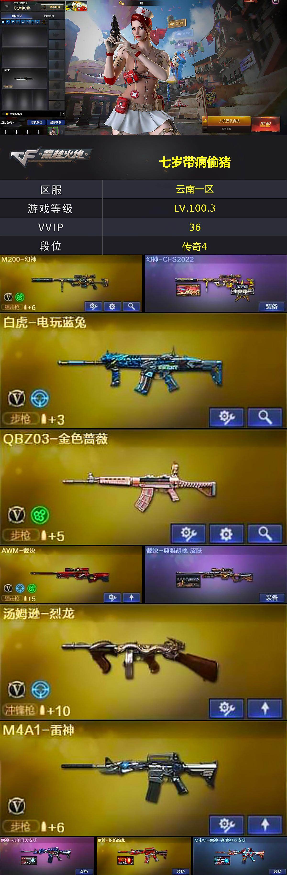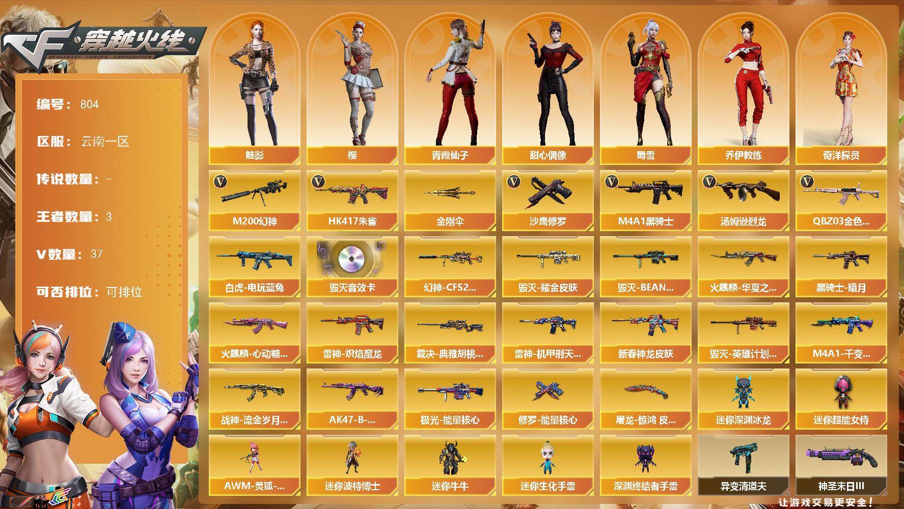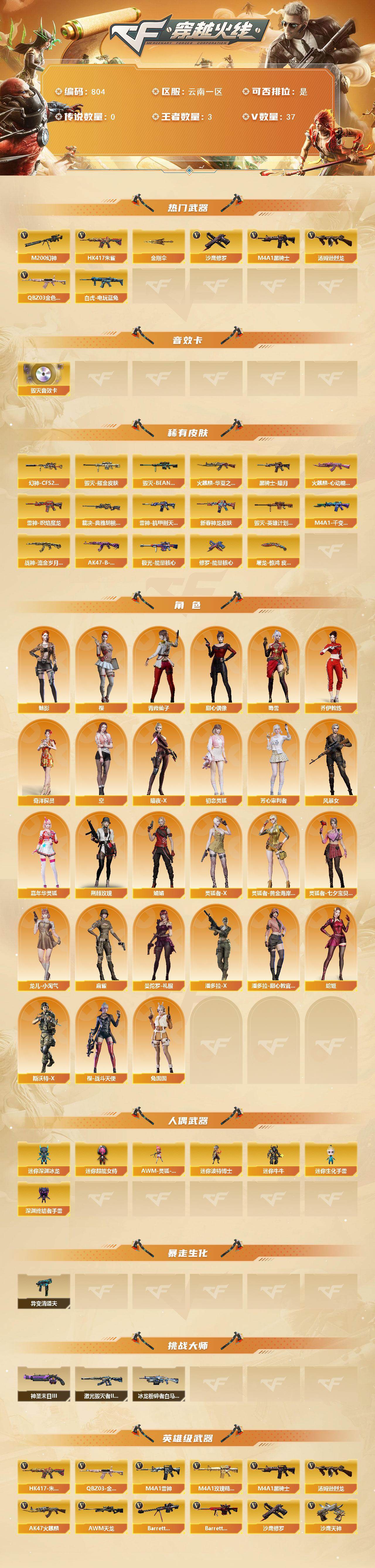 [15573329]云南一区-37V-3王者-0炫金 【热门武器】:QBZ03-金色蔷薇,HK417-朱雀,M200-幻神,白虎-电玩蓝兔,M4A1-黑骑士,汤姆逊-烈龙,沙鹰-修罗*2,金刚伞 【音效卡】:Barrett-毁灭音效卡 【皮肤】:幻神-CFS2022,裁决-典雅胡桃 皮肤,雷神-机甲刑天皮肤,雷神-炽焰魔龙,M4A1-雷神-新春神龙皮肤,火麒麟-华夏之心,火麒麟-心动糖果,毁灭耀金皮肤,毁灭-BEAN-2020MVP,毁灭-英雄计划 皮肤,M4A1-千变-孔明皮肤,黑骑士-暗月,战神-流金岁月皮肤,AK47-B-常胜将军-曹操*2,极光-能量核心,修罗-能量核心,屠龙-惊鸿 皮肤 【角色】:樱,魅影,奇洋探员,乔伊教练,空,暗夜-X,初恋灵狐,芳心审判者,风暴女,嘉年华灵狐,荆棘玫瑰,娟娟,灵狐者-X,灵狐者-黄金海岸,灵狐者-七夕宝贝,龙儿-小淘气,麻雀,曼陀罗-礼服,潘多拉-X,潘多拉-甜心教官,青霞仙子,蛇姬,斯沃特-X,甜心偶像,蜀雪,兔囡囡,樱-战斗天使 【人偶武器】:AWM-灵狐-15周年嘉年华,迷你深渊冰龙,迷你波特博士,迷你牛牛,迷你生化手雷,深渊终结者手雷*2,迷你超能女侍 【暴走生化】:异变清道夫 【挑战大师】:冰龙粉碎者-白马银枪*5,激光毁灭者III-白马银枪,神圣爆裂者-末日III*2 【英雄级武器】:AK47-火麒麟*2,M4A1-雷神,M4A1-黑骑士,AK47-机械迷城,HK417-朱雀,无影-神兵利器,M4A1-玫瑰精灵,QBZ03-金色蔷薇,M4A1-猎神,王者之心-觉醒版,王者之翼-觉醒版,白虎-电玩蓝兔,AWM-天龙,Barrett-毁灭*2,Barrett-极光,AWM-裁决,M200-幻神,王者之怒-觉醒版,汤姆逊-烈龙,AA-12-雷霆,沙鹰-修罗*2,沙鹰-天神,天神-动感闪耀,屠龙*2,擎天,幻灵之锋,高爆手雷-幻灵,手雷-动感闪耀,烟雾弹-幻灵,M4A1-赤狱骑士,M4A1-苍鸣雷神 【道具】:BS战队炫彩背包,云山科技背包,全能枪王背包,冰冰企鹅背包,女皇终结者-背包,战舰背包,老虎背包,背包-洛丽塔,虎牙炫彩背包,超级背包,黄金超能特工背包,女皇终结者-魔龙之吻,绿色巨人,灵魂忍者,迷雾幽灵,生化弹匣,夺命之镰*3,防化服*4,金色流光-枪王排位*2,电玩兔兔表情,C4-黑曜,防弹头盔*5,防弹衣*6,C4工具钳