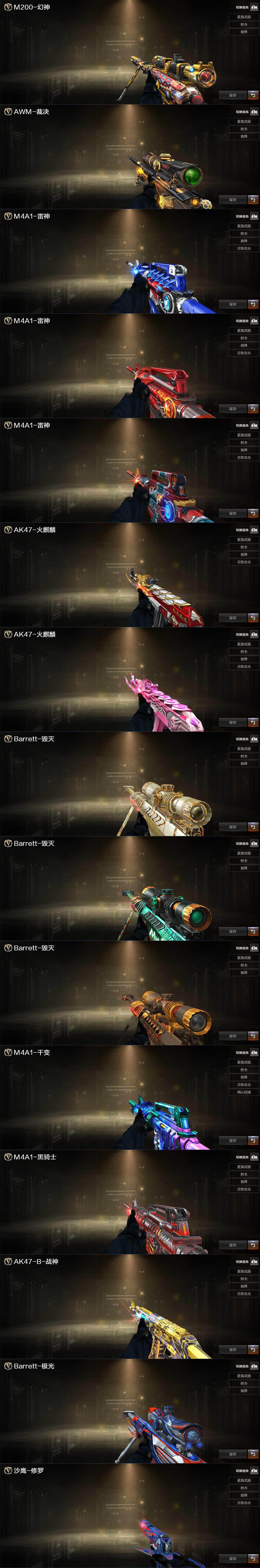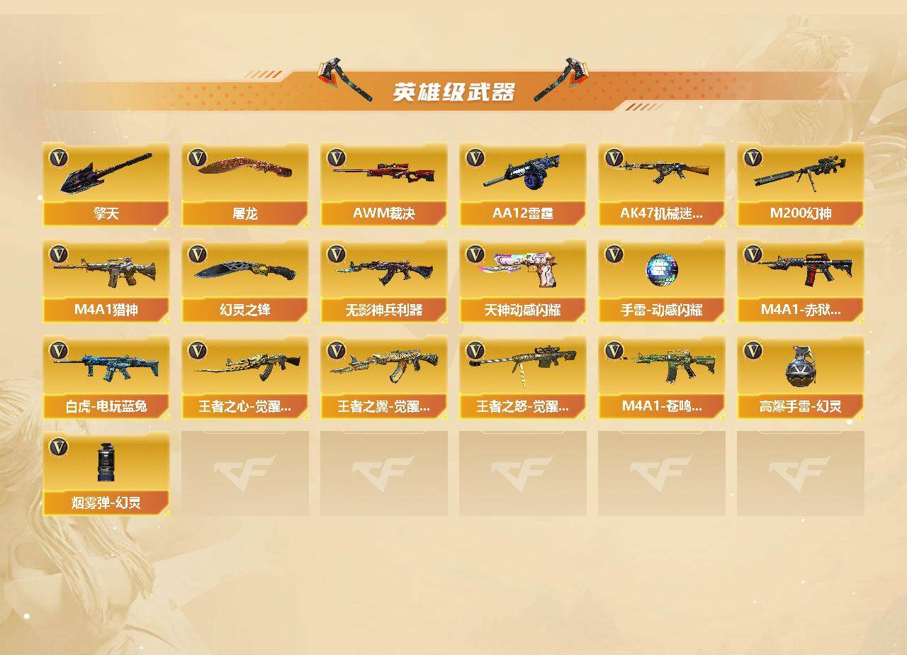 【英雄级武器】:AK47-火麒麟*2,M4A1-雷神,M4A1-黑骑士,AK47-机械迷城,HK417-朱雀,无影-神兵利器,M4A1-玫瑰精灵,QBZ03-金色蔷薇,M4A1-猎神,王者之心-觉醒版,王者之翼-觉醒版,白虎-电玩蓝兔,AWM-天龙,Barrett-毁灭*2,Barrett-极光,AWM-裁决,M200-幻神,王者之怒-觉醒版,汤姆逊-烈龙,AA-12-雷霆,沙鹰-修罗*2,沙鹰-天神,天神-动感闪耀,屠龙*2,擎天,幻灵之锋,高爆手雷-幻灵,手雷-动感闪耀,烟雾弹-幻灵,M4A1-赤狱骑士,M4A1-苍鸣雷神