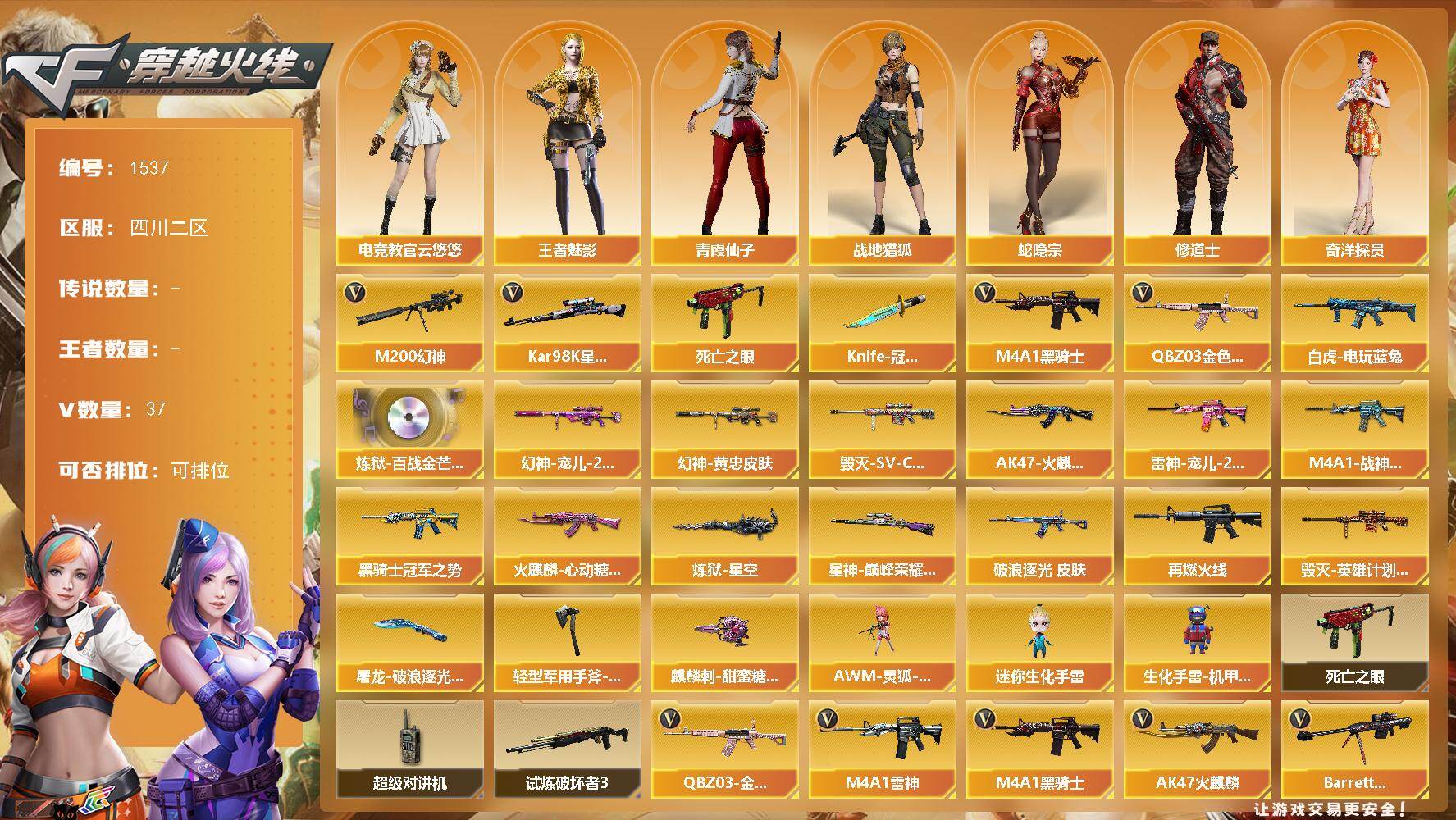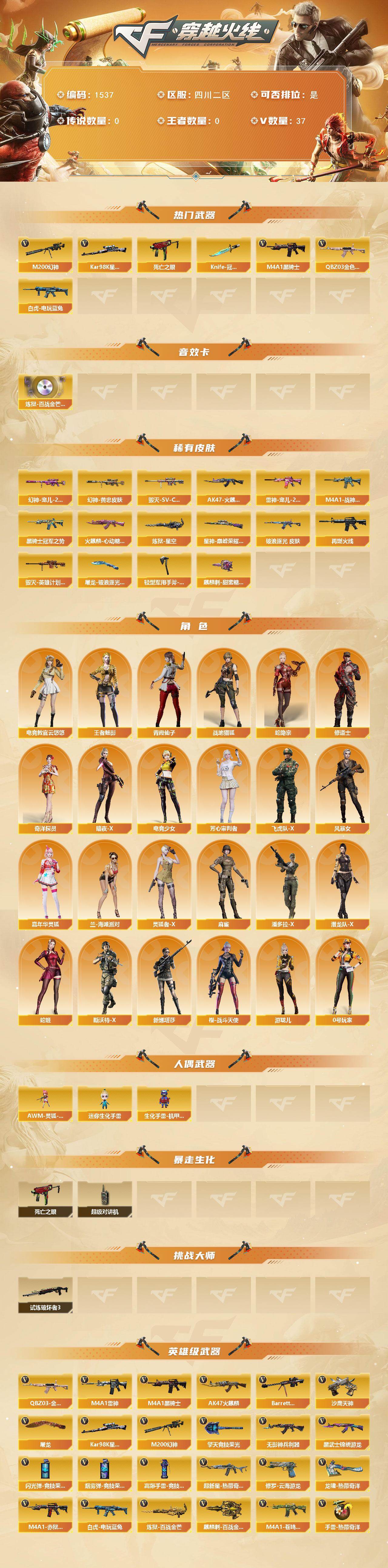 [15573809]四川二区-37V-0王者-0炫金 【热门武器】:QBZ03-金色蔷薇,M200-幻神,死亡之眼,白虎-电玩蓝兔,Kar98K-星神,M4A1-黑骑士,Knife-冠军之刃*2 【音效卡】:炼狱-百战金芒-庆典舞曲音效卡 【皮肤】:M200-幻神-黄忠皮肤,幻神-宠儿-2021MVP,金色蔷薇-破浪逐光 皮肤,星神-巅峰荣耀 皮肤,M4A1-战神赵云,雷神-宠儿-2019MVP,M4A1-再燃火线,AK47-火麒麟-传奇EVEN,火麒麟-心动糖果,毁灭-SV-CFPLS16冠军,毁灭-英雄计划 皮肤,黑骑士-冠军之势,炼狱-星空,屠龙-破浪逐光 皮肤,轻型军用手斧-再燃火线,麒麟刺-甜蜜糖果 皮肤 【角色】:电竞教官-云悠悠,战地猎狐,王者-魅影,蛇隐宗,奇洋探员,修道士,暗夜-X,电竞少女,芳心审判者,飞虎队-X,风暴女,嘉年华灵狐,兰-海滩派对,0号玩家,灵狐者-X,麻雀,潘多拉-X,潜龙队-X,青霞仙子,蛇姬,斯沃特-X,新娜塔莎,樱-战斗天使,游珑儿 【人偶武器】:AWM-灵狐-15周年嘉年华*2,迷你生化手雷,生化手雷-机甲核心 【暴走生化】:死亡之眼,超级对讲机 【挑战大师】:试炼破坏者III 【英雄级武器】:AK47-火麒麟,M4A1-雷神,M4A1-黑骑士,无影-神兵利器,黑武士-锦绣游龙,超新星-热带奇洋,QBZ03-金色蔷薇,白虎-电玩蓝兔,Barrett-毁灭,M200-幻神,Kar98K-星神,炼狱-百战金芒,沙鹰-天神,修罗-云海游龙,屠龙,擎天-竞技荣光,龙啸-热带奇洋,麒麟刺-百战金芒,高爆手雷-竞技荣光*5,手雷-热带奇洋,高爆手雷-古蛇迷踪,闪光弹-竞技荣光*3,烟雾弹-竞技荣光*3,烟雾弹-古蛇迷踪,M4A1-赤狱骑士,M4A1-苍鸣雷神 【道具】:BS战队炫彩背包,云山科技背包,亚洲杯纪念炫彩背包,全能枪王背包,冰冰企鹅背包,奇洋探员-海龟背包,热带奇洋炫彩背包,百战金芒炫彩背包,超级背包,哔哩哔哩名片,女皇终结者-魔龙之吻,救世主-黑桃战神,妩媚妖姬,绿色巨人,灵魂忍者*2,变异宝贝,迷雾幽灵*2,生化弹匣,夺命之镰,防化服*3,金色流光-枪王排位*2,星辰流光-枪王排位,流光-再燃火线,枪王排位28赛季金色流光,枪王排位29赛季金色流光,语音特效-盛典烟火,蛇隐宗表情,萌萌小葵表情,热带奇洋表情,EP战队收纳包,EP战队名片