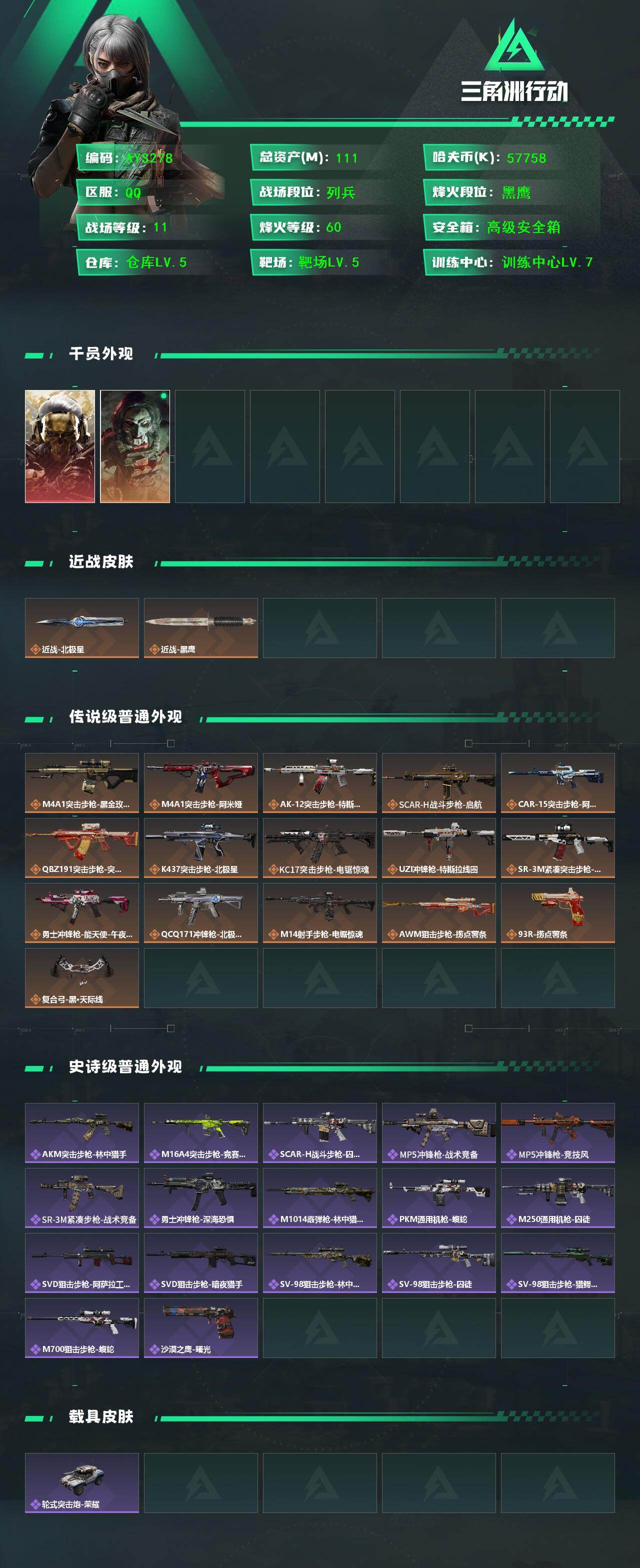 [15576735]可二次【特价出售/店主推荐】 111m总资产-57758k哈伏币-60烽火等级-黑鹰-11战场等级-列兵 【干员外观】:红狼-蚀金玫瑰,红狼-电锯惊魂 【近战皮肤】:近战-北极星,近战-黑鹰 【传说外观】:M4A1突击步枪-蚀金玫瑰,M4A1突击步枪-阿米娅,AK-12突击步枪-特斯拉线圈,SCAR-H战斗步枪-启航,CAR-15突击步枪-阿米娅,腾龙突击步枪-捞点薯条,K437突击步枪-北极星,KC17突击步枪-电锯惊魂,UZI冲锋枪-特斯拉线圈,SR-3M紧凑突击步枪-特斯拉线圈,勇士冲锋枪-能天使-午夜邮差,QCQ171冲锋枪-北极星,M14射手步枪-电锯惊魂,AWM狙击步枪-捞点薯条,93R-捞点薯条,复合弓-黑·天际线 【史诗外观】:AKM突击步枪-林中猎手,M16A4突击步枪-竞赛选手,SCAR-H战斗步枪-囚徒,MP5冲锋枪-战术竞备,MP5冲锋枪-竞技风,SR-3M紧凑突击步枪-战术竞备,勇士冲锋枪-深海恐惧,M1014霰弹枪-林中猎手,PKM通用机枪-蝮蛇,M250通用机枪-囚徒,SVD狙击步枪-阿萨拉工艺,SVD狙击步枪-暗夜猎手,SV-98狙击步枪-林中猎手,SV-98狙击步枪-囚徒,SV-98狙击步枪-猎鳄行动,M700狙击步枪-蝮蛇,沙漠之鹰-曙光 【稀有外观】:M14射手步枪-花岗岩,AKM突击步枪-肃杀,M7战斗步枪-捣蛋鬼,SCAR-H战斗步枪-童趣,SCAR-H战斗步枪-荣耀列队,PTR-32突击步枪-天网,PTR-32突击步枪-英雄,CAR-15突击步枪-前沿科技,腾龙突击步枪-冰天雪地,MP5冲锋枪-弄臣,MP5冲锋枪-虎啸,P90冲锋枪-浅鲨小队,P90冲锋枪-新生,P90冲锋枪-黄昏,Vector冲锋枪-先锋,UZI冲锋枪-前沿科技,UZI冲锋枪-亚特兰蒂斯,野牛冲锋枪-前沿科技,SMG-45-行动开启,SMG-45冲锋枪-幻影结构,SMG-45冲锋枪-天网,MP7冲锋枪-幻影结构,M1014霰弹枪-幻影结构,M250通用机枪-天网,QJB201轻机枪-哈夫克卫队,Mini-14射手步枪-荣耀列队,VSS射手步枪-童趣,SKS射手步枪-弄臣,SR-25射手步枪-开拓,SR-9射手步枪-街头涂鸦,G18-星链科技,G18-哈夫克航天 【普通外观】:M14射手步枪-蛇纹涂装,MP5冲锋枪-古铜,M4A1突击步枪-粉色涂装,M4