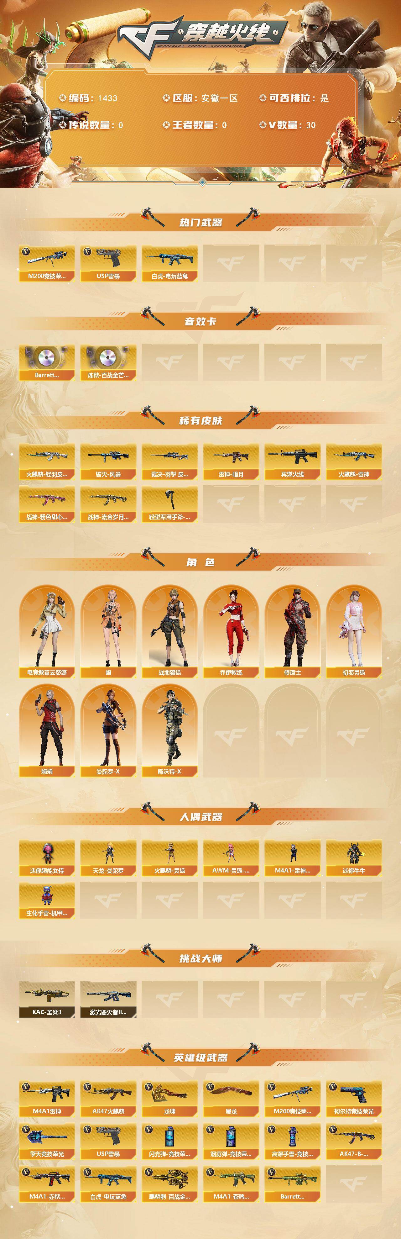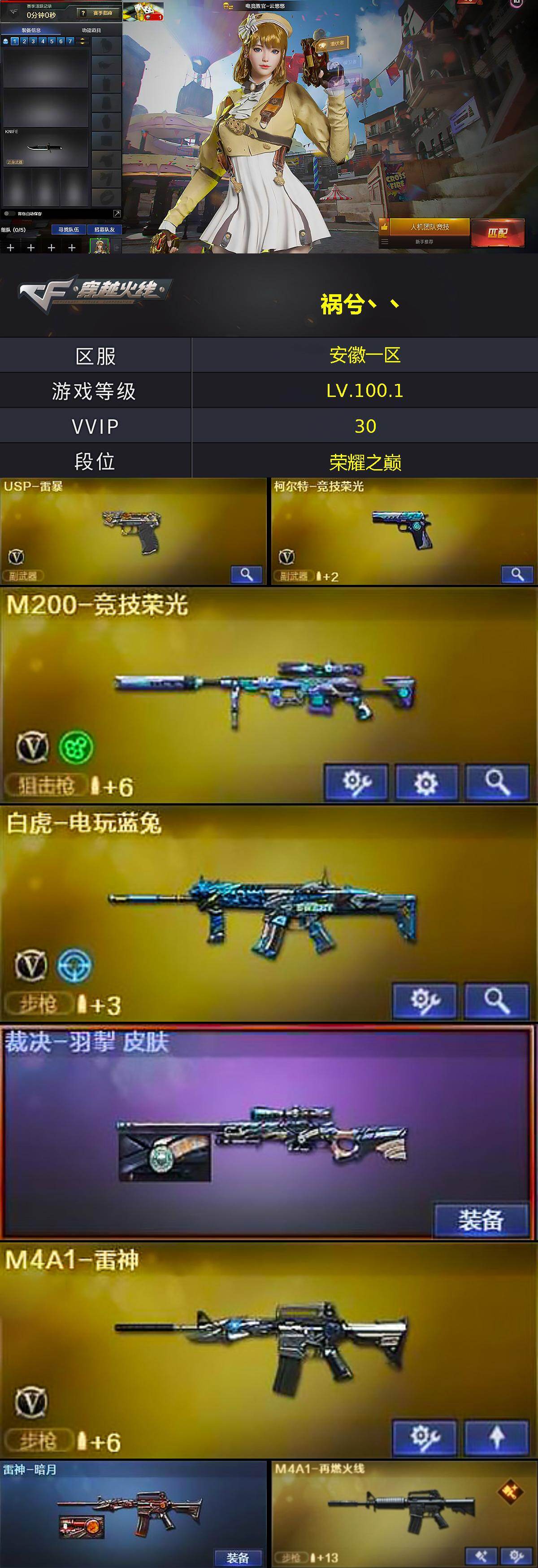 [15577480]安徽一区-30V-0王者-0炫金 【热门武器】:M200-竞技荣光,白虎-电玩蓝兔,USP-雷暴 【音效卡】:Barrett-碧霄极光音效卡,炼狱-百战金芒-庆典舞曲音效卡 【皮肤】:裁决-羽掣 皮肤,雷神-暗月,M4A1-再燃火线,火麒麟-雷神,火麒麟-轻羽皮肤,毁灭-风暴,战神-粉色甜心皮肤,战神-流金岁月皮肤,轻型军用手斧-再燃火线 【角色】:电竞教官-云悠悠,战地猎狐,乔伊教练,修道士,初恋灵狐,娟娟,曼陀罗-X,斯沃特-X,幽 【人偶武器】:天龙-曼陀罗,火麒麟-灵狐,M4A1-雷神-精英刀锋,AWM-灵狐-15周年嘉年华,迷你牛牛,生化手雷-机甲核心*2,迷你超能女侍 【挑战大师】:激光毁灭者III-白马银枪,KAC-圣炎切割者III 【英雄级武器】:AK47-火麒麟,M4A1-雷神,AK47-B-战神,白虎-电玩蓝兔,M200-竞技荣光,USP-雷暴,柯尔特-竞技荣光,屠龙,龙啸,擎天-竞技荣光,麒麟刺-百战金芒,高爆手雷-竞技荣光*2,闪光弹-竞技荣光*4,烟雾弹-竞技荣光*3,M4A1-赤狱骑士,M4A1-苍鸣雷神,Barrett-碧霄极光 【道具】:BS战队炫彩背包,CFS限定背包,云山科技背包,亚洲杯纪念炫彩背包,女皇终结者-背包,百战金芒炫彩背包,女皇终结者-魔龙之吻,救世主-黑桃战神,绿色巨人,灵魂忍者,迷雾幽灵,夺命之镰,防化服*3,星辰流光-枪王排位,枪王排位29赛季金色流光,语音特效-盛典烟火,萌萌小葵表情,电玩兔兔表情,C4-再燃火线,防弹头盔*4,防弹衣*4,C4工具钳*4,手雷包*4 【特殊枪械】: