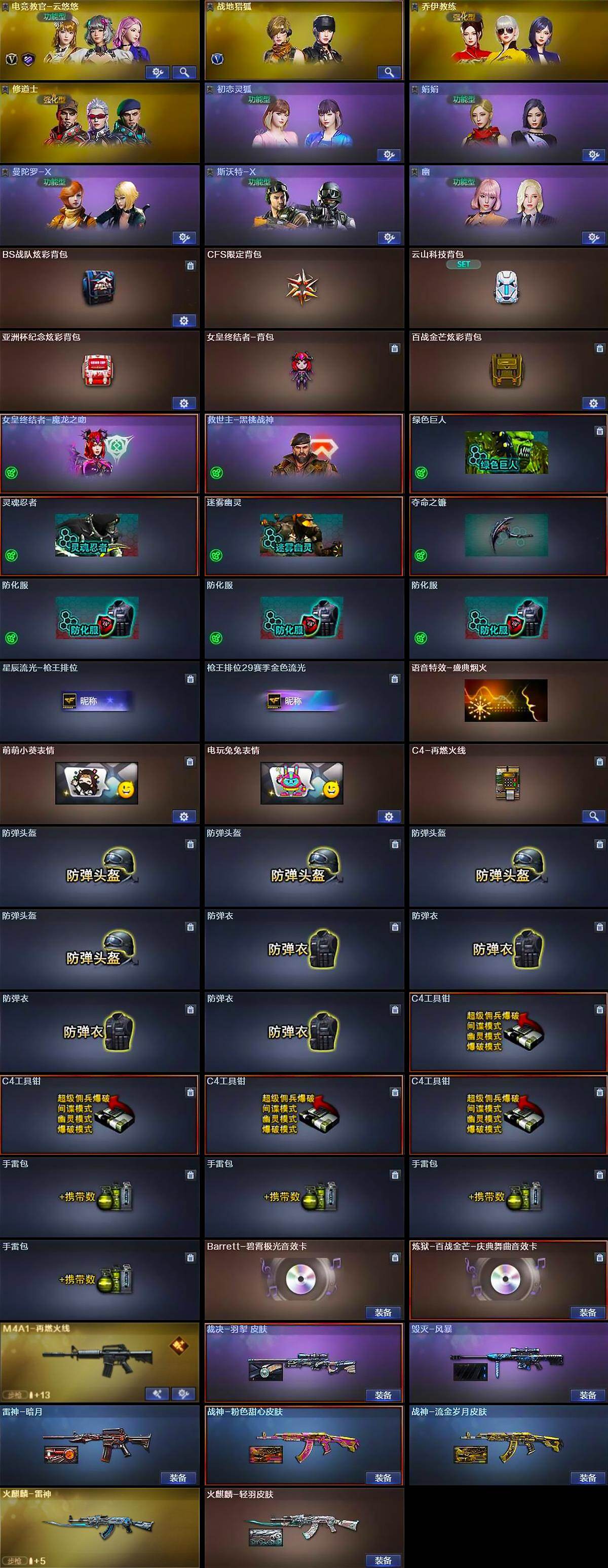 【道具】:BS战队炫彩背包,CFS限定背包,云山科技背包,亚洲杯纪念炫彩背包,女皇终结者-背包,百战金芒炫彩背包,女皇终结者-魔龙之吻,救世主-黑桃战神,绿色巨人,灵魂忍者,迷雾幽灵,夺命之镰,防化服*3,星辰流光-枪王排位,枪王排位29赛季金色流光,语音特效-盛典烟火,萌萌小葵表情,电玩兔兔表情,C4-再燃火线,防弹头盔*4,防弹衣*4,C4工具钳*4,手雷包*4