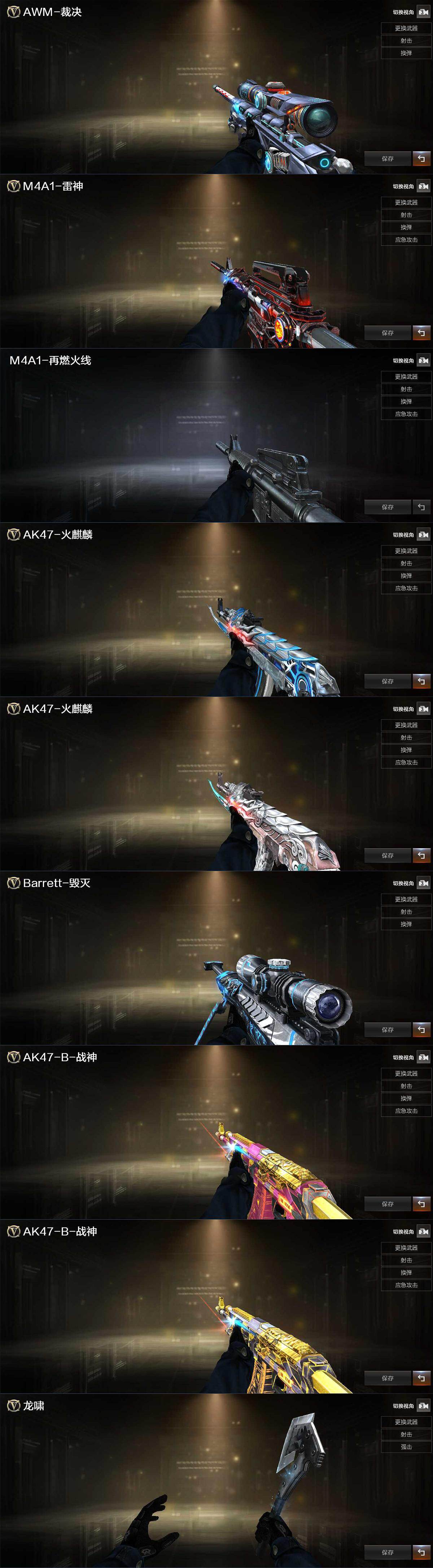 【英雄级武器】:AK47-火麒麟,M4A1-雷神,AK47-B-战神,白虎-电玩蓝兔,M200-竞技荣光,USP-雷暴,柯尔特-竞技荣光,屠龙,龙啸,擎天-竞技荣光,麒麟刺-百战金芒,高爆手雷-竞技荣光*2,闪光弹-竞技荣光*4,烟雾弹-竞技荣光*3,M4A1-赤狱骑士,M4A1-苍鸣雷神,Barrett-碧霄极光