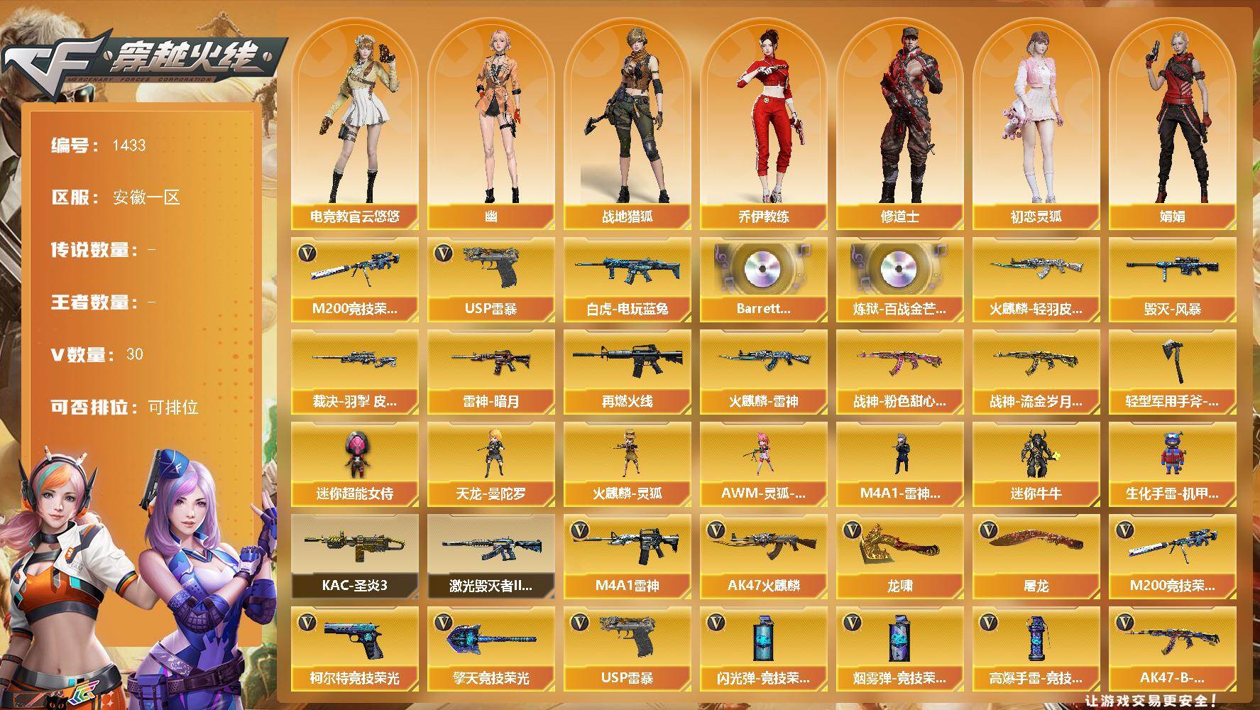 - [13073675]【412】186V/102级/荣耀元首/2传说/36王者/4炫金/3英雄/传说暗裔/传说圣灵/QBZ03-金色蔷薇/Scar Light-白虎/HK417-朱雀/M4A1青龙/M200-幻神/死亡之眼/白虎-电玩蓝兔/金色小号/Cat-刀锋/牛牛-AK47/M4A1-黑骑士/汤姆逊-烈龙/RPK-盘龙/加特林-炼狱/斯泰尔蝴蝶/降世魔童/雷神-小红/火麒麟-绝迹/COP-白鲨/USP雷暴/COP-堕天神/COP 357-幻灵/沙鹰-修罗/蝴蝶斯泰尔+6烈龙/王者之武/炫金无影/炫金天龙/炫金天神/炫金雷神/M200-幻神音效卡/AK47-火麒麟音效卡/M4A1-雷神音效卡/M4A1-黑骑士音效卡/Barrett-毁灭音效卡/Barrett-极光音效卡/幻神周瑜/幻神-AG-CFPLS17冠军/幻神丹凤/幻神青鹤/雷神-暗月/雷神-星空/雷神-虎将/雷神-耀金皮肤/雷神-传奇N9/雷神-杨戬/雷神-烈虎皮肤/雷神-机甲刑天皮肤/雷神-源计划2.0专属 皮肤/雷神-化蛇 皮肤/火麒麟-战神关羽/火麒麟-平天大圣/火麒麟-百城/火麒麟-心动糖果/毁灭耀金皮肤/毁灭-星空/毁灭-冠军之怒/毁灭-战神张飞/毁灭-黑大圣皮肤/毁灭-风暴/毁灭-神秘黑洞皮肤/M4A1-千变-孔明皮肤/黑龙-暗月/黑骑士-暗月/黑骑士-耀金皮肤/黑骑士-地狱火/无影耀金皮肤/战神-粉色甜心皮肤/AK47-B-常胜将军-曹操/AK47-B-常胜将军-刘备/AWM-天龙-传奇70KG/极光-能量核心/Barrett-金色蔷薇-蛇姬 皮肤/炼狱-玩具枪皮肤/炼狱-月 皮肤/沙鹰-修罗-CF STAR/修罗-能量核心/屠龙-春桃/龙啸-蛇姬 皮肤/擎天-冠军之击/擎天-蒸汽钟表/麒麟刺-萌杀皮肤/樱/魅影/影豹/王者-瞳-闭月羞花/王者-零-国色天香/王者-葵-貂蝉/王者葵-惊若翩鸿/王者春/王者玲珑/王者-魅影/王者玲珑-小乔/灵狐者-职业经理/零-水下丽影/蜀雪/职业经理/铁骑荣耀/职业选手/青霞仙子/甜心偶像/火麒麟-灵狐/M4A1-雷神-精英刀锋/巴雷特-零-水下丽影/AWM-灵狐-15周年嘉年华/M37-葵/迷你艾比/迷你超能女侍/迷你巨石泰坦-魔花研究所/迷你深渊冰龙/迷你裂空之翼/迷你牛魔王/迷你波特博士/夺魂/迷你牛牛/迷你生化手雷/生化手雷-机甲核心/超级对讲机/6烈龙/6盘龙/5炼狱