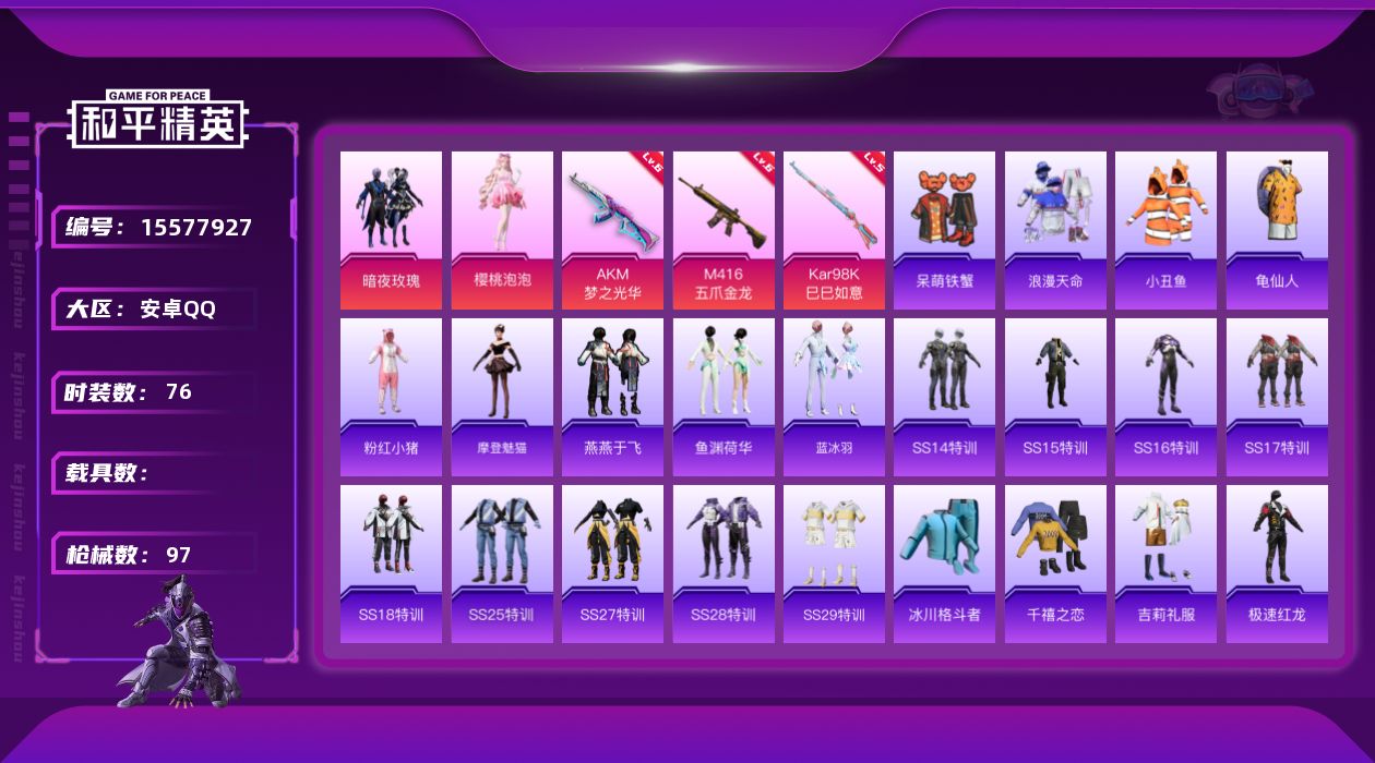 [15577927]【店主推荐捡漏号!可直接换绑】安卓 手Q-2粉装-3特效枪-0载具-1粉色飞行器-32580热力值-4王牌印记-76套装-97枪皮【热门品类】:套装-浪漫天命,套装-小丑鱼,套装-龟仙人,套装-粉红小猪【粉色套装】:粉装-暗夜玫瑰,角色-樱桃泡泡【粉色枪皮等级】:AKM-梦之光华(六级),M416-五爪金龙(六级),Kar98K-巳巳如意(五级)【粉色枪皮】:AKM-梦之光华,M416-五爪金龙,Kar98K-巳巳如意【粉色飞行器】:梦之光华飞行器