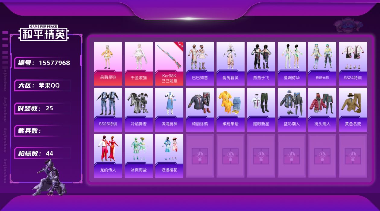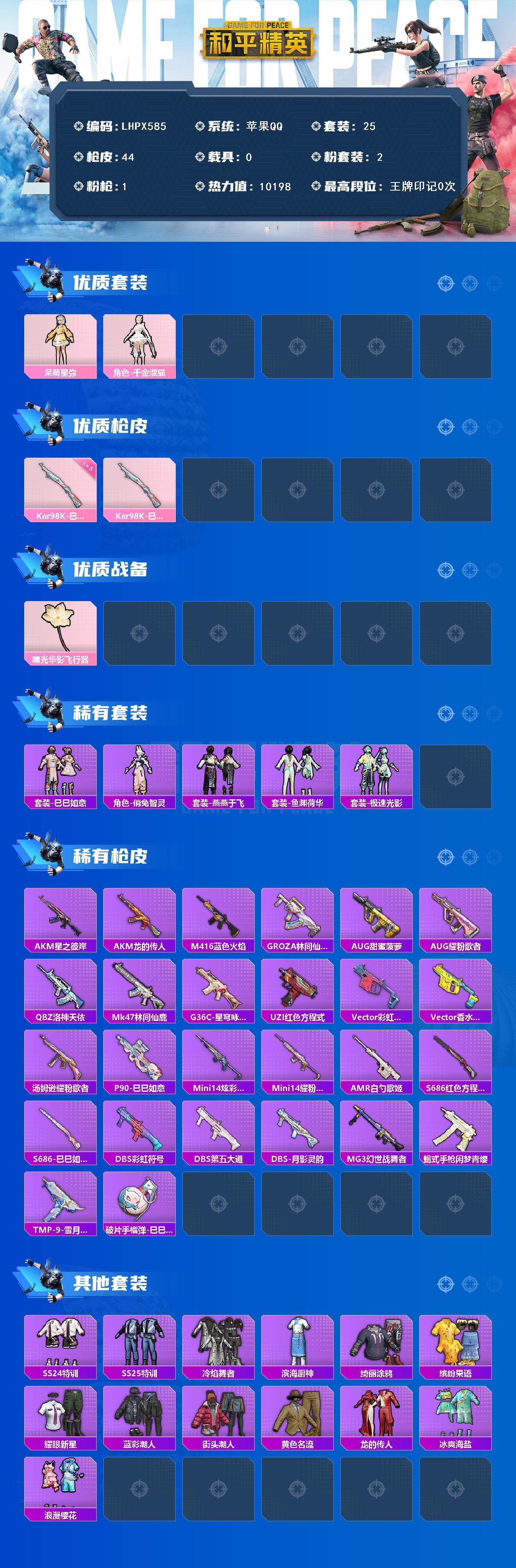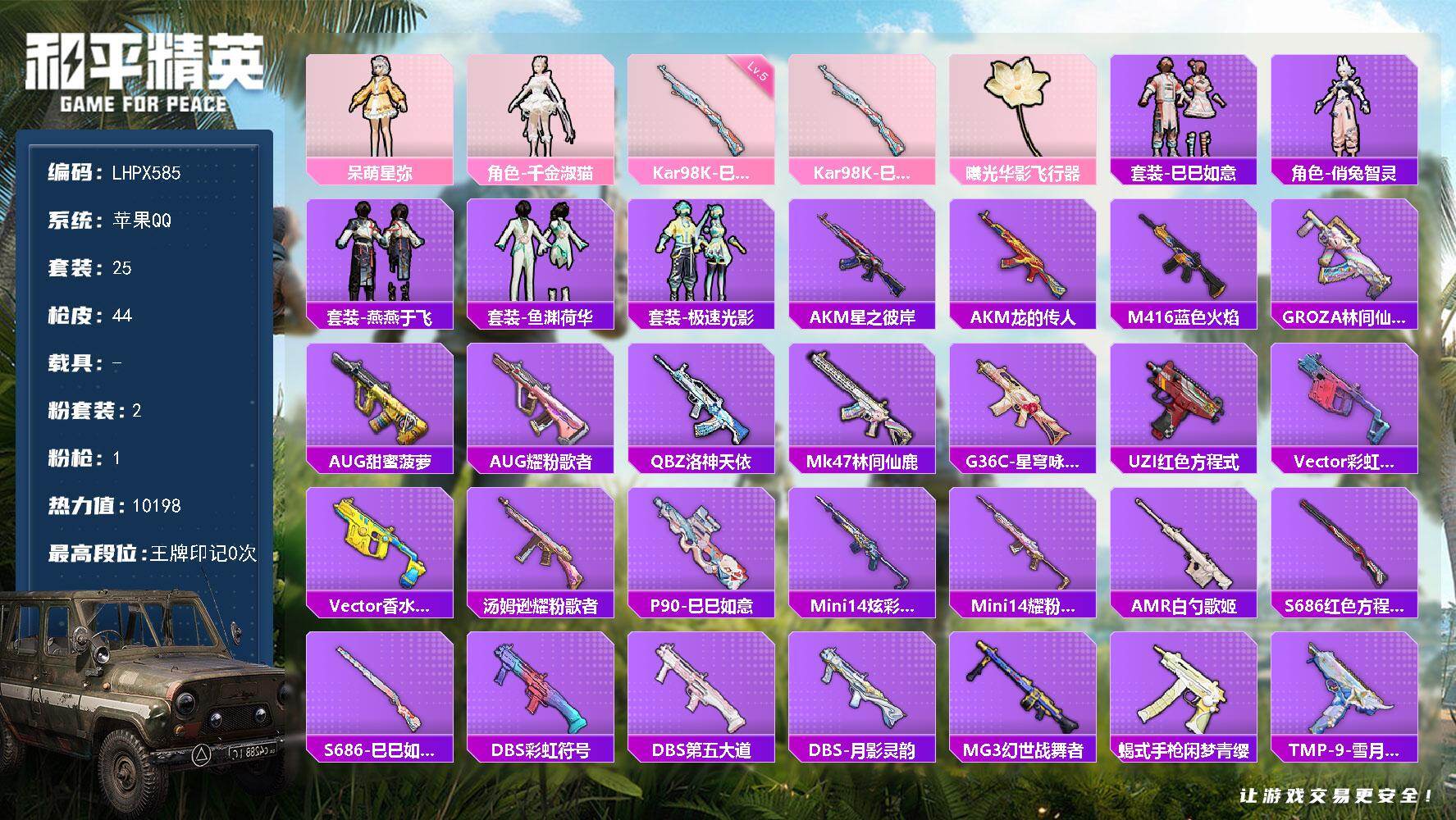 [15577968]【特价出售/店主推荐】苹果 手Q-2粉装-1特效枪-0载具-1粉色飞行器-10198热力值-0王牌印记-25套装-44枪皮 【粉色套装】:角色-呆萌星弥,角色-千金淑猫 【粉色枪皮等级】:Kar98K-巳巳如意(五级) 【粉色枪皮】:Kar98K-巳巳如意 【粉色飞行器】:曦光华影飞行器 【稀有套装】:套装-巳巳如意,角色-俏兔智灵,套装-燕燕于飞,套装-鱼渊荷华,套装-极速光影 【稀有枪皮】:AKM-星之彼岸,AKM-龙的传人,M416-蓝色火焰,GROZA-林间仙鹿,AUG-甜蜜菠萝,AUG-耀粉歌者,QBZ-洛神天依,Mk47-林间仙鹿,G36C-星穹咏叹调,UZI-红色方程式,Vector-彩虹符号,Vector-香水柠檬,汤姆逊-耀粉歌者,P90-巳巳如意,Mini14-炫彩节奏,Mini14-耀粉歌者,AMR-白勺歌姬,S686-红色方程式,S686-巳巳如意,DBS-彩虹符号,DBS-第五大道,DBS-月影灵韵,MG3-幻世战舞者,蝎式手枪-闲梦青缨,TMP-9-雪月幻音,破片手榴弹-巳巳如意 【其他套装】:套装-SS24特训,套装-SS25特训,套装-冷焰舞者,套装-滨海厨神,套装-绮丽涂鸦,套装-缤纷果语,套装-耀眼新星,套装-蓝彩潮人,套装-街头潮人,套装-黄色名流,套装-龙的传人,套装-冰爽海盐,套装-浪漫樱花 【营地ID】:936318428