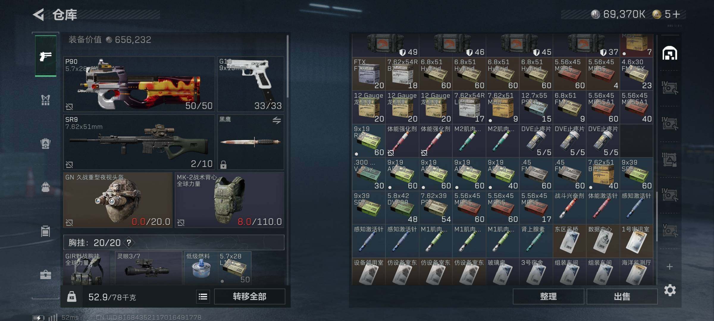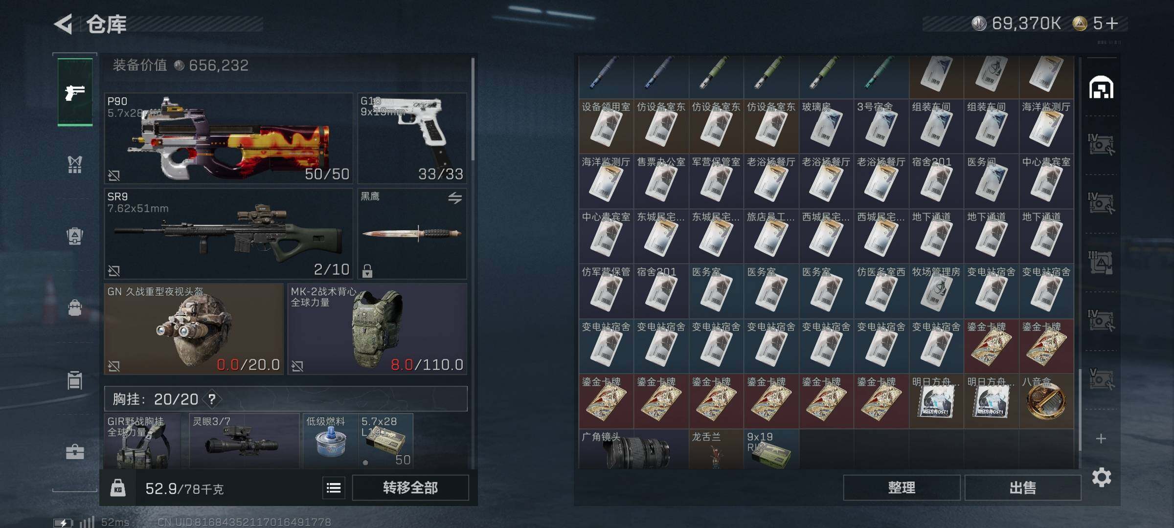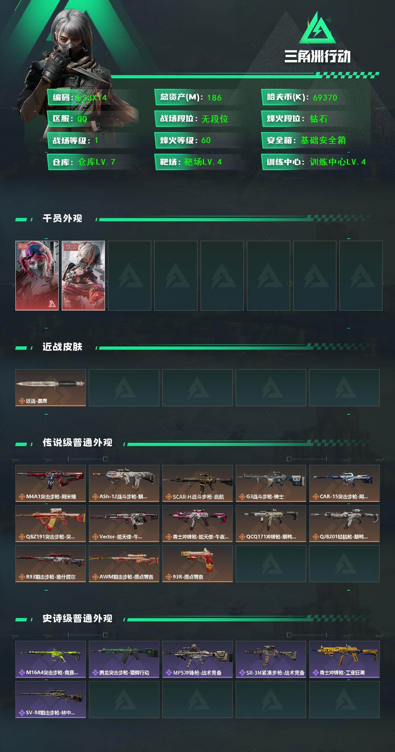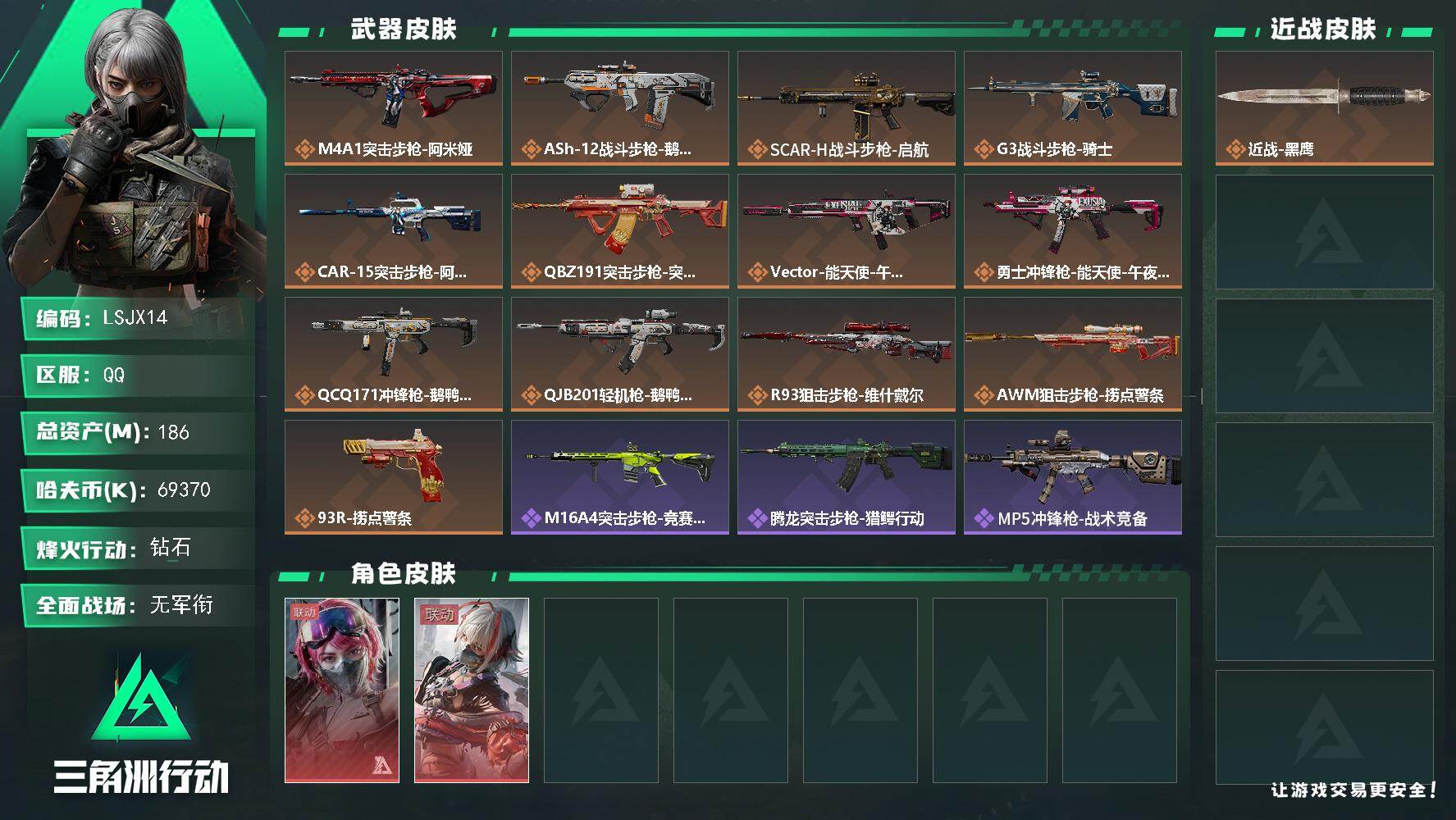 [15578028]【特价出售/店主推荐】186m总资产-69370k哈伏币-60烽火等级-钻石-1战场等级-无军衔 【干员外观】:蛊-能天使午夜邮差,骇爪-维什戴尔 【近战皮肤】:近战-黑鹰 【传说外观】:M4A1突击步枪-阿米娅,ASh-12战斗步枪-鹅鸭杀,SCAR-H战斗步枪-启航,G3战斗步枪-骑士,CAR-15突击步枪-阿米娅,腾龙突击步枪-捞点薯条,Vector冲锋枪-能天使-午夜邮差,勇士冲锋枪-能天使-午夜邮差,QCQ171冲锋枪-鹅鸭杀,QJB201轻机枪-鹅鸭杀,R93狙击步枪-维什戴尔,AWM狙击步枪-捞点薯条,93R-捞点薯条 【史诗外观】:M16A4突击步枪-竞赛选手,腾龙突击步枪-猎鳄行动,MP5冲锋枪-战术竞备,SR-3M紧凑突击步枪-战术竞备,勇士冲锋枪-工业狂潮,SV-98狙击步枪-林中猎手 【稀有外观】:QBZ95-1突击步枪-公平竞技,M7战斗步枪-捣蛋鬼,SCAR-H战斗步枪-荣耀列队,MP5冲锋枪-弄臣,MP5冲锋枪-虎啸,MP5冲锋枪-哈夫克卫队,P90冲锋枪-前沿科技,P90冲锋枪-黄昏,SMG-45-行动开启,M249轻机枪-毛鲁斯之力,QJB201轻机枪-哈夫克卫队,Mini-14射手步枪-荣耀列队,SKS射手步枪-弄臣,SR-9射手步枪-街头涂鸦,SV-98狙击步枪-星链科技,SV-98狙击步枪-哈夫克航天,SV-98狙击步枪-精英联盟,G18-精英联盟 【普通外观】:M4A1突击步枪-粉色涂装,M4A1突击步枪-高雅黑,M4A1突击步枪-海色,QBZ95-1突击步枪-高雅黑,QBZ95-1突击步枪-海浪,K416突击步枪-高雅黑,M16A4突击步枪-山林猎人,M16A4突击步枪-高雅黑,M7战斗步枪-红色涂装,SG552突击步枪-浅蓝涂装,G3战斗步枪-高雅黑,PTR-32突击步枪-黄蜂,MP5冲锋枪-黄蜂,UZI冲锋枪-海色,野牛冲锋枪-高雅黑,M1014霰弹枪-高雅黑,PKM通用机枪-彩墨喷涂,M249轻机枪-黄蜂,M250通用机枪-条纹,SR-25射手步枪-黄蜂,SV-98狙击步枪-红色涂装,QSZ92G-条纹,沙漠之鹰-海浪,沙漠之鹰-高雅黑 【军牌】:军牌-捞点薯条,军牌-静谧时光,军牌-永恒,军牌-零号大坝,军牌-来点薯条,军牌-修整,军牌-信誉优秀,军牌-小心鳄鱼 【挂饰】:挂饰-幸运鼠鼠,挂饰-阿萨拉喷火兵,挂饰