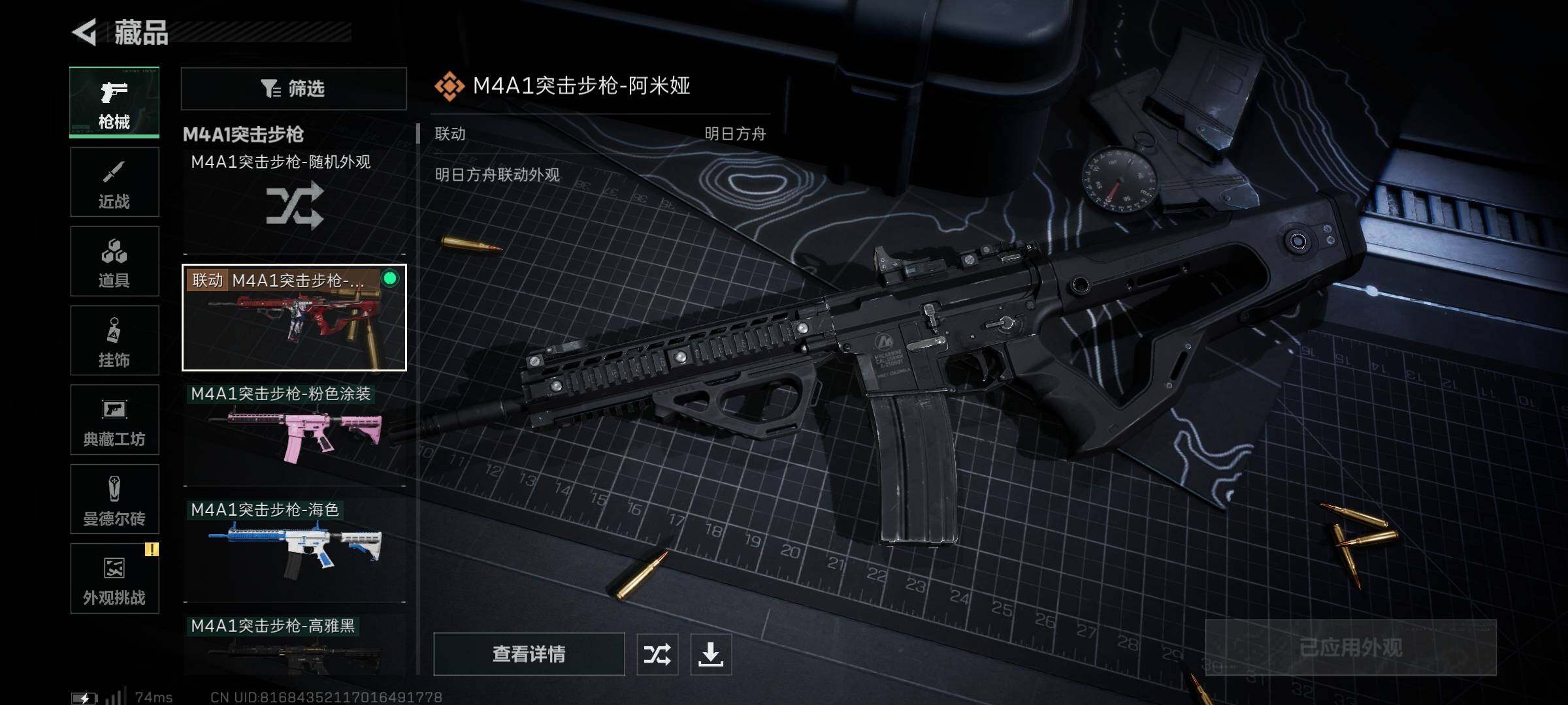 【普通外观】:M4A1突击步枪-粉色涂装,M4A1突击步枪-高雅黑,M4A1突击步枪-海色,QBZ95-1突击步枪-高雅黑,QBZ95-1突击步枪-海浪,K416突击步枪-高雅黑,M16A4突击步枪-山林猎人,M16A4突击步枪-高雅黑,M7战斗步枪-红色涂装,SG552突击步枪-浅蓝涂装,G3战斗步枪-高雅黑,PTR-32突击步枪-黄蜂,MP5冲锋枪-黄蜂,UZI冲锋枪-海色,野牛冲锋枪-高雅黑,M1014霰弹枪-高雅黑,PKM通用机枪-彩墨喷涂,M249轻机枪-黄蜂,M250通用机枪-条纹,SR-25射手步枪-黄蜂,SV-98狙击步枪-红色涂装,QSZ92G-条纹,沙漠之鹰-海浪,沙漠之鹰-高雅黑