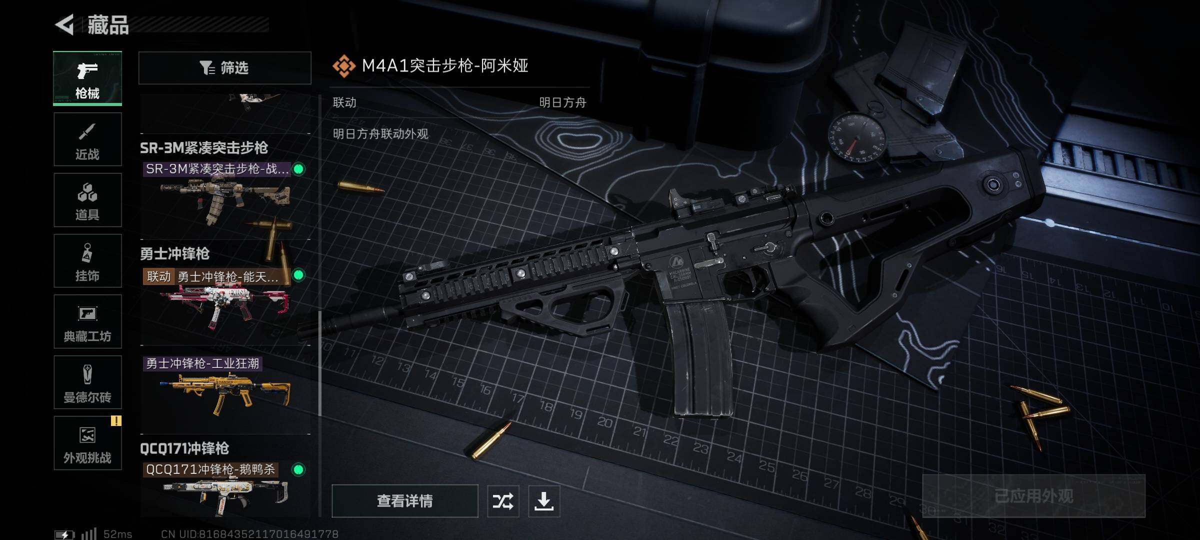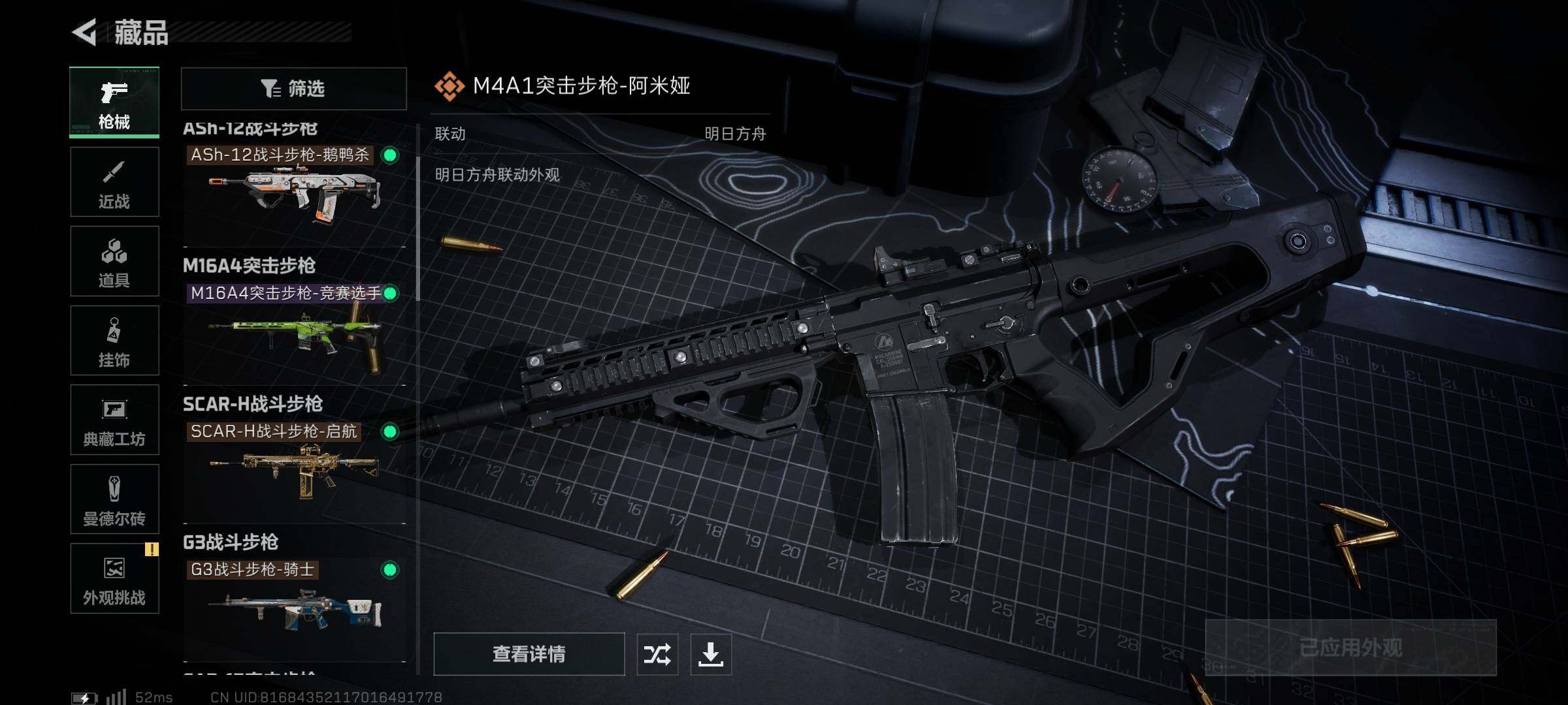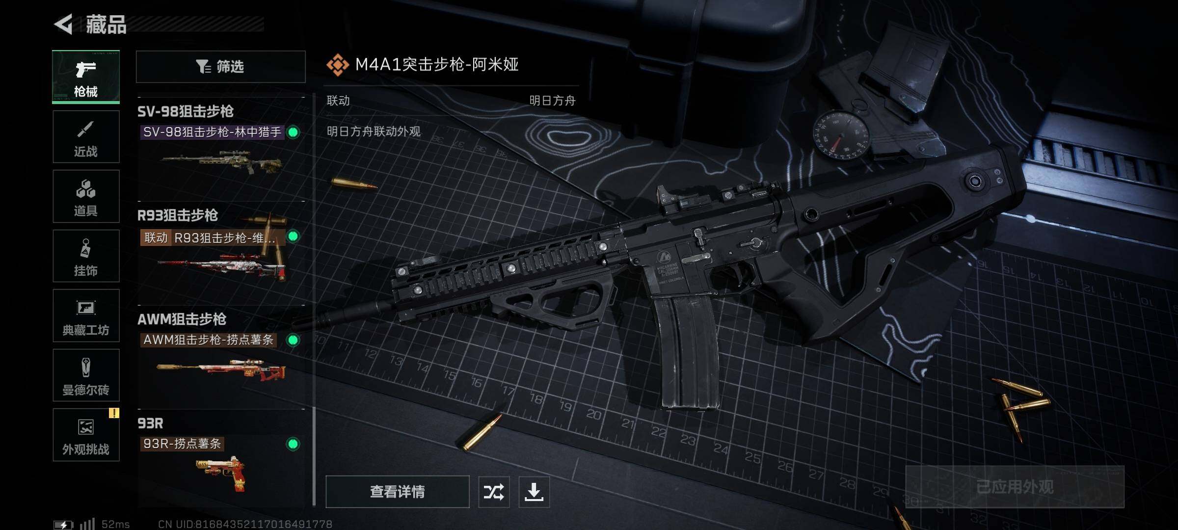 【传说外观】:M4A1突击步枪-阿米娅,ASh-12战斗步枪-鹅鸭杀,SCAR-H战斗步枪-启航,G3战斗步枪-骑士,CAR-15突击步枪-阿米娅,腾龙突击步枪-捞点薯条,Vector冲锋枪-能天使-午夜邮差,勇士冲锋枪-能天使-午夜邮差,QCQ171冲锋枪-鹅鸭杀,QJB201轻机枪-鹅鸭杀,R93狙击步枪-维什戴尔,AWM狙击步枪-捞点薯条,93R-捞点薯条