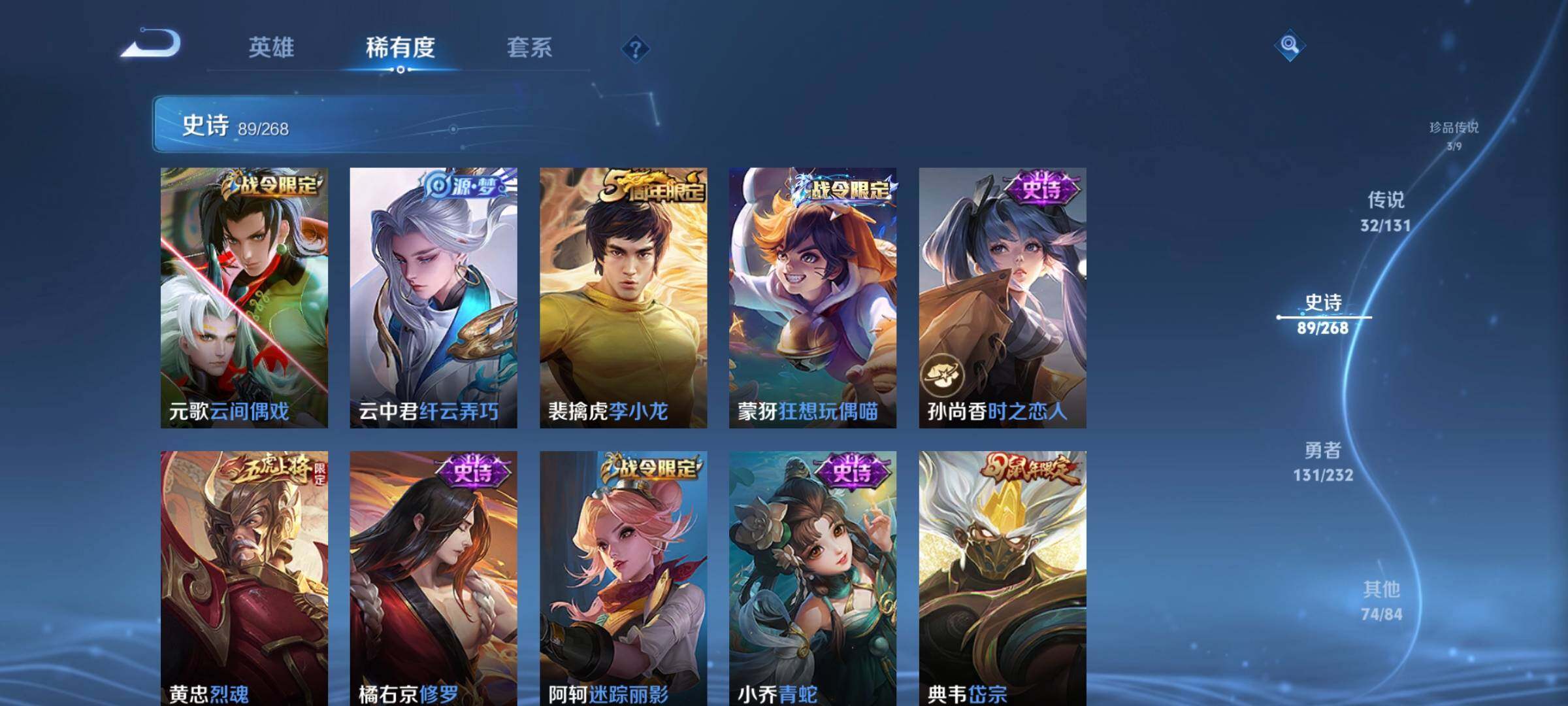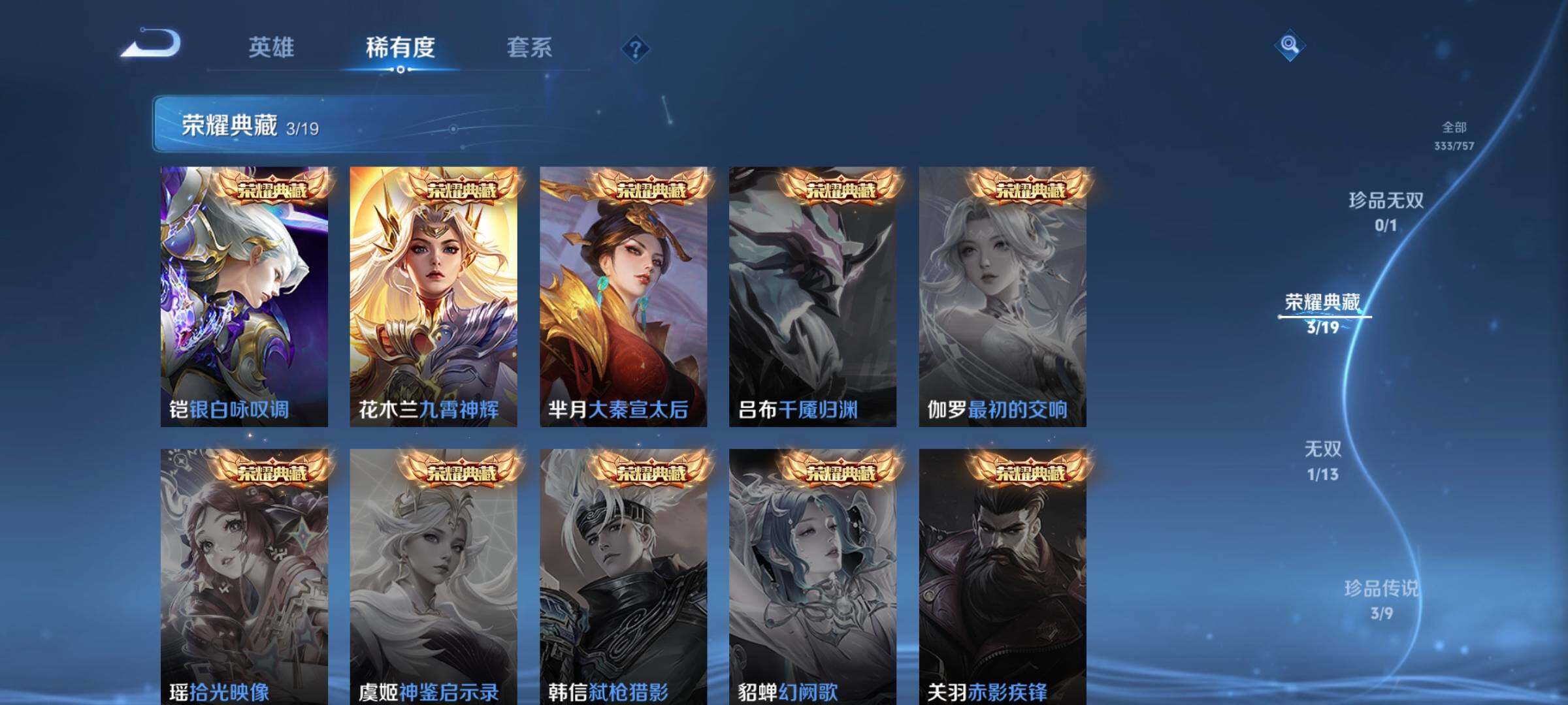 裴擒虎李小龙,吕布御风骁将,黄忠烈魂,典韦岱宗,曹操天狼征服者,铠青龙志,孙悟空大圣娶亲,孙悟空至尊宝,孙悟空孙行者,墨子降魔,李白诗剑行,桑启鸣野蒿,澜愿照·九州拓,蔡文姬愿照·福禄聚,虞姬愿照·岁时盈,司空震愿照·山河定,妲己愿照·众生和,女娲愿照·千秋盛