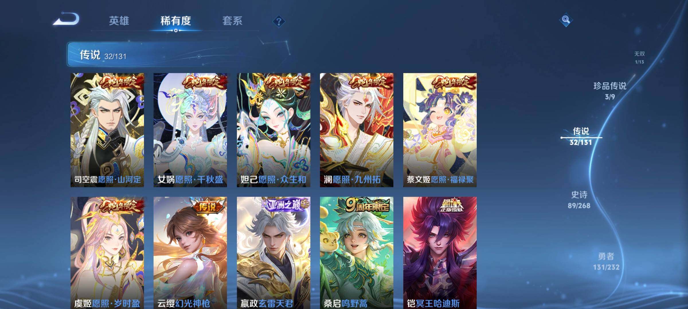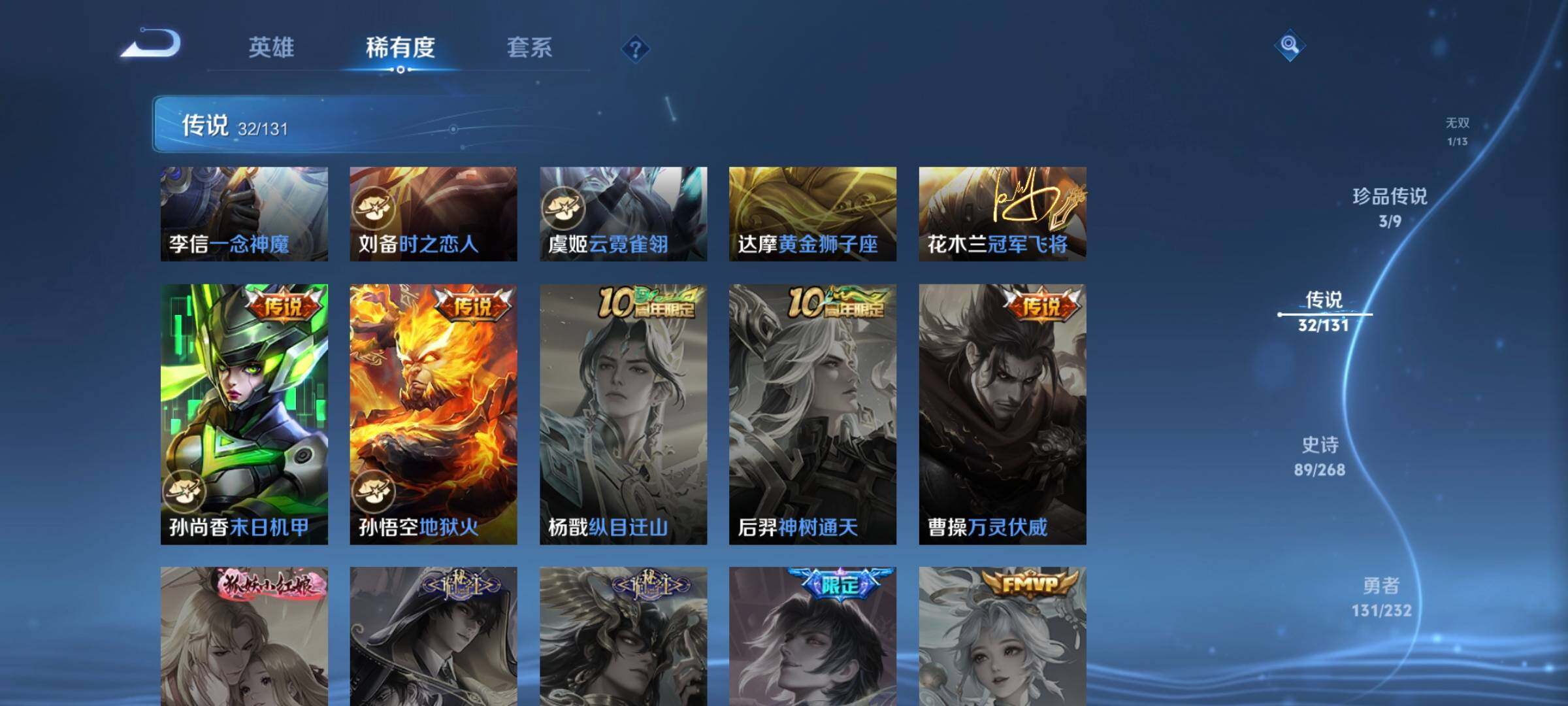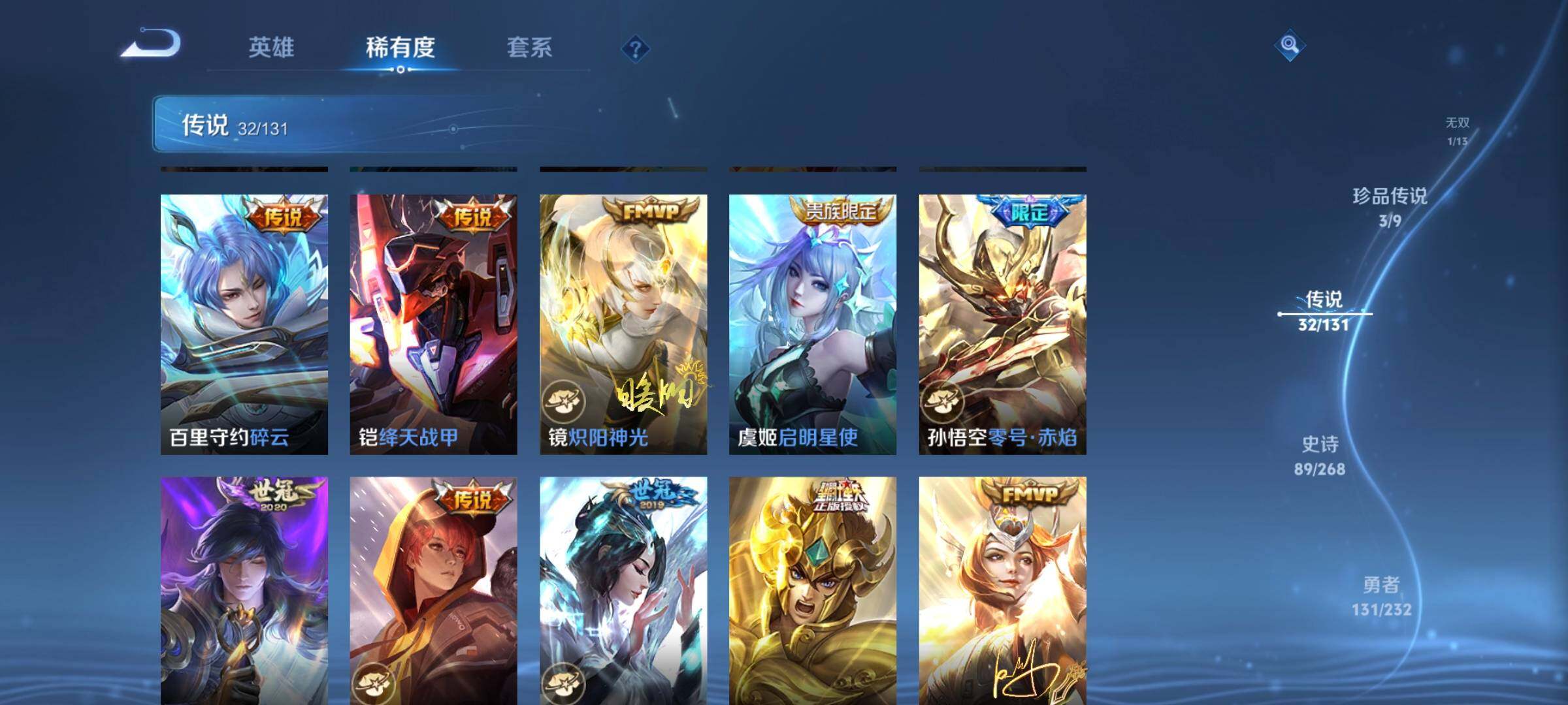 【传说皮肤】:司空震愿照山河定,女娲愿照千秋盛,妲己愿照众生和,澜愿照九州拓,蔡文姬愿照福禄聚,虞姬愿照岁时盈,云缨幻光神枪,嬴政玄雷天君,桑启鸣野蒿,铠冥王哈迪斯,墨子黄金天蝎座,孙策乘龙淬吴钩,澜逐花归海,狄仁杰夜礼服假面,王昭君永恒水手月亮,宫本武藏惊梅引,马可波罗妄想实况,澜电玩雷克斯,李信山海炽霜斩,李白诗剑行,百里守约碎云,铠绛天战甲,镜炽阳神光,虞姬启明星使,孙悟空零号赤焰,李信一念神魔,刘备时之恋人,虞姬云霓雀翎,达摩黄金狮子座,花木兰冠军飞将,孙尚香末日机甲,孙悟空地狱火