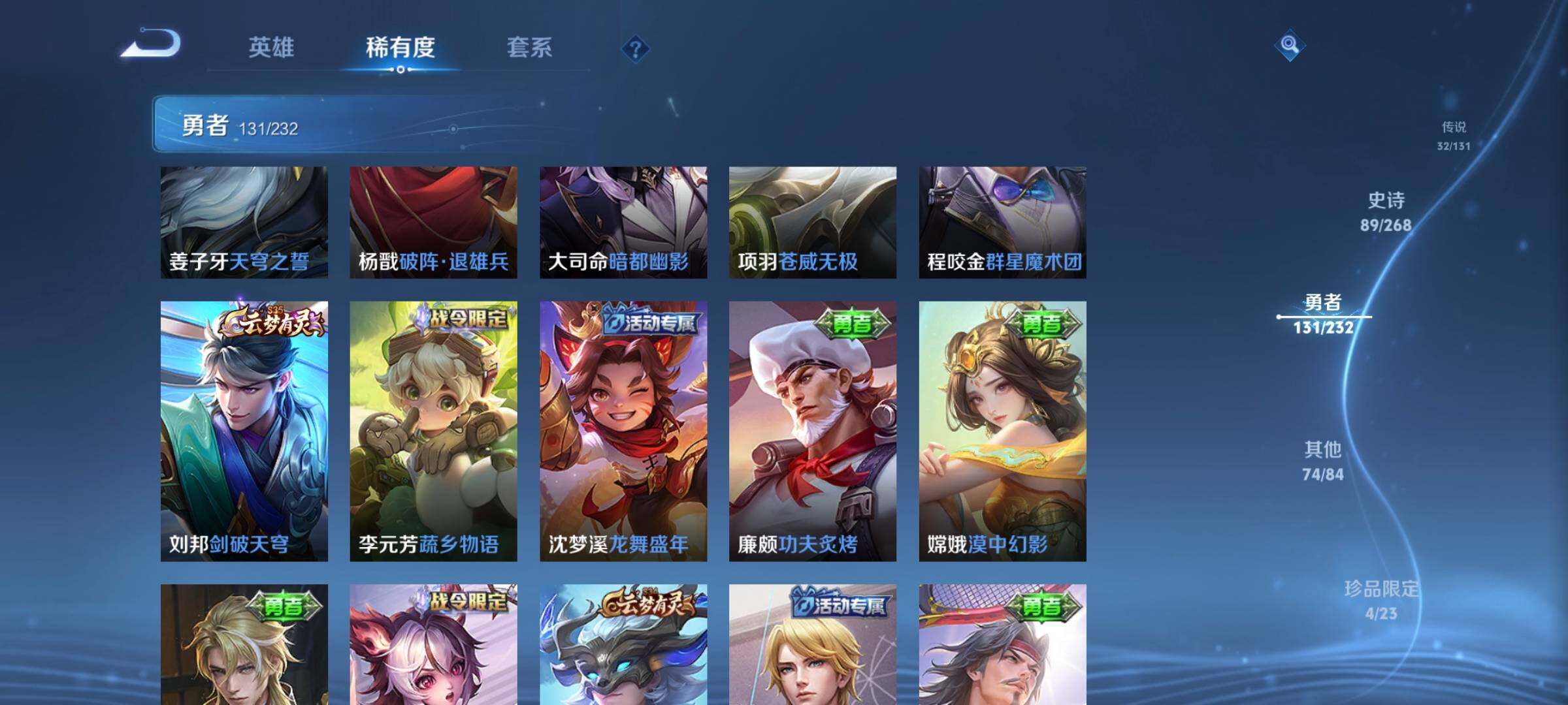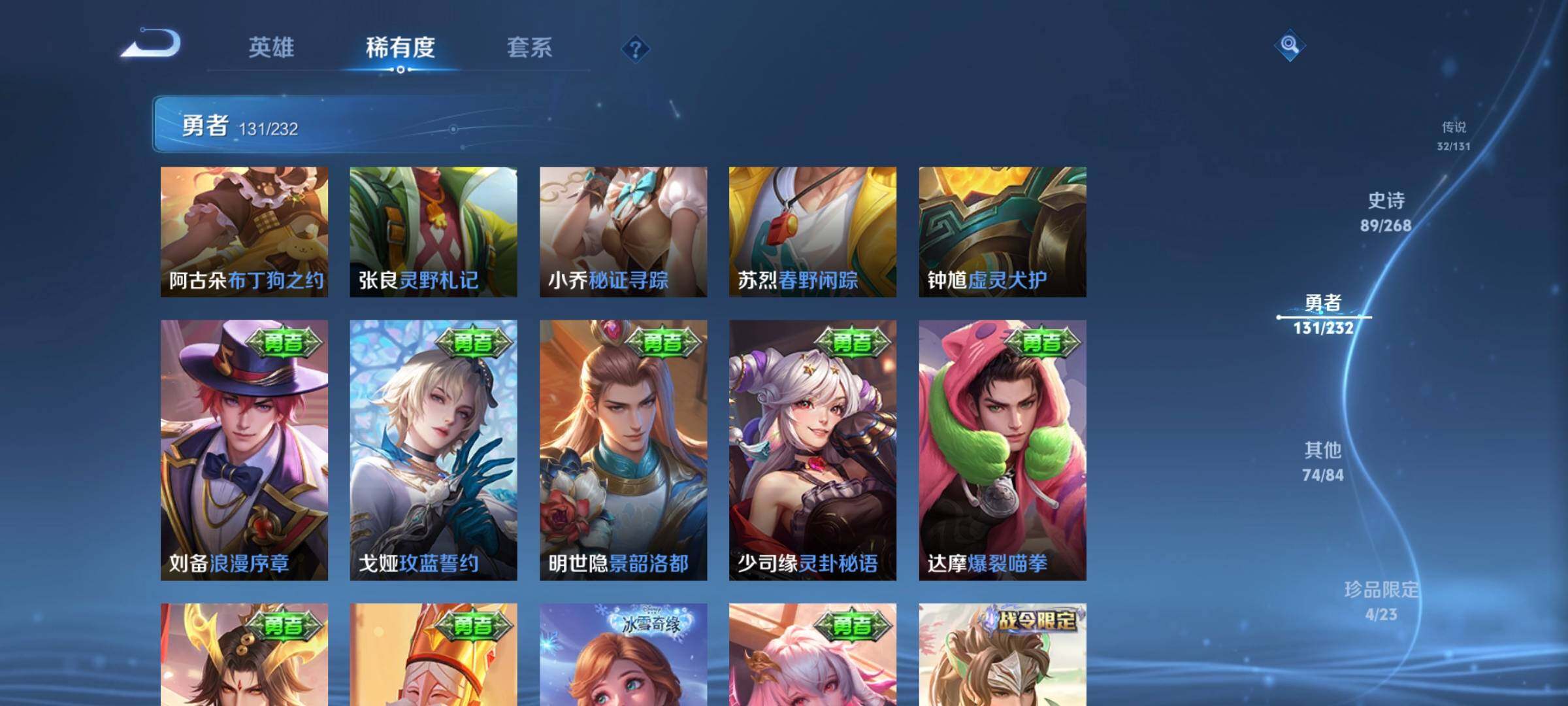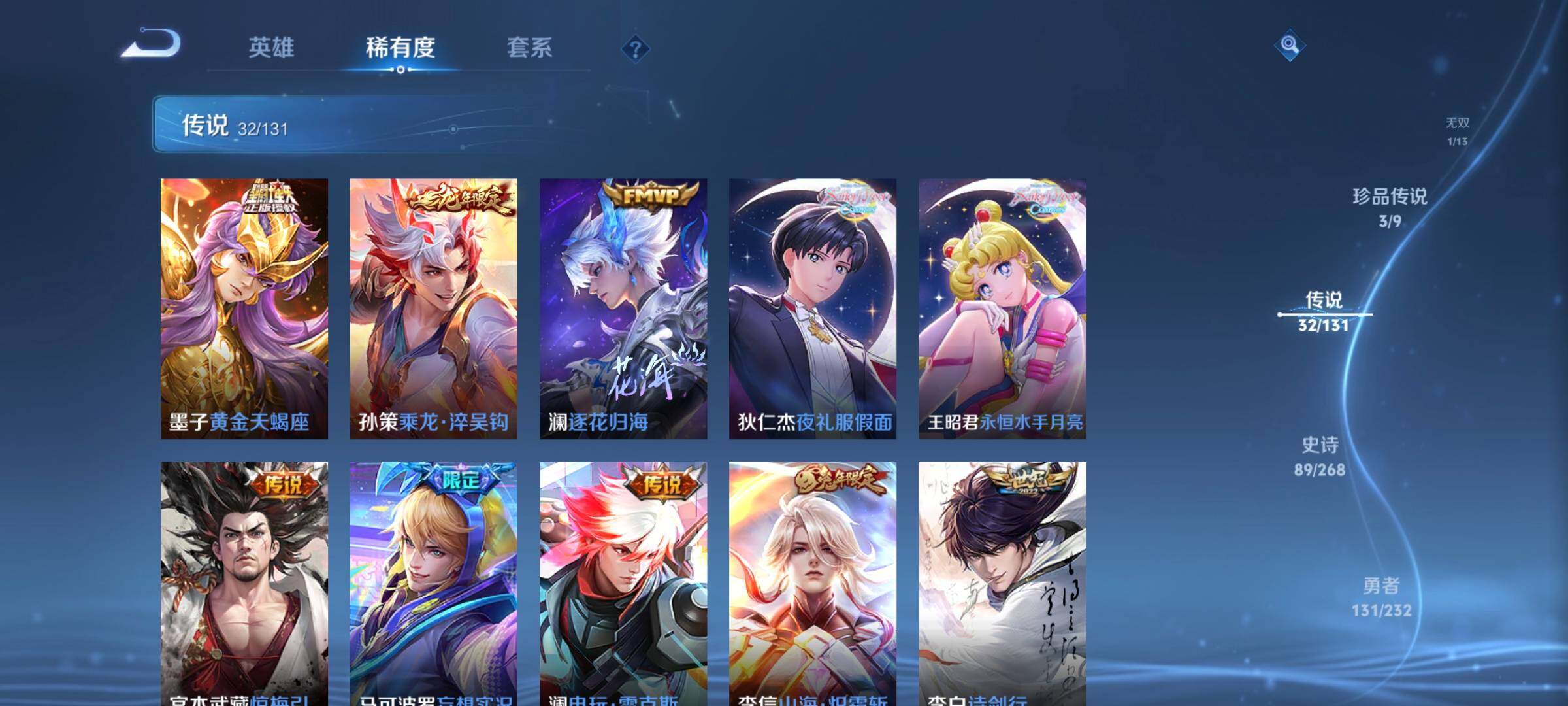 - PX_2095955-贵族等级: V4 英雄数: 110 皮肤数: 121 传说皮: 仲夏夜之梦,永恒水手月亮,澜逐花归海,乘龙·铭钟鼎,黄金天蝎座 限定皮: 李小龙,梁祝,魔法小厨娘,乒乒小将,鸣野蒿