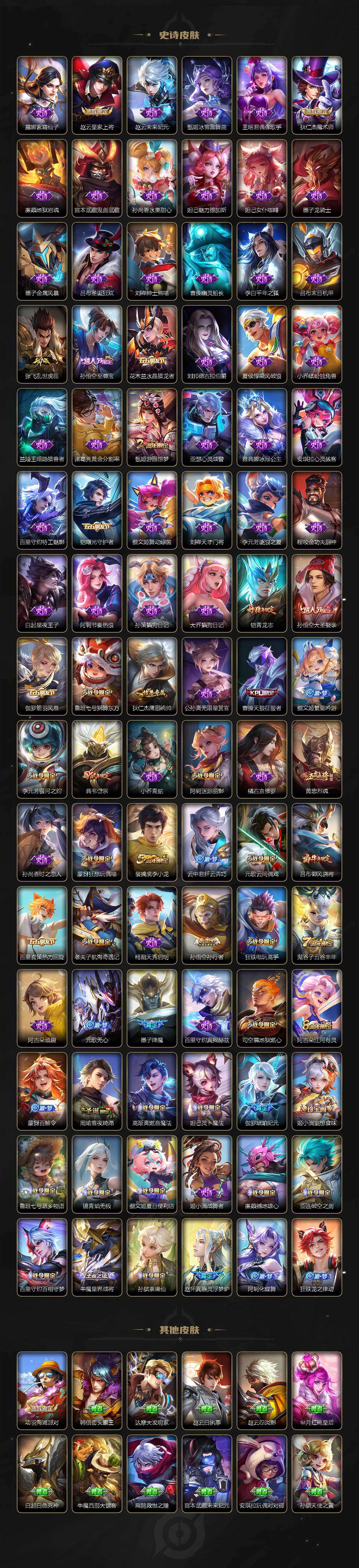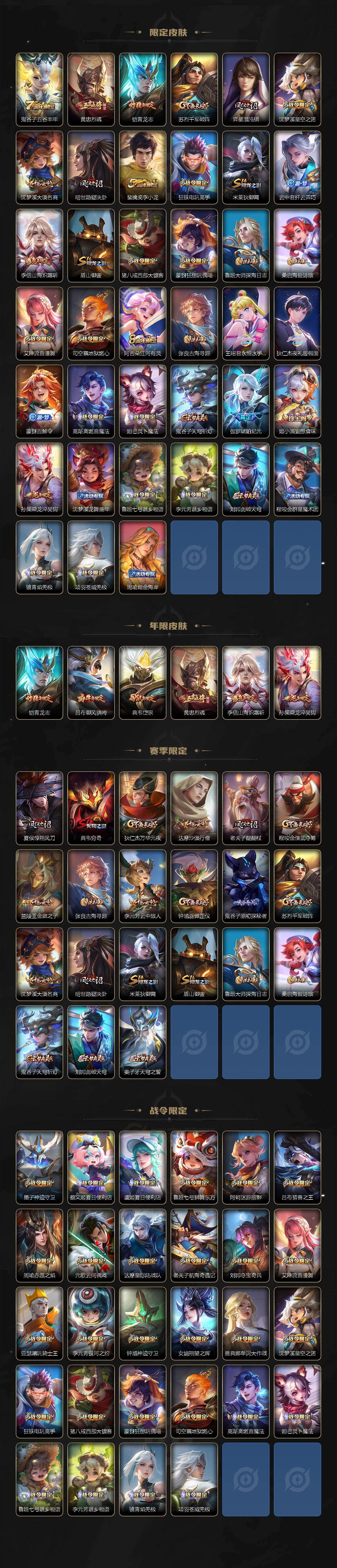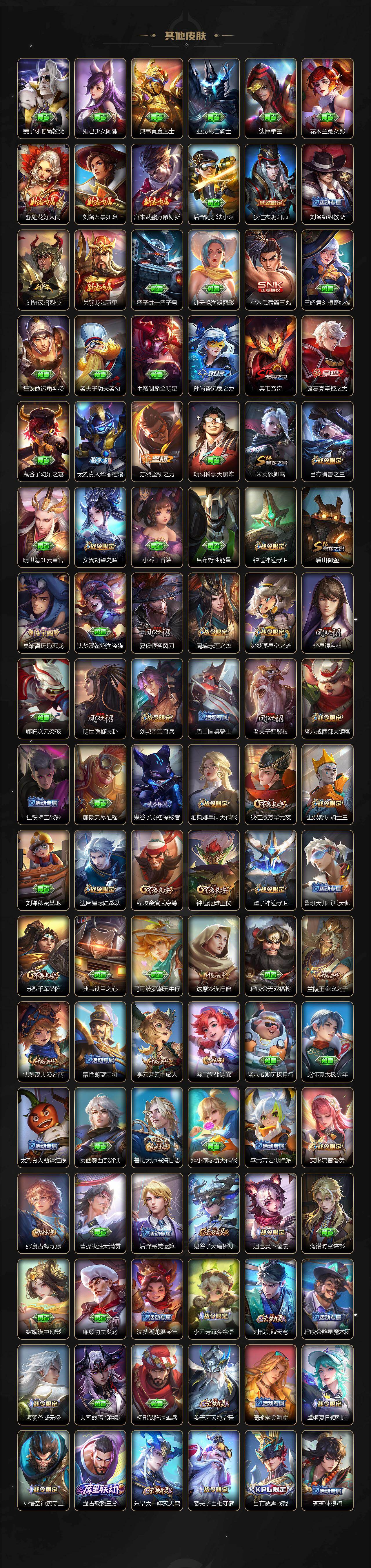 【限定皮肤】:铠冥王哈迪斯,蔡文姬夏日便利店,虞姬夏日便利店,姜子牙天穹之誓,杨戬破阵退雄兵,狄仁杰阴阳师,赵云皇家上将,墨子神迹守卫,墨子降魔,鲁班七号狮舞东方,高渐离玩趣恶龙,阿轲迷踪丽影,吕布猎兽之王,吕布御风骁将,周瑜赤莲之焰,元歌云间偶戏,元歌无心,夏侯惇朔风刀,甄姬游园惊梦,曹操天狼征服者,典韦穷奇,典韦岱宗,马可波罗妄想实况,狄仁杰魔术师,狄仁杰万华元夜,达摩星际陆战队,达摩沙漠行僧,项羽海滩派对,老夫子醍醐杖,老夫子航海奇遇记,程咬金演武夺筹,刘邦夺宝奇兵,兰陵王金庭之子,亚瑟潮玩骑士王,孙悟空至尊宝,孙悟空大圣娶亲,孙悟空零号赤焰,孙悟空孙行者,李元芳银河之约,李元芳云中旅人,虞姬启明星使,钟馗神迹守卫,钟馗驱傩正仪,女娲朔望之晖,雅典娜单词大作战,蔡文姬繁星吟游,太乙真人华丽摇滚,鬼谷子原初探秘者,鬼谷子五谷丰年,黄忠烈魂,铠青龙志,苏烈千军破阵,弈星混沌棋,沈梦溪星空之诺,沈梦溪大漠名商,明世隐疑决卦,裴擒虎李小龙,狂铁电玩高手,米莱狄御霄,云中君纤云弄巧,李信山海炽霜斩,盾山御銮,猪八戒西部大镖客,蒙犽狂想玩偶喵,鲁班大师探海日志,桑启海盐诗旅,艾琳流音漫舞,司空震地狱燃心,阿古朵江河有灵,张良古海寻踪,王昭君永恒水手月亮,狄仁杰夜礼服假面,蒙犽百解令,高渐离燃音魔法,妲己灵卜魔法,鬼谷子天穹祈灯,伽罗琥