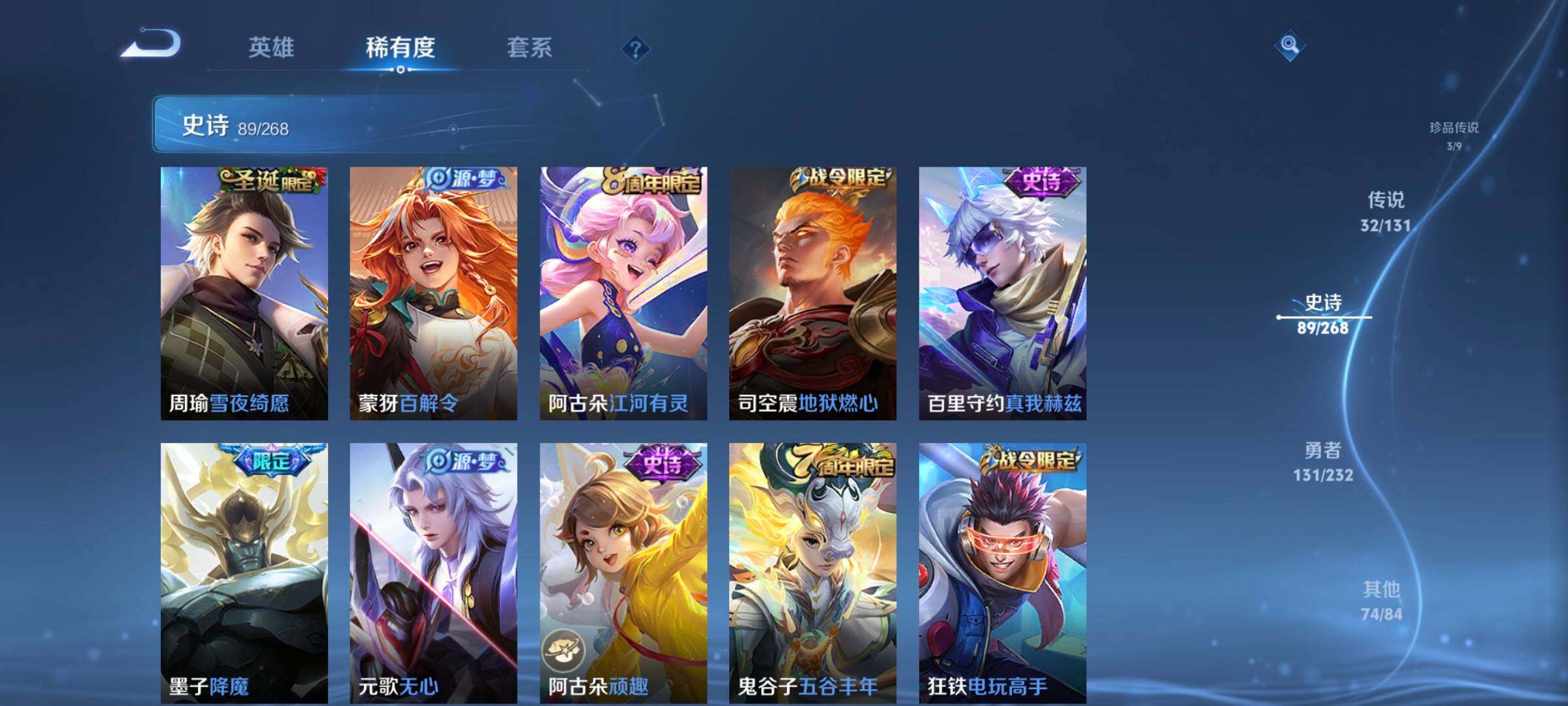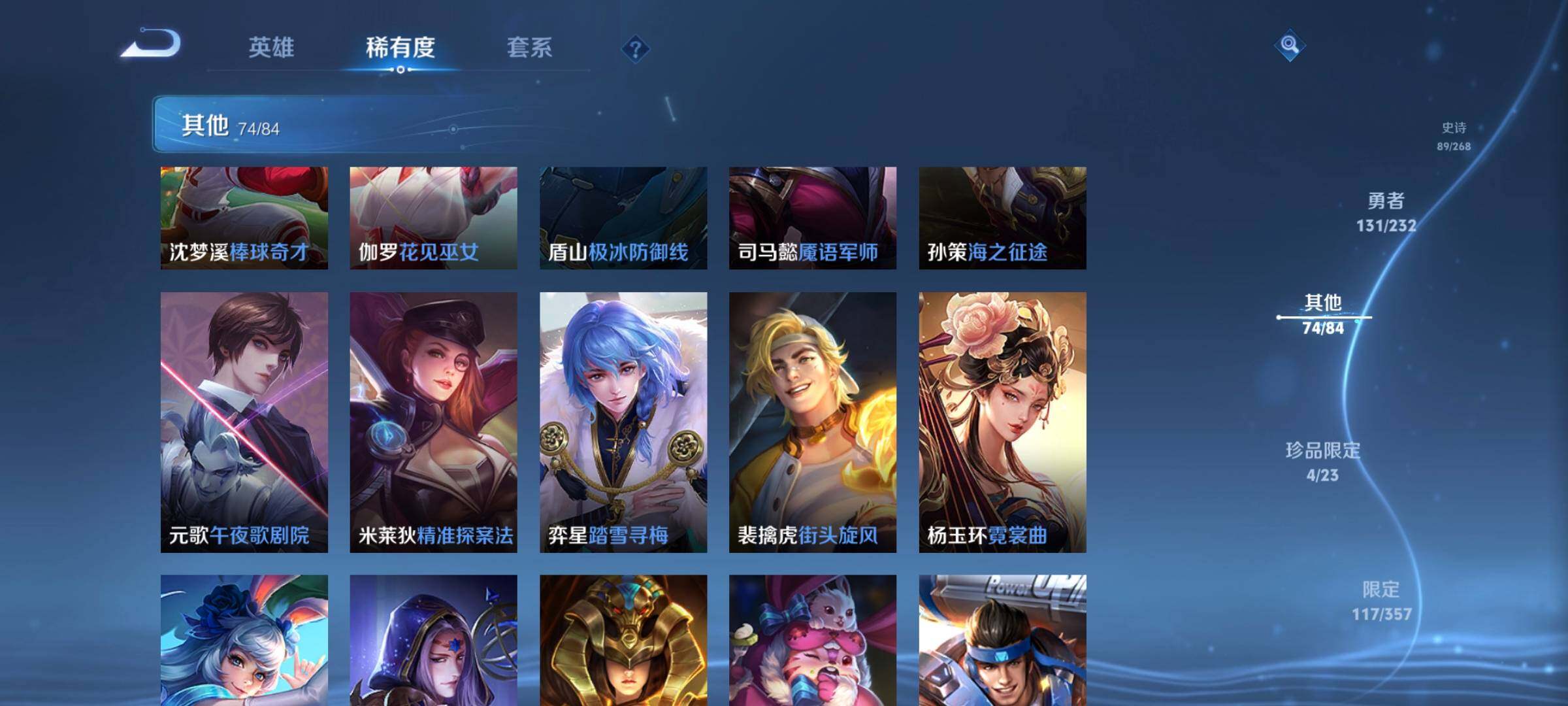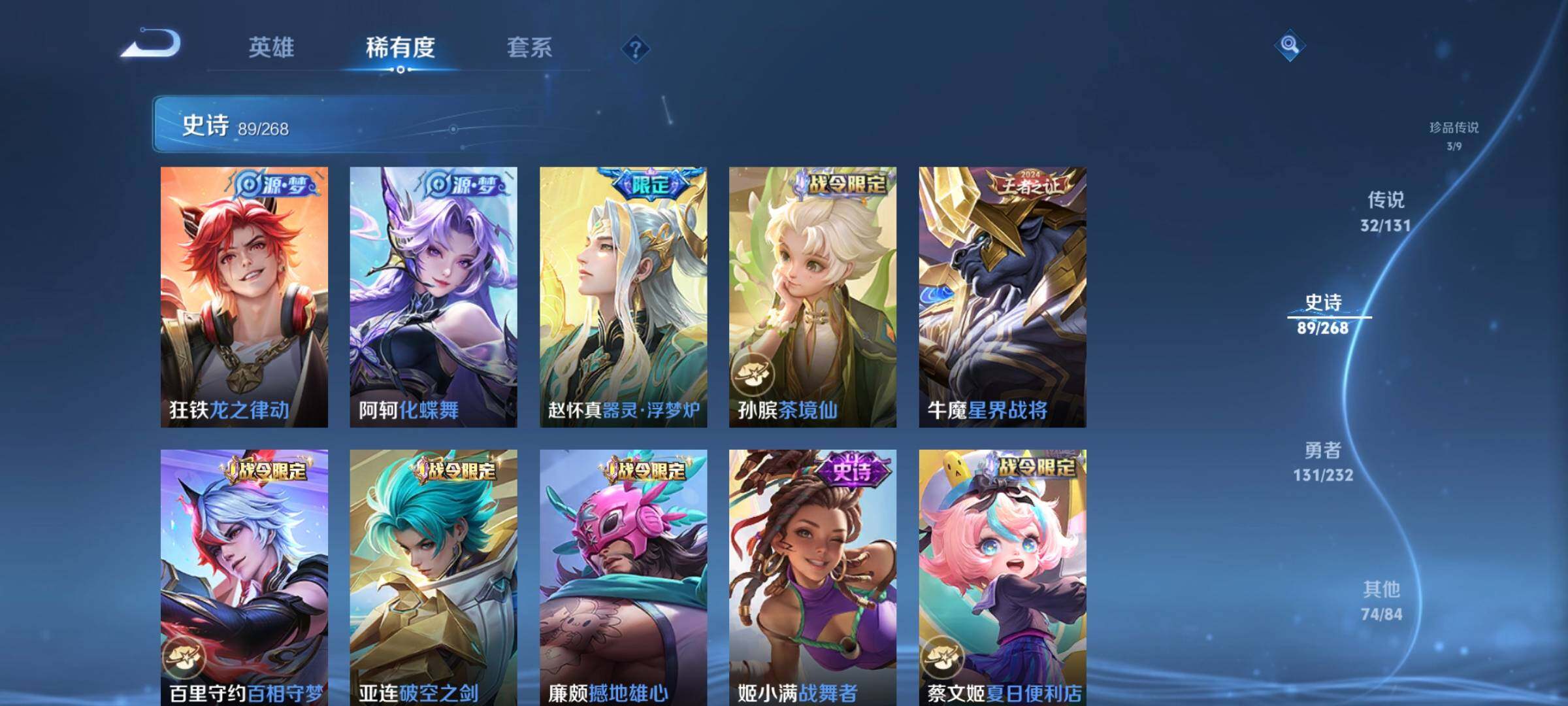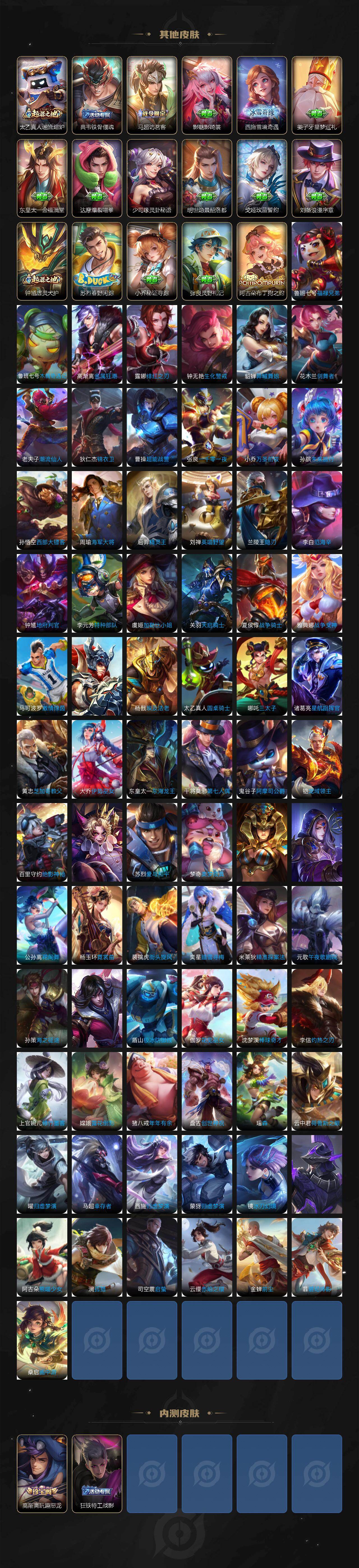 【限定皮肤】:铠冥王哈迪斯,蔡文姬夏日便利店,虞姬夏日便利店,姜子牙天穹之誓,杨戬破阵退雄兵,狄仁杰阴阳师,赵云皇家上将,墨子神迹守卫,墨子降魔,鲁班七号狮舞东方,高渐离玩趣恶龙,阿轲迷踪丽影,吕布猎兽之王,吕布御风骁将,周瑜赤莲之焰,元歌云间偶戏,元歌无心,夏侯惇朔风刀,甄姬游园惊梦,曹操天狼征服者,典韦穷奇,典韦岱宗,马可波罗妄想实况,狄仁杰魔术师,狄仁杰万华元夜,达摩星际陆战队,达摩沙漠行僧,项羽海滩派对,老夫子醍醐杖,老夫子航海奇遇记,程咬金演武夺筹,刘邦夺宝奇兵,兰陵王金庭之子,亚瑟潮玩骑士王,孙悟空至尊宝,孙悟空大圣娶亲,孙悟空零号赤焰,孙悟空孙行者,李元芳银河之约,李元芳云中旅人,虞姬启明星使,钟馗神迹守卫,钟馗驱傩正仪,女娲朔望之晖,雅典娜单词大作战,蔡文姬繁星吟游,太乙真人华丽摇滚,鬼谷子原初探秘者,鬼谷子五谷丰年,黄忠烈魂,铠青龙志,苏烈千军破阵,弈星混沌棋,沈梦溪星空之诺,沈梦溪大漠名商,明世隐疑决卦,裴擒虎李小龙,狂铁电玩高手,米莱狄御霄,云中君纤云弄巧,李信山海炽霜斩,盾山御銮,猪八戒西部大镖客,蒙犽狂想玩偶喵,鲁班大师探海日志,桑启海盐诗旅,艾琳流音漫舞,司空震地狱燃心,阿古朵江河有灵,张良古海寻踪,王昭君永恒水手月亮,狄仁杰夜礼服假面,蒙犽百解令,高渐离燃音魔法,妲己灵卜魔法,鬼谷子天穹祈灯,伽罗琥