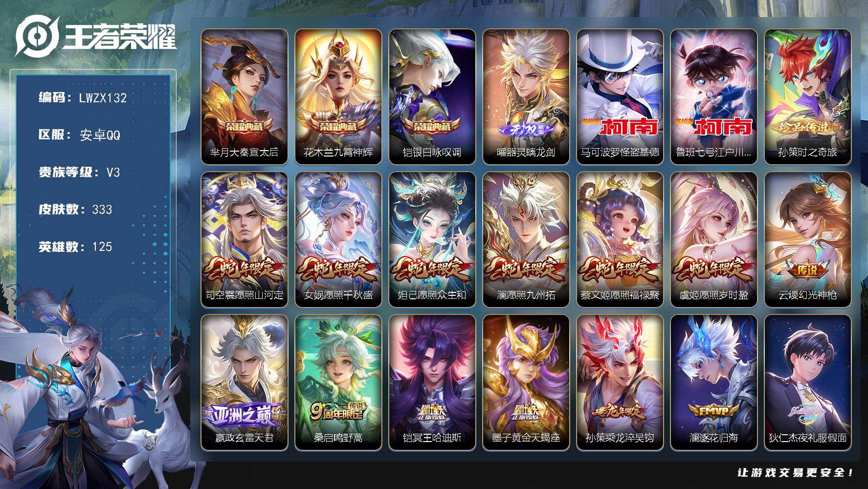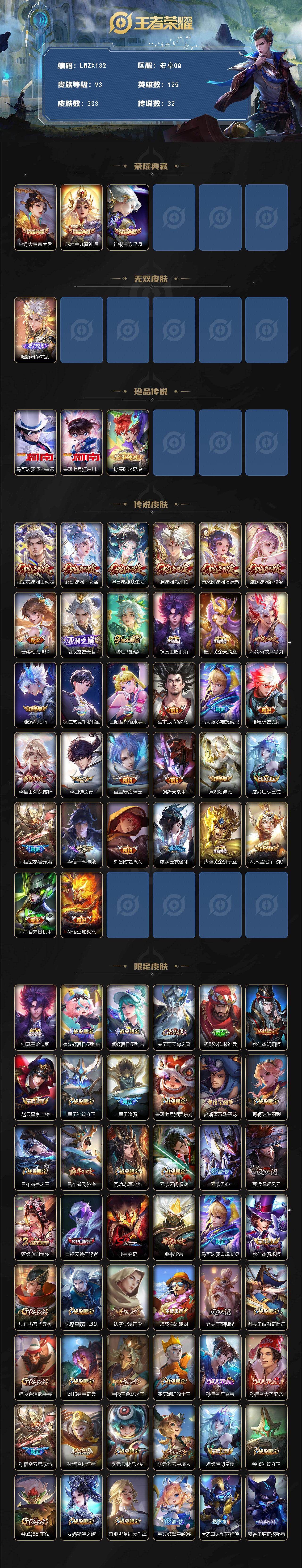 [15578048]【特价出售/店主推荐】安卓Q-V3-最强王者段位-125英雄-333皮肤-3典藏皮肤-1无双-3珍品传说-32传说-89史诗