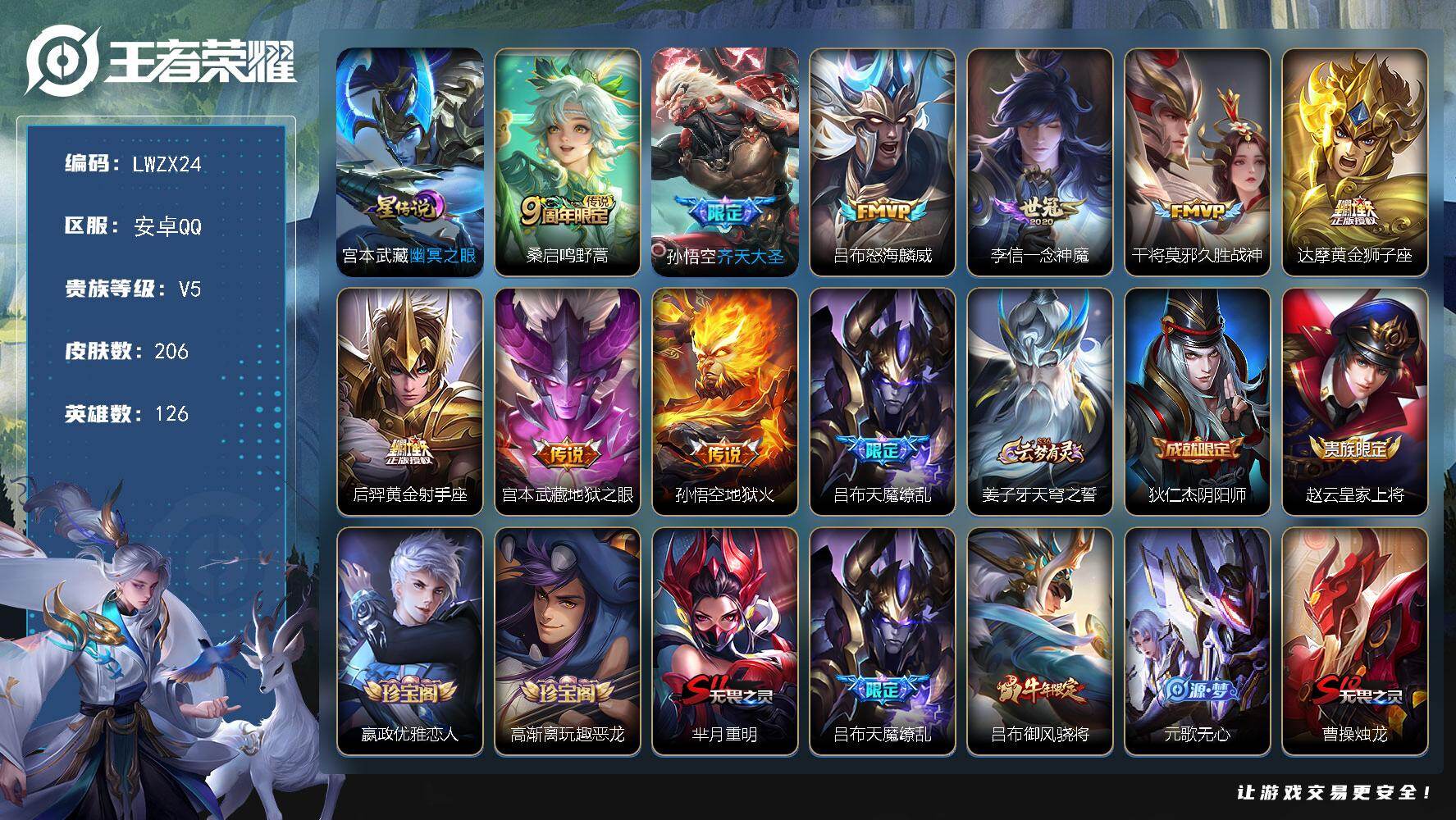 [15578281]【特价出售/店主推荐】,安卓Q-V5-最强王者段位-126英雄-206皮肤-10传说-61史诗