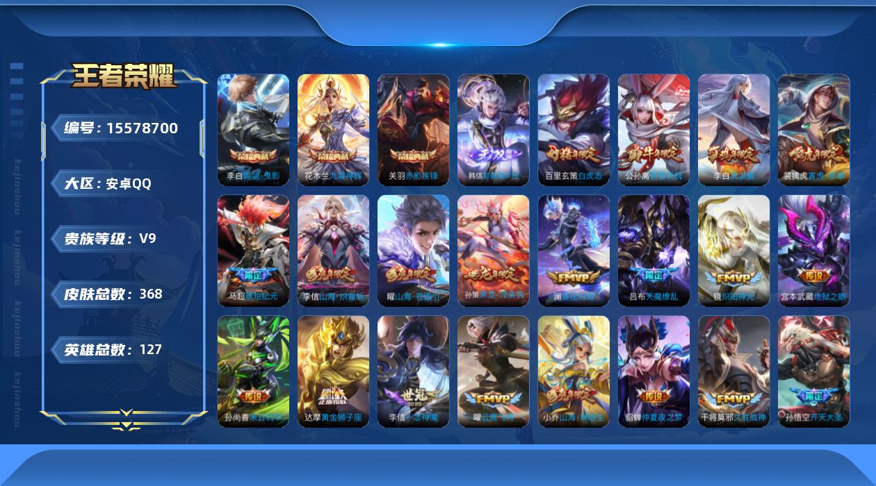 - [12242544]【商品标题】:安卓Q-V5-至尊星耀V段位-122英雄-230皮肤-0典藏-0珍品无双-0无双-0珍品传说-7传说-56史诗 【内测皮肤】:艾琳女武神,狂铁特工战影 【传说皮肤】:狄仁杰超时空战士,李信一念神魔,马超无双飞将,李白诗剑行,桑启鸣野蒿,云缨幻光神枪,澜愿照九州拓 【限定皮肤】:大乔绒语心约,姜子牙天穹之誓,李白谪仙醉月,狄仁杰阴阳师,赵云皇家上将,赵云百木心枪,元歌无心,马可波罗山海玄木吟,狄仁杰魔术师,狄仁杰万华元夜,达摩沙漠行僧,项羽海滩派对,兰陵王金庭之子,花木兰瑞麟志,孙悟空孙行者,李元芳云中旅人,钟馗驱傩正仪,鬼谷子五谷丰年,沈梦溪大漠名商,裴擒虎李小龙,裴擒虎擒涛扼浪,云中君纤云弄巧,上官婉儿梁祝,嫦娥拒霜思,嫦娥暖冬兔眠,西施玲珑珍味,鲁班大师探海日志,桑启海盐诗旅,暃星界游侠,戈娅驭风魔法,艾琳女武神,阿古朵江河有灵,张良古海寻踪,蒙犽百解令,高渐离燃音魔法,妲己灵卜魔法,鬼谷子天穹祈灯,姬小满妄想食味,沈梦溪龙舞盛年,刘邦剑破天穹,程咬金群星魔术团,镜青焰无极,项羽苍威无极,刘备异域游侠,周瑜熔金海岸 【年限皮肤】:花木兰瑞麟志,马可波罗山海玄木吟 【赛季限定】:狄仁杰万华元夜,达摩沙漠行僧,兰陵王金庭之子,张良古海寻踪,李元芳云中旅人,钟馗驱傩正仪,沈梦溪大漠名商,裴擒虎擒涛扼浪,鲁班大师探海日志,桑启海盐诗旅,鬼谷子天穹祈灯,刘邦剑破天穹,姜子牙天穹之誓 【战令限定】:嫦娥暖冬兔眠,西施玲珑珍味,暃星界游侠,戈娅驭风魔法,高渐离燃音魔法,妲己灵卜魔法,镜青焰无极,项羽苍威无极 【史诗皮肤】:露娜紫霞仙子,赵云皇家上将,赵云未来纪元,貂蝉圣诞恋歌,甄姬冰雪圆舞曲,狄仁杰魔术师,宫本武藏鬼剑武藏,孙尚香水果甜心,嬴政摇滚巨星,妲己魅力维加斯,妲己女仆咖啡,墨子金属风暴,张飞乱世虎臣,花木兰水晶猎龙者,刘邦德古拉伯爵,夏侯惇乘风破浪,小乔缤纷独角兽,兰陵王暗隐猎兽者,雅典娜冰冠公主,百里守约特工魅影,铠曙光守护者,李元芳逐浪之夏,白起星夜王子,孙策猫狗日记,花木兰瑞麟志,狄仁杰鹰眼统帅,上官婉儿梁祝,裴擒虎李小龙,云中君纤云弄巧,百里玄策热力回旋,钟馗乐园奇幻夜,孙悟空孙行者,司马懿暗渊魔法,嫦娥拒霜思,夏洛特永昼,赵云百木心枪,澜赏金猎手,鬼谷子五谷丰年,元歌无心,暃星界游侠,马可波罗山海玄木吟,镜玫瑰异探,刘禅电玩爆裂旋风,戈娅驭