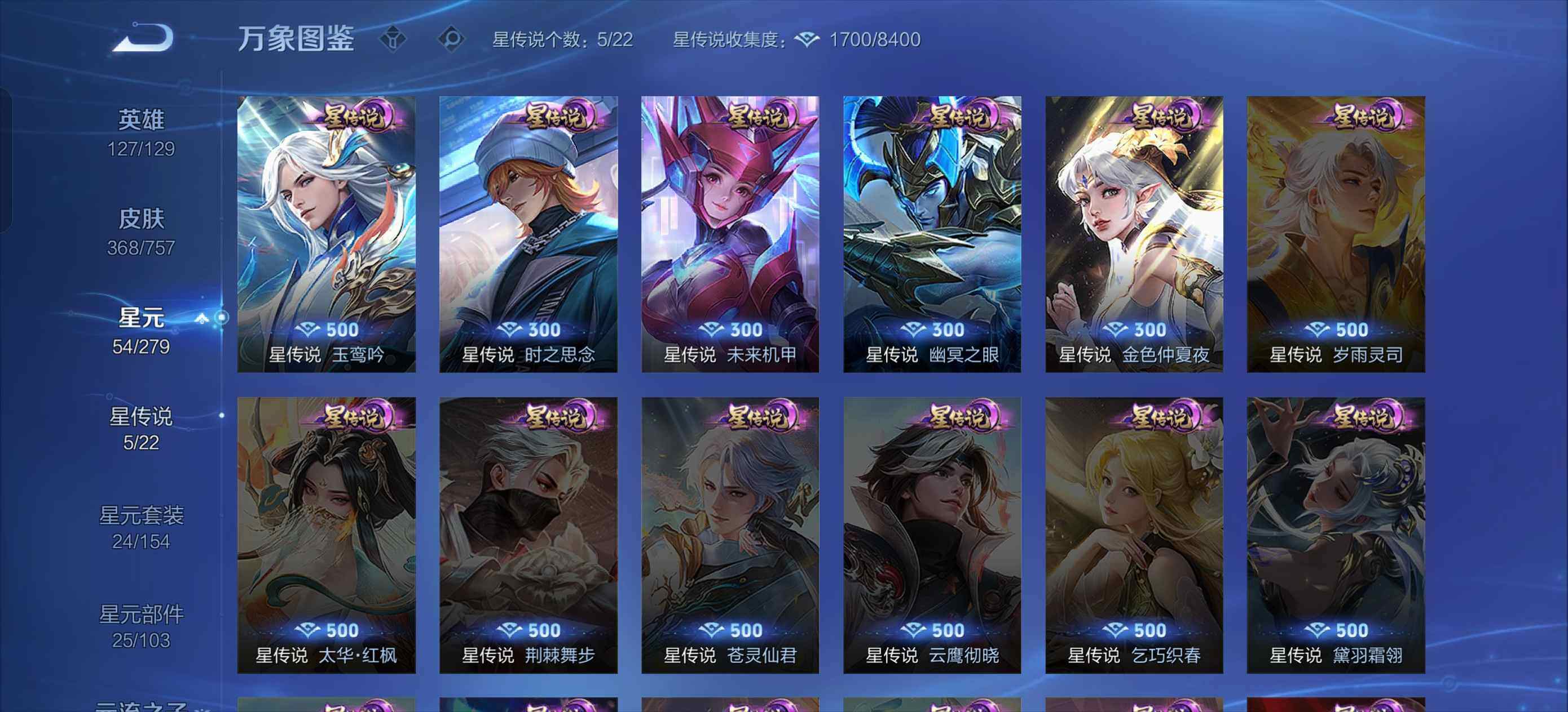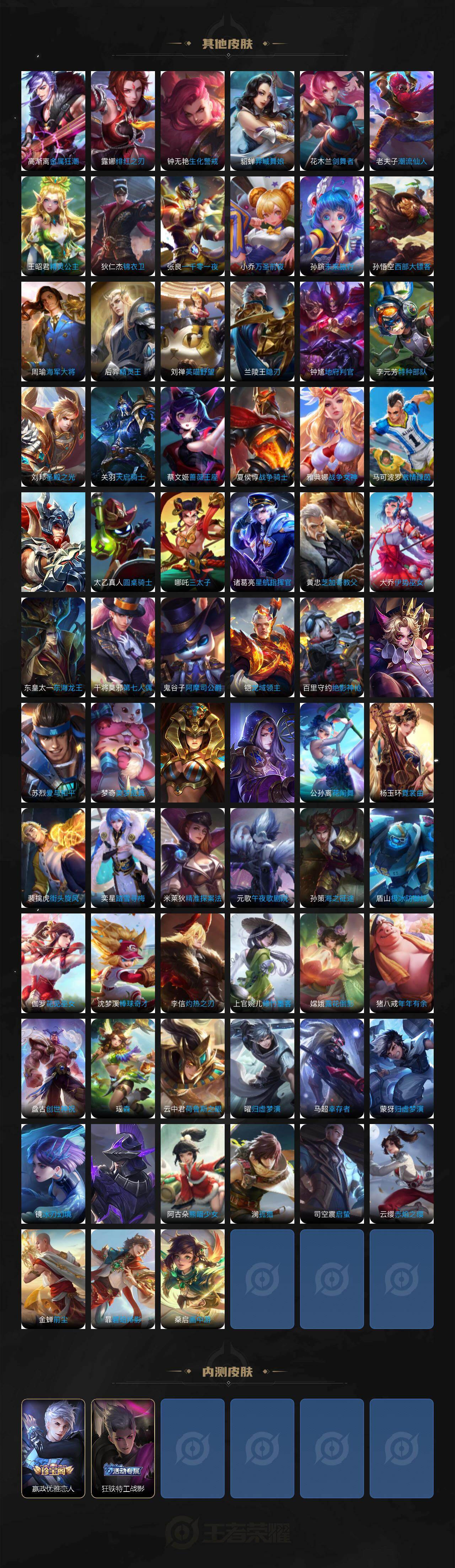 关羽冰锋战神,上官婉儿梁祝,牛魔奔雷神使,公孙离祈雪灵祝,赵云龙胆,黄忠烈魂,马超神威,马可波罗逐梦之星,韩信逐梦之影,铠青龙志,百里玄策白虎志,王昭君凤凰于飞,虞姬霸王别姬,周瑜真爱至上,孙悟空大圣娶亲,露娜一生所爱,孙悟空至尊宝,干将莫邪冰霜恋舞曲,公孙离蜜橘之夏,芈月白晶晶,猪八戒猪悟能,孙悟空孙行者,镜匿光追影者,鲁班七号寅虎·瑞焰,裴擒虎寅虎·赤拳,云中君时之祈愿,公孙离玉兔公主,马可波罗山海·玄木吟,瑶山海·碧波行