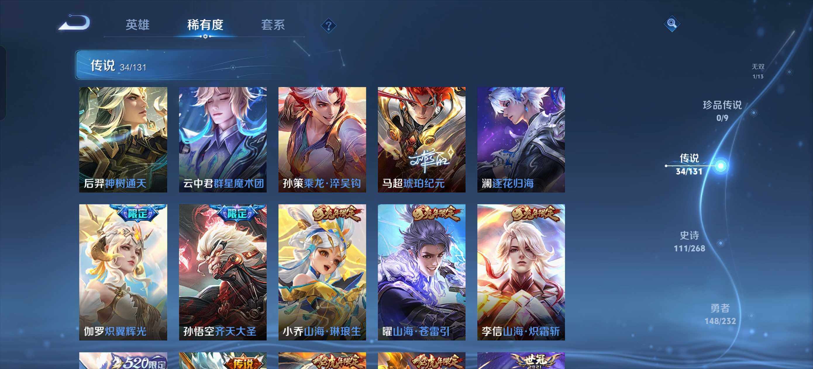 【传说皮肤】:后羿神树通天,云中君群星魔术团,孙策乘龙淬吴钩,马超琥珀纪元,澜逐花归海,伽罗炽翼辉光,孙悟空齐天大圣,小乔山海琳琅生,曜山海苍雷引,李信山海炽霜斩,孙策挚爱之约,孙策末日机甲,裴擒虎寅虎赤拳,鲁班七号寅虎瑞焰,赵云淬星耀世,周瑜音你心动,李元芳飞鸢探春,公孙离祈雪灵祝,镜炽阳神光,虞姬启明星使,曜云鹰飞将,李信一念神魔,刘备时之恋人,张良黄金白羊座,干将莫邪久胜战神,达摩黄金狮子座,百里玄策白虎志,花木兰冠军飞将,貂蝉仲夏夜之梦,李白凤求凰,孙尚香末日机甲,宫本武藏地狱之眼,吕布天魔缭乱,狄仁杰超时空战士