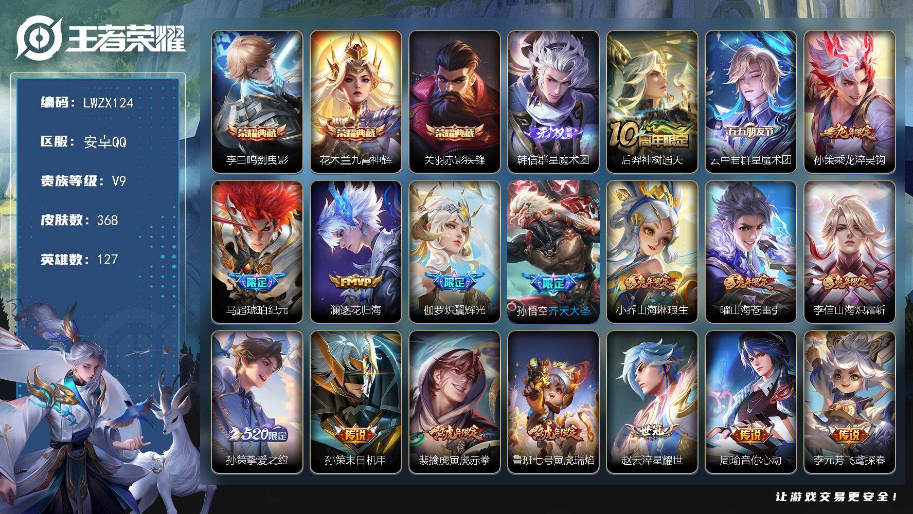 [15578700]【店主推荐捡漏号!可直接换绑】和平带怪诞乔克 安卓Q-V9-最强王者段位-127英雄-368皮肤-3典藏皮肤-1无双-34传说-111史诗 【英雄全皮】:阿轲全皮,云中君全皮,李信全皮,海诺全皮 【荣耀典藏】:李白鸣剑曳影,花木兰九霄神辉,关羽赤影疾锋 【无双皮肤】:韩信群星魔术团 【传说皮肤】:后羿神树通天,云中君群星魔术团,孙策乘龙淬吴钩,马超琥珀纪元,澜逐花归海,伽罗炽翼辉光,孙悟空齐天大圣,小乔山海琳琅生,曜山海苍雷引,李信山海炽霜斩,孙策挚爱之约,孙策末日机甲,裴擒虎寅虎赤拳,鲁班七号寅虎瑞焰,赵云淬星耀世,周瑜音你心动,李元芳飞鸢探春,公孙离祈雪灵祝,镜炽阳神光,虞姬启明星使,曜云鹰飞将,李信一念神魔,刘备时之恋人,张良黄金白羊座,干将莫邪久胜战神,达摩黄金狮子座,百里玄策白虎志,花木兰冠军飞将,貂蝉仲夏夜之梦,李白凤求凰,孙尚香末日机甲,宫本武藏地狱之眼,吕布天魔缭乱,狄仁杰超时空战士 【限定皮肤】:白起狰,大乔绒语心约,姜子牙天穹之誓,杨戬破阵退雄兵,狄仁杰阴阳师,虞姬凯尔特女王,小乔山海琳琅生,赵云皇家上将,赵云龙胆,墨子神迹守卫,嬴政优雅恋人,嬴政白昼王子,鲁班七号狮舞东方,鲁班七号寅虎瑞焰,高渐离死亡摇滚,阿轲迷踪丽影,扁鹊炼金王,芈月重明,芈月白晶晶,吕布天魔缭乱,吕布猎兽之王,周瑜真爱至上,周瑜赤莲之焰,元歌云间偶戏,元歌无心,夏侯惇朔风刀,曹操烛龙,典韦穷奇,典韦蓝屏警告,马可波罗逐梦之星,马可波罗山海玄木吟,狄仁杰魔术师,狄仁杰万华元夜,达摩沙漠行僧,项羽海滩派对,老夫子醍醐杖,老夫子航海奇遇记,关羽冰锋战神,程咬金演武夺筹,露娜一生所爱,刘邦夺宝奇兵,韩信逐梦之影,王昭君凤凰于飞,兰陵王驯魔猎人,兰陵王金庭之子,亚瑟潮玩骑士王,孙悟空至尊宝,孙悟空大圣娶亲,孙悟空孙行者,孙悟空齐天大圣,牛魔御旌,牛魔奔雷神使,李元芳银河之约,李元芳云中旅人,虞姬霸王别姬,虞姬启明星使,钟馗神迹守卫,钟馗驱傩正仪,女娲朔望之晖,干将莫邪冰霜恋舞曲,雅典娜黎明之约,蔡文姬繁星吟游,太乙真人饕餮,太乙真人华丽摇滚,鬼谷子原初探秘者,鬼谷子五谷丰年,黄忠烈魂,铠青龙志,苏烈千军破阵,百里玄策白虎志,百里玄策原初追逐者,弈星混沌棋,梦奇顽趣,公孙离蜜橘之夏,公孙离祈雪灵祝,公孙离玉兔公主,沈梦溪星空之诺,沈梦溪大漠名商,明世隐疑决卦,裴擒虎寅虎赤拳,裴擒虎擒