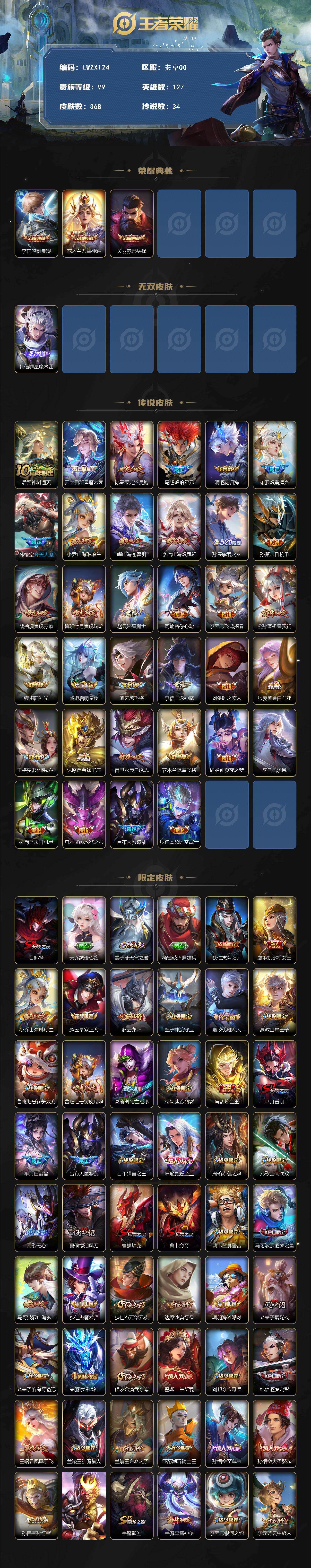 - [11520155]V8 1典藏 14传说 124英雄 292皮肤 典藏英雄武则天 可修改实名 优质装备:弑枪猎影(韩信典藏),黄金射手座,久胜战神,末日机甲-孙尚香(绿蚂蚱),地狱之眼,李逍遥,挚爱之约,浮生妄 传说皮:死亡执政官,九山相柳 珍宝阁皮:妄想食味,玩趣恶龙 限定皮:至尊宝,梅西,武陵仙君(小桃花),傲雪梅枪,星穹之声,山海·碧波行(瑶年限),遇见飞天,五谷丰年,冰锋战神,游园惊梦,梁祝,天狼狩猎者,岱宗(典韦年限),李小龙,玄武志(苏烈年限),永曜之星,辉光之辰,孙行者,一生所爱,冰霜恋舞曲,云端筑梦师,寅虎·御盾(廉颇年限),寅虎·赤拳(老虎年限),时之祈愿-云中君,匿光启智者,山海·玄木吟(马可年限) 史诗皮:化蝶舞,龙之律动,石田雨龙,茶境仙,百相守梦-黄忠,紫霞仙子,黄金分割率,特工魅影,千年之狐,魅语,蒙恬荣光圣徽,冰冠公主,偶像歌手,龙骑士(小龙虾),末日机甲-吕布,猫狗日记-孙策,猫狗日记-大乔,乱世虎臣,节奏热浪,女仆咖啡,摇滚巨星,水果甜心,天才门将,星夜王子,心灵骇客,功夫厨神,德古拉伯爵,暗隐猎兽者,幽灵船长,鬼剑武藏,暗渊魔法,心灵战警,乐园奇幻夜,地狱岩魂,纤云弄巧,缤纷独角兽,乘风破浪,逐浪之夏,水晶猎龙者,曙光守护者,金属风暴,原初追逐者,圣诞恋歌,鹰眼统帅,黎明之约,雪上飞焰,滕王阁序,寅虎·御盾,无心,未来纪元-赵云