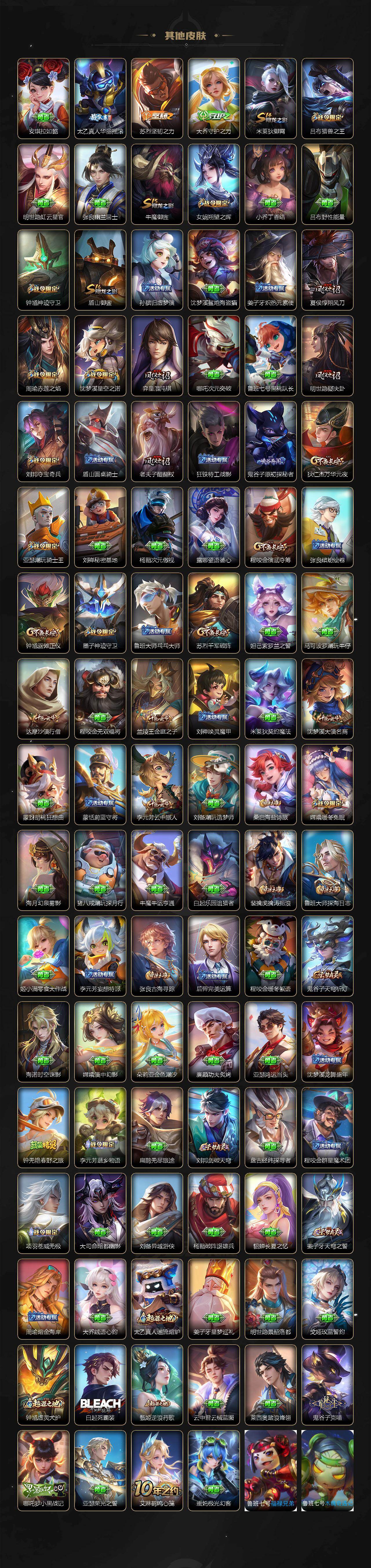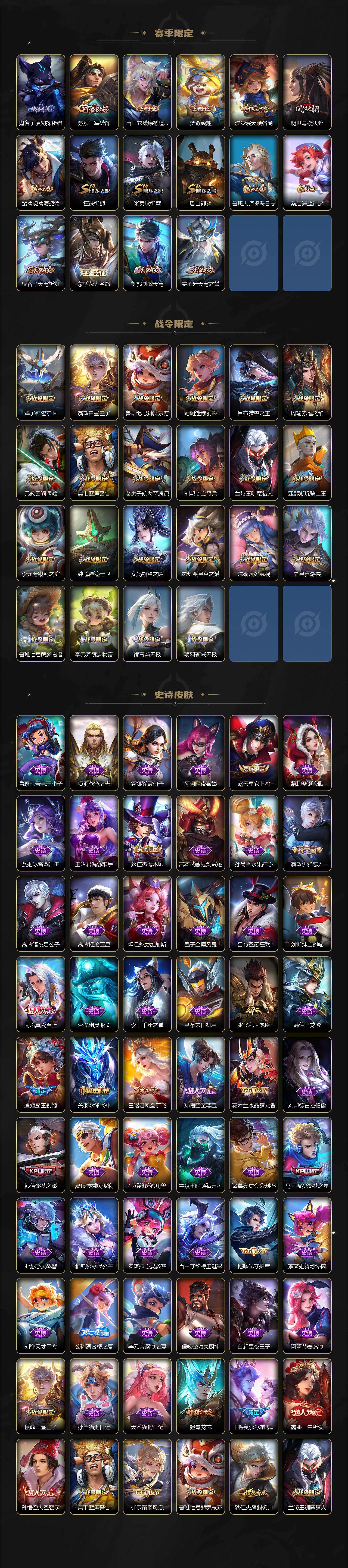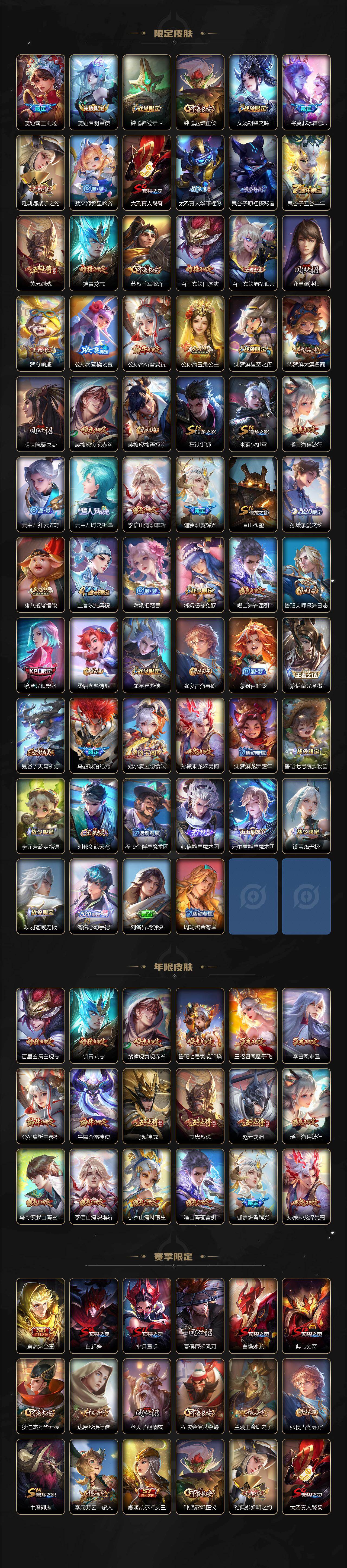 【限定皮肤】:白起狰,大乔绒语心约,姜子牙天穹之誓,杨戬破阵退雄兵,狄仁杰阴阳师,虞姬凯尔特女王,小乔山海琳琅生,赵云皇家上将,赵云龙胆,墨子神迹守卫,嬴政优雅恋人,嬴政白昼王子,鲁班七号狮舞东方,鲁班七号寅虎瑞焰,高渐离死亡摇滚,阿轲迷踪丽影,扁鹊炼金王,芈月重明,芈月白晶晶,吕布天魔缭乱,吕布猎兽之王,周瑜真爱至上,周瑜赤莲之焰,元歌云间偶戏,元歌无心,夏侯惇朔风刀,曹操烛龙,典韦穷奇,典韦蓝屏警告,马可波罗逐梦之星,马可波罗山海玄木吟,狄仁杰魔术师,狄仁杰万华元夜,达摩沙漠行僧,项羽海滩派对,老夫子醍醐杖,老夫子航海奇遇记,关羽冰锋战神,程咬金演武夺筹,露娜一生所爱,刘邦夺宝奇兵,韩信逐梦之影,王昭君凤凰于飞,兰陵王驯魔猎人,兰陵王金庭之子,亚瑟潮玩骑士王,孙悟空至尊宝,孙悟空大圣娶亲,孙悟空孙行者,孙悟空齐天大圣,牛魔御旌,牛魔奔雷神使,李元芳银河之约,李元芳云中旅人,虞姬霸王别姬,虞姬启明星使,钟馗神迹守卫,钟馗驱傩正仪,女娲朔望之晖,干将莫邪冰霜恋舞曲,雅典娜黎明之约,蔡文姬繁星吟游,太乙真人饕餮,太乙真人华丽摇滚,鬼谷子原初探秘者,鬼谷子五谷丰年,黄忠烈魂,铠青龙志,苏烈千军破阵,百里玄策白虎志,百里玄策原初追逐者,弈星混沌棋,梦奇顽趣,公孙离蜜橘之夏,公孙离祈雪灵祝,公孙离玉兔公主,沈梦溪星空之诺,沈梦溪大漠名商,明世隐疑决卦,裴擒虎寅虎赤拳,裴擒虎擒