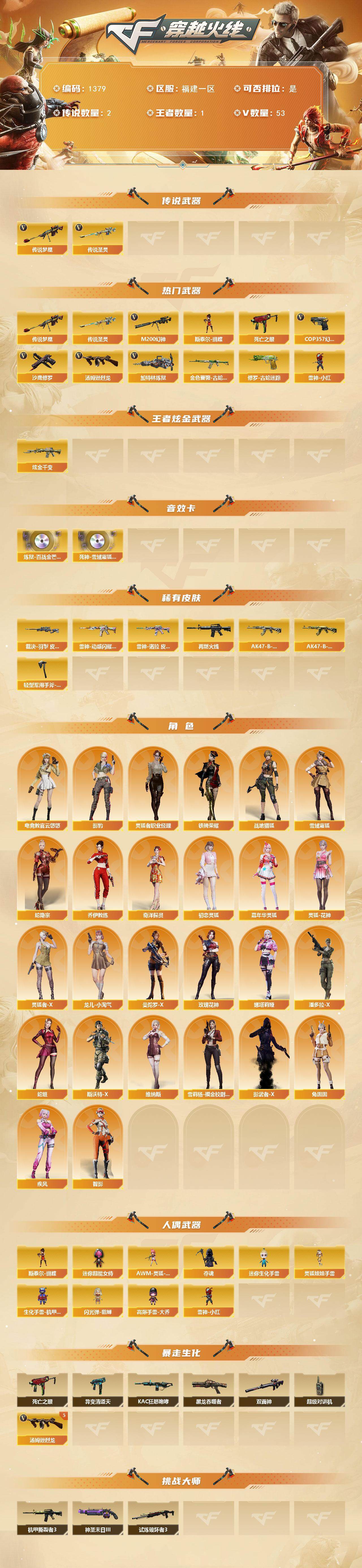 [15578722]福建一区-53V-1王者-1炫金 【传说武器】:传说圣灵,传说梦魇 【热门武器】:传说梦魇,传说圣灵,M200-幻神,金色蔷薇-古蛇迷踪,修罗-古蛇迷踪,死亡之眼,汤姆逊-烈龙*5,加特林-炼狱,斯泰尔-蝴蝶,雷神-小红,COP 357-幻灵,沙鹰-修罗*2 【王者炫金武器】:炫金千变 【音效卡】:炼狱-百战金芒-庆典舞曲音效卡,死神-雪域霜狐-怀旧音效卡 【皮肤】:裁决-羽掣 皮肤,雷神-动感闪耀 皮肤,雷神-诺拉 皮肤,M4A1-再燃火线,AK47-B-常胜将军-刘备,AK47-B-常胜将军-孙权,轻型军用手斧-再燃火线 【角色】:影豹,电竞教官-云悠悠,战地猎狐,雪域霜狐,蛇隐宗,奇洋探员,乔伊教练,初恋灵狐,嘉年华灵狐,疾风,灵狐-花神,灵狐者-X,灵狐者-职业经理,龙儿-小淘气,曼陀罗-X,玫瑰花神,娜塔莉娅,潘多拉-X,蛇姬,斯沃特-X,铁骑荣耀,兔囡囡,维纳斯,雪莉杨-摸金校尉,影武者-X,智影 【人偶武器】:雷神-小红,斯泰尔-蝴蝶,AWM-灵狐-15周年嘉年华,夺魂*2,迷你生化手雷*2,生化手雷-机甲核心*4,闪光弹-貂蝉,高爆手雷-大乔,迷你超能女侍,灵狐娃娃手雷*2 【暴走生化】:异变清道夫,KAC-狂怒咆哮,黑龙吞噬者,双面神,死亡之眼,超级对讲机 【挑战大师】:机甲撕裂者III,试炼破坏者III,神圣爆裂者-末日III 【英雄级武器】:AK47-火麒麟,M4A1-幻灵,无影-神兵利器,金色蔷薇-古蛇迷踪,死神-雪域霜狐,烈火-动感闪耀,AK47-B-常胜将军,M200-幻神,加特林-炼狱,炼狱-百战金芒,汤姆逊-烈龙*5,沙鹰-修罗*2,COP 357-幻灵,柯尔特-竞技荣光,天神-动感闪耀,修罗-古蛇迷踪,屠龙,幻灵之锋*2,屠龙-动感闪耀,麒麟刺-百战金芒,王者之击-觉醒版,高爆手雷-幻灵*6,手雷-动感闪耀,高爆手雷-古蛇迷踪,闪光弹-幻灵*7,烟雾弹-幻灵*6,烟雾弹-古蛇迷踪,M4A1-赤狱骑士 【道具】:BS战队炫彩背包,Q9战队炫彩背包,亚洲杯纪念炫彩背包,冰冰企鹅背包-猛男专用,古蛇迷踪炫彩背包,奇洋探员-海龟背包,百战金芒炫彩背包,超级背包,雪域霜狐炫彩背包,女皇终结者-魔龙之吻,救世主-黑桃战神,黄金生化钩,绿色巨人,灵魂忍者*2,变异宝贝,迷雾幽灵*2,生化弹匣,夺命之镰*2,防化服*3,金色流光-枪王排位*2,星