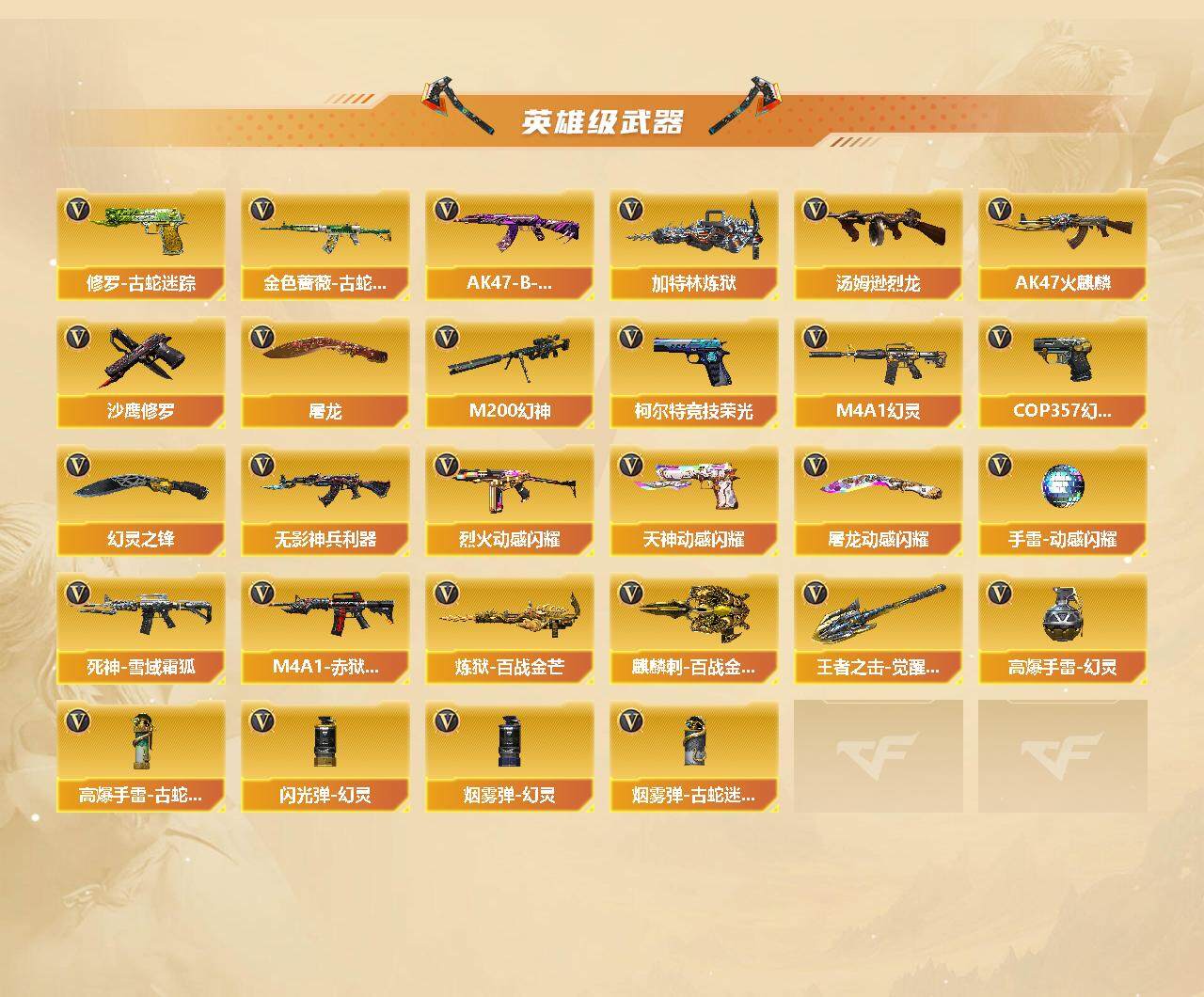 【英雄级武器】:AK47-火麒麟,M4A1-幻灵,无影-神兵利器,金色蔷薇-古蛇迷踪,死神-雪域霜狐,烈火-动感闪耀,AK47-B-常胜将军,M200-幻神,加特林-炼狱,炼狱-百战金芒,汤姆逊-烈龙*5,沙鹰-修罗*2,COP 357-幻灵,柯尔特-竞技荣光,天神-动感闪耀,修罗-古蛇迷踪,屠龙,幻灵之锋*2,屠龙-动感闪耀,麒麟刺-百战金芒,王者之击-觉醒版,高爆手雷-幻灵*6,手雷-动感闪耀,高爆手雷-古蛇迷踪,闪光弹-幻灵*7,烟雾弹-幻灵*6,烟雾弹-古蛇迷踪,M4A1-赤狱骑士