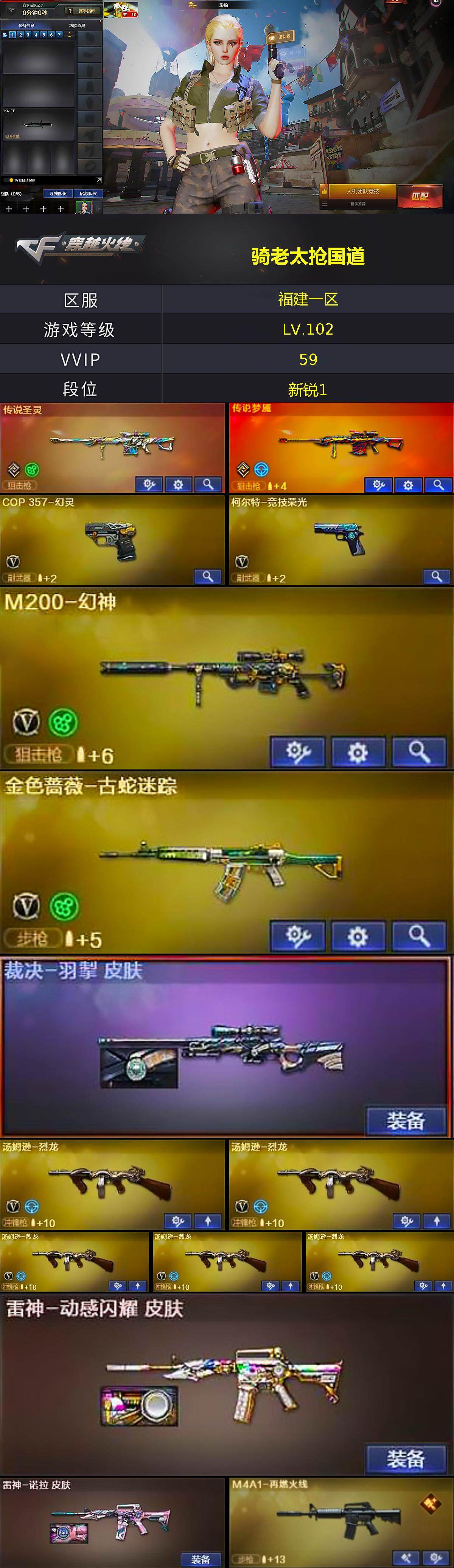 【热门武器】:传说梦魇,传说圣灵,M200-幻神,金色蔷薇-古蛇迷踪,修罗-古蛇迷踪,死亡之眼,汤姆逊-烈龙*5,加特林-炼狱,斯泰尔-蝴蝶,雷神-小红,COP 357-幻灵,沙鹰-修罗*2