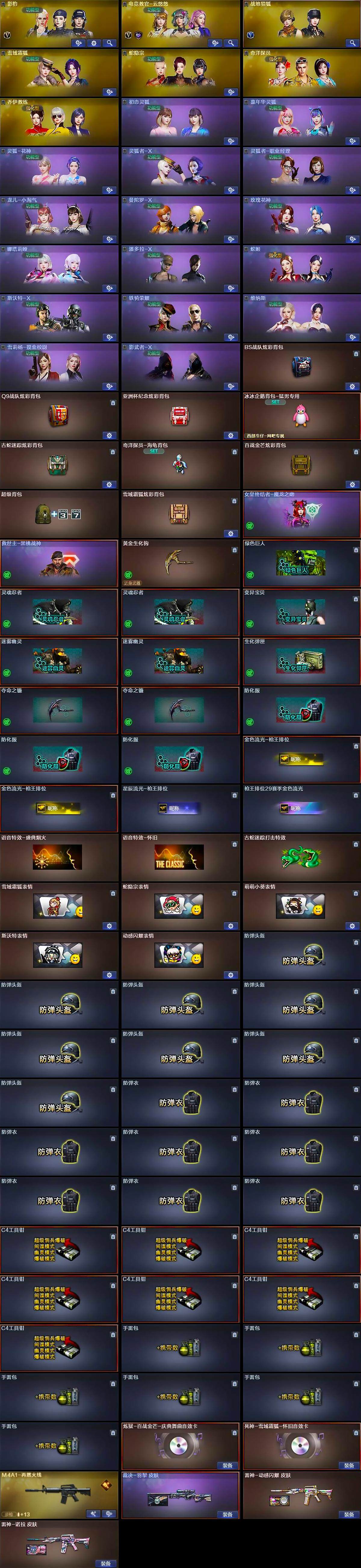 【道具】:BS战队炫彩背包,Q9战队炫彩背包,亚洲杯纪念炫彩背包,冰冰企鹅背包-猛男专用,古蛇迷踪炫彩背包,奇洋探员-海龟背包,百战金芒炫彩背包,超级背包,雪域霜狐炫彩背包,女皇终结者-魔龙之吻,救世主-黑桃战神,黄金生化钩,绿色巨人,灵魂忍者*2,变异宝贝,迷雾幽灵*2,生化弹匣,夺命之镰*2,防化服*3,金色流光-枪王排位*2,星