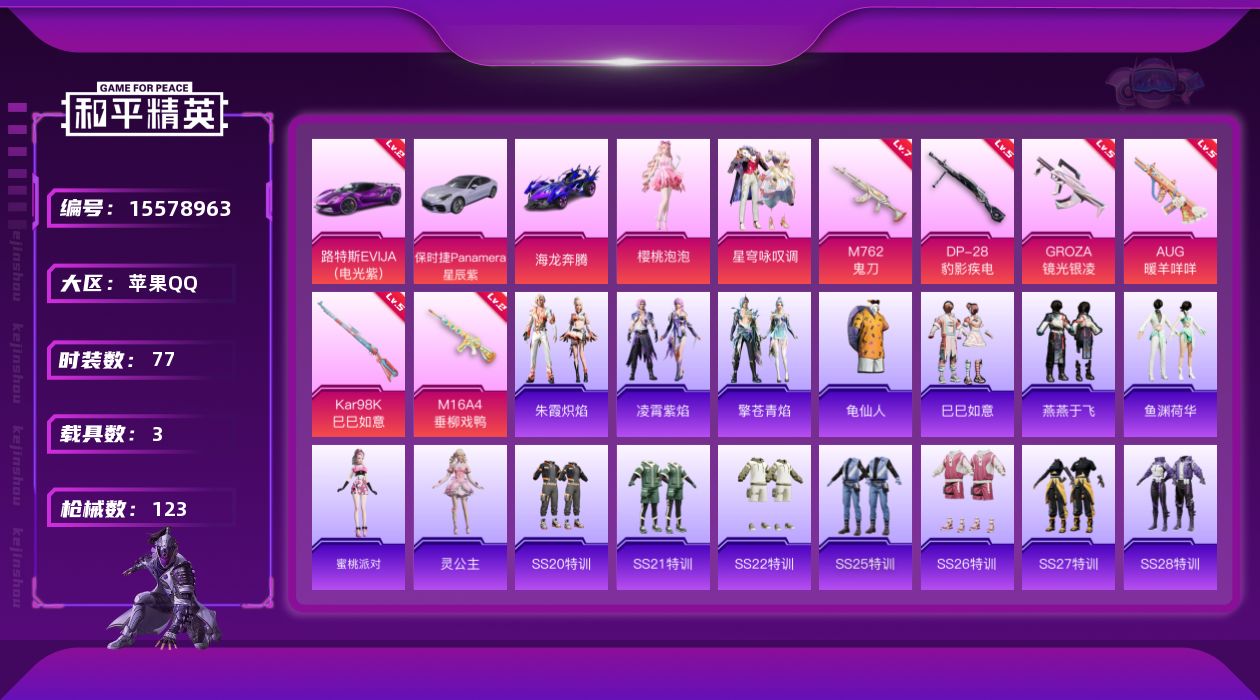 [15578963]【特价出售/店主推荐】苹果 手Q-2粉装-6特效枪-3载具-0粉色飞行器-43273热力值-10王牌印记-77套装-123枪皮【红色载具】:路特斯EVIJA(电光紫)(二级)【热门品类】:套装-龟仙人【粉色套装】:角色-樱桃泡泡,粉装-星穹咏叹【粉色枪皮等级】:M16A4-垂柳戏鸭(二级),GROZA-镜光银凌(五级),AUG-暖羊咩咩(五级),M762-鬼刀(七级),Kar98K-巳巳如意(五级),DP-28-豹影疾电(五级)【粉色载具】:路特斯EVIJA(电光紫),保时捷Panamera(星辰紫),海龙奔腾【粉色枪皮】:M16A4-垂柳戏鸭,GROZA-镜光银凌,AUG-暖羊咩咩,M762-鬼刀,Kar98K-巳巳如意,DP-28-豹影疾电