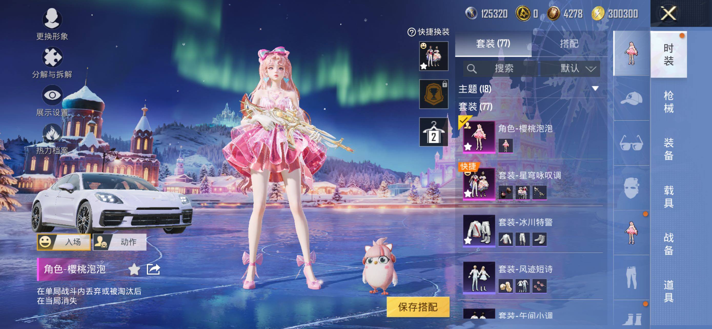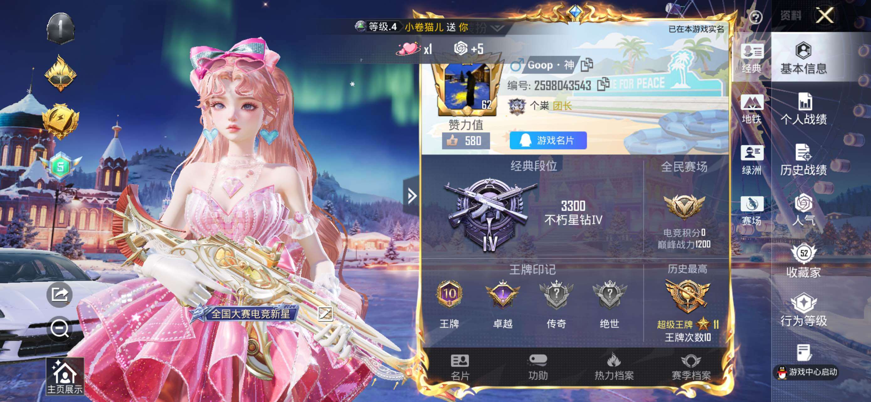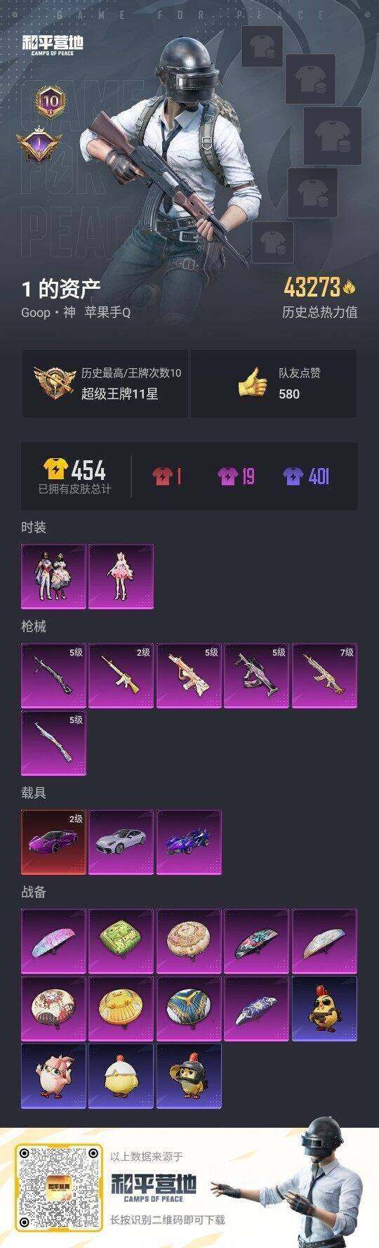 - [11833373]22粉装 8特效枪 4载具 2印记 可二次 可修改实名 女号 安全保护中 身法装备:暗影哥特(红眼罩),2号机款机体服(红螳螂) 优质装备:2号机款机体服(红螳螂),兰博基尼Estoque(银翼灰),兰博基尼Aventador SVJ(翡翠绿),兰博基尼URUS(明艳黄),路特斯ELETRE(花绽灰),香水柠檬,彗云及圣,炙焰红王,冰霜白皇,M416风花雪月,GROZA焦糖拿铁,SCAR-L青春物语,M762冷魅冰骑,Kar98K圣光天使,Vector环太平洋,SCAR-L纯梦嫁纱,MG3梦幻舞会,七级M416-风花雪月 热门装扮:飓风飞鹰,吟月归客,紫电风暴,赤焰黑爵,冷魅冰骑,圣光天使,霞光圣骑,寒光使者,复仇流浪者,星夜魔法师,纯珍童话,挚爱序曲,心之回忆,第五大道,超级赛亚人孙悟空,呆萌星弥,小可学妹,激萌罗小黑,迅捷狂鲨,呆萌铁蟹,梦魇先生,爱崽白熊,深海小丑鱼,好奇恐龙 五级特效枪:五级MG3-梦幻舞会,五级SCAR-L-纯梦嫁纱,五级GROZA-焦糖拿铁,五级M762-冷魅冰骑,五级Kar98K-圣光天使 二级特效枪:二级Vector-环太平洋 一级特效枪:一级SCAR-L-青春物语 紫色装扮:SS22特训,莱茵河畔,SS23特训,幻彩翩翩,妙红点点,香榭午后,龙舌兰冰茶,银杏天影,娇憨猪猪,萌趣咩咩,SS21特训,SS20特训,冰爽海盐,零款战斗服,猎梦纪元,飞驰魅影,音速流光,军刀雅典娜,英勇保护者,粉团憨憨,醇脆可可,浑天鲲鹏,覆海蛟龙,甜心亚梦,虚音幻奏,浓情摩卡,薰款战斗服,魔力冰咖,长空猛禽,雪山精英,耀眼新星,荣耀,荧惑魅影,街头潮人,飞行日记,鹤鸣,麻辣教官,龟仙人,柠萌假日,涂山之恋,幻世战舞者,探宝勇士,疯狂小兔子,白熊同盟,神秘领域,竞技达人朋克,甜蜜熊情侣,牛气冲天,炫蓝之夏,牛气满满,特战装甲,达芬奇,玉兔迎春,竞技名士,暗影哥特(红眼罩),神气柴柴,懵萌河马,SS24特训(SS24特训套装),萤火魅影(套装-荧惑魅影),Alan Walker,浪漫天命,小丑鱼,银河圣歌,智慧之神,金耀舞者,弄潮海豚,光之冒险 优质战备:冷魅冰骑降落伞,忍者神龟降落伞,炙焰牛王降落伞,筑梦精灵降落伞,星夜魔法师降落伞,飞行翼-星夜魔法师,圣光天使降落伞,飞行器-圣光天使,环太平洋降落伞,飞行器-冷魅冰骑,白勺歌姬降落伞,第五大道降落伞