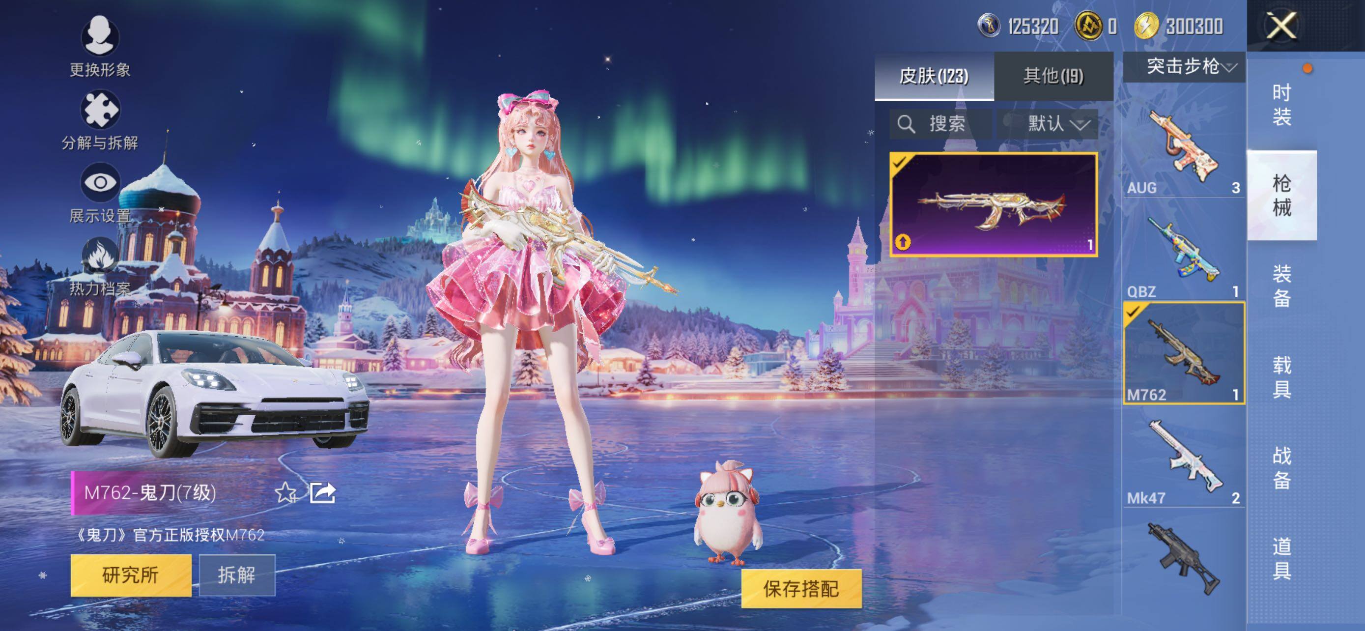 M16A4-垂柳戏鸭,GROZA-镜光银凌,AUG-暖羊咩咩,M762-鬼刀,Kar98K-巳巳如意