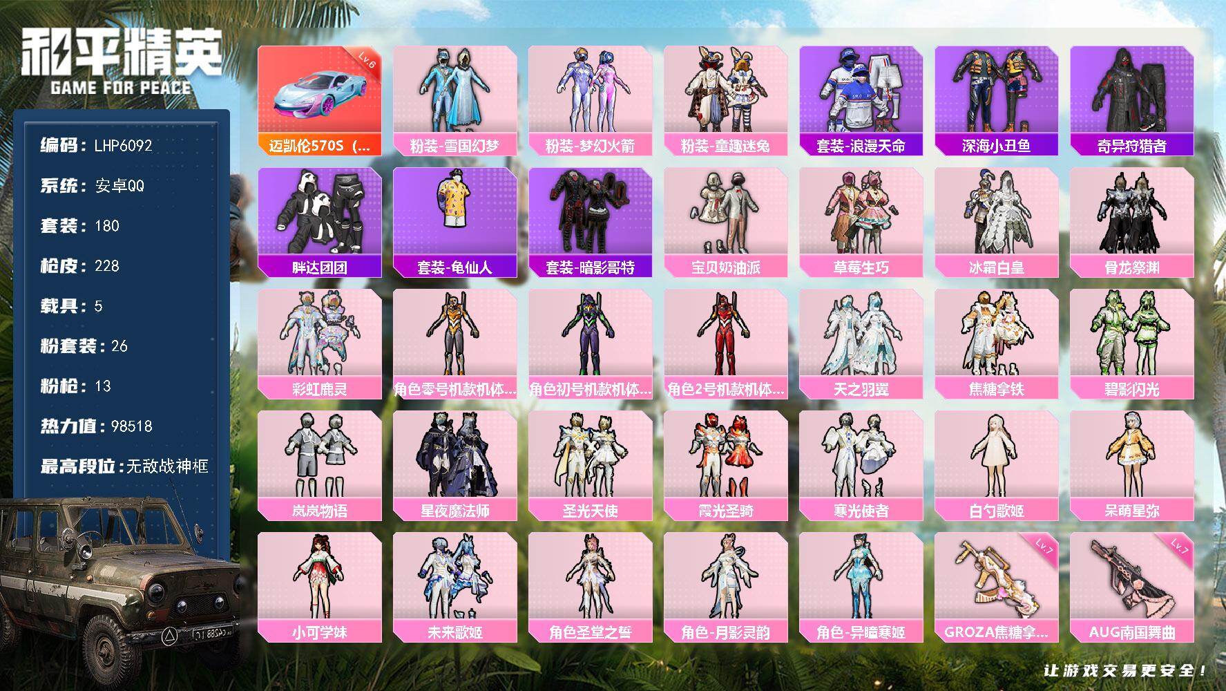 [15579077]【特价出售/店主推荐】安卓 手Q-无敌战神框-26粉装-13特效枪-5载具-6粉色飞行器-98518热力值-13王牌印记-180套装-228枪皮【红色载具】:迈凯伦570S(炫冰蓝)(六级)【热门品类】:粉装-雪国幻梦,粉装-梦幻火箭,粉装-童趣迷兔,套装-浪漫天命,套装-深海小丑鱼,套装-奇异狩猎者,套装-胖达团团,套装-龟仙人,套装-暗影哥特【粉色套装】:粉装-宝贝奶油派,粉装-雪国幻梦,粉装-梦幻火箭,粉装-草莓生巧,粉装-冰霜白皇,粉装-童趣迷兔,粉装-骨龙祭渊,粉装-彩虹鹿灵,角色-零号机款机体服,角色-初号机款机体服,角色-2号机款机体服,粉装-天之羽翼,粉装-焦糖拿铁,粉装-碧影闪光,粉装-岚岚物语,粉装-星夜魔法师,粉装-圣光天使,粉装-霞光圣骑,粉装-寒光使者,角色-白勺姬,角色-呆萌星弥,角色-小可学妹,粉装-未来歌姬,角色-圣堂之誓,角色-月影灵韵,角色-异瞳寒姬【粉色枪皮等级】:AKM-白勺歌姬(五级),SCAR-L-青春物语(五级),M416-风花雪月(五级),GROZA-焦糖拿铁(七级),AUG-南国舞曲(七级),M762-青锋波束(五级),UMP45-雪国精灵(五级),P90-沙丘之主(三级),Kar98K-巳巳如意(五级),AWM-璀璨巨星(五级),SKS-碧影闪光(二级),SVD-月影灵韵(四级),MG3-梦幻舞会(七级)【粉色载具】:路特斯ELETRE(花绽灰),宾利欧陆GT敞篷(火焰橘),迈凯伦570S(炫冰蓝),Formula E Gen2(巅峰兰),拉轰奶龙龙【粉色枪皮】:AKM-白勺歌姬,SCAR-L-青春物语,M416-风花雪月,GROZA-焦糖拿铁,AUG-南国舞曲,M762-青锋波束,UMP45-雪国精灵,P90-沙丘之主,Kar98K-巳巳如意,AWM-璀璨巨星,SKS-碧影闪光,SVD-月影灵韵,MG3-梦幻舞会【粉色飞行器】:梦幻火箭飞行器,天之羽翼飞行器,星夜魔法师飞行翼,暖熊萌萌飞行器,璀璨巨星飞行器,沙丘之主天马